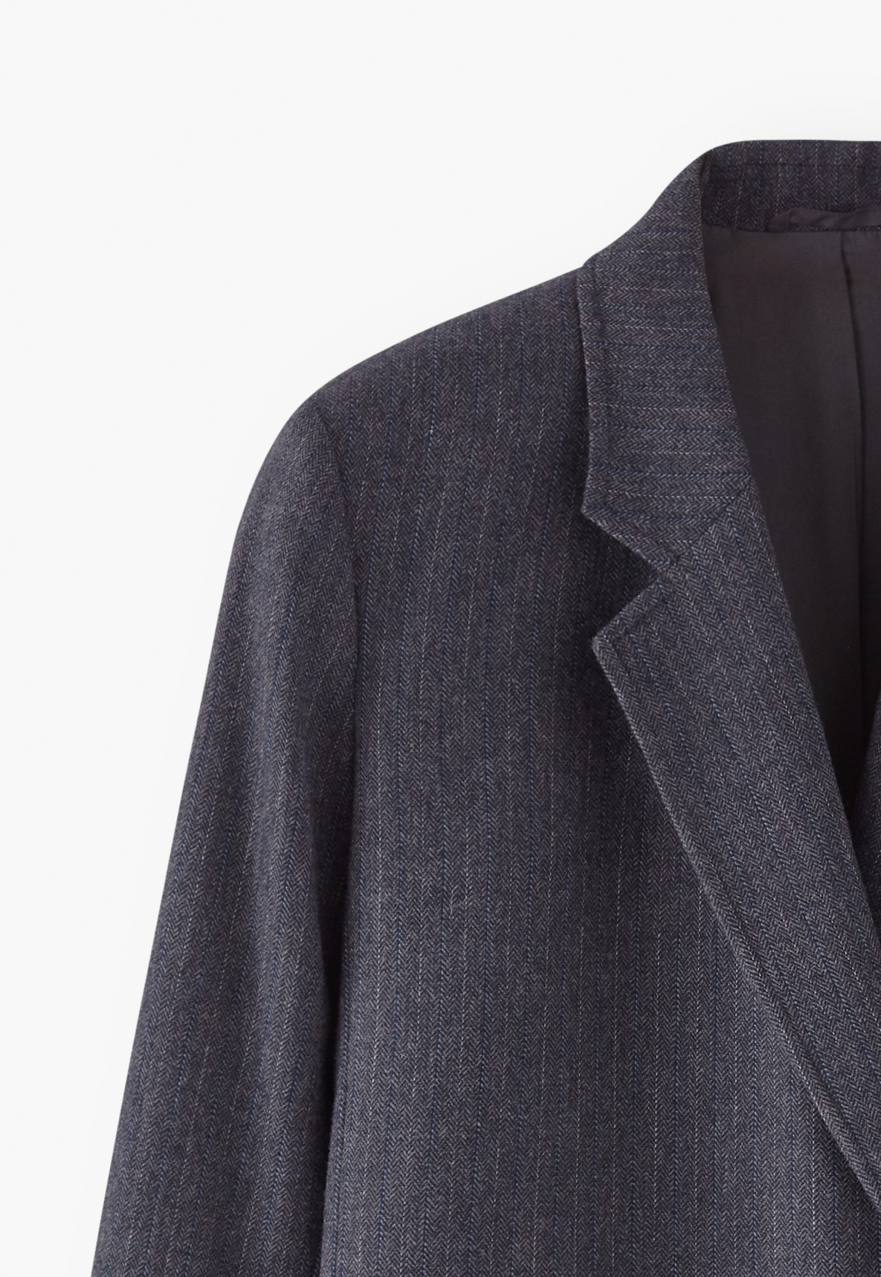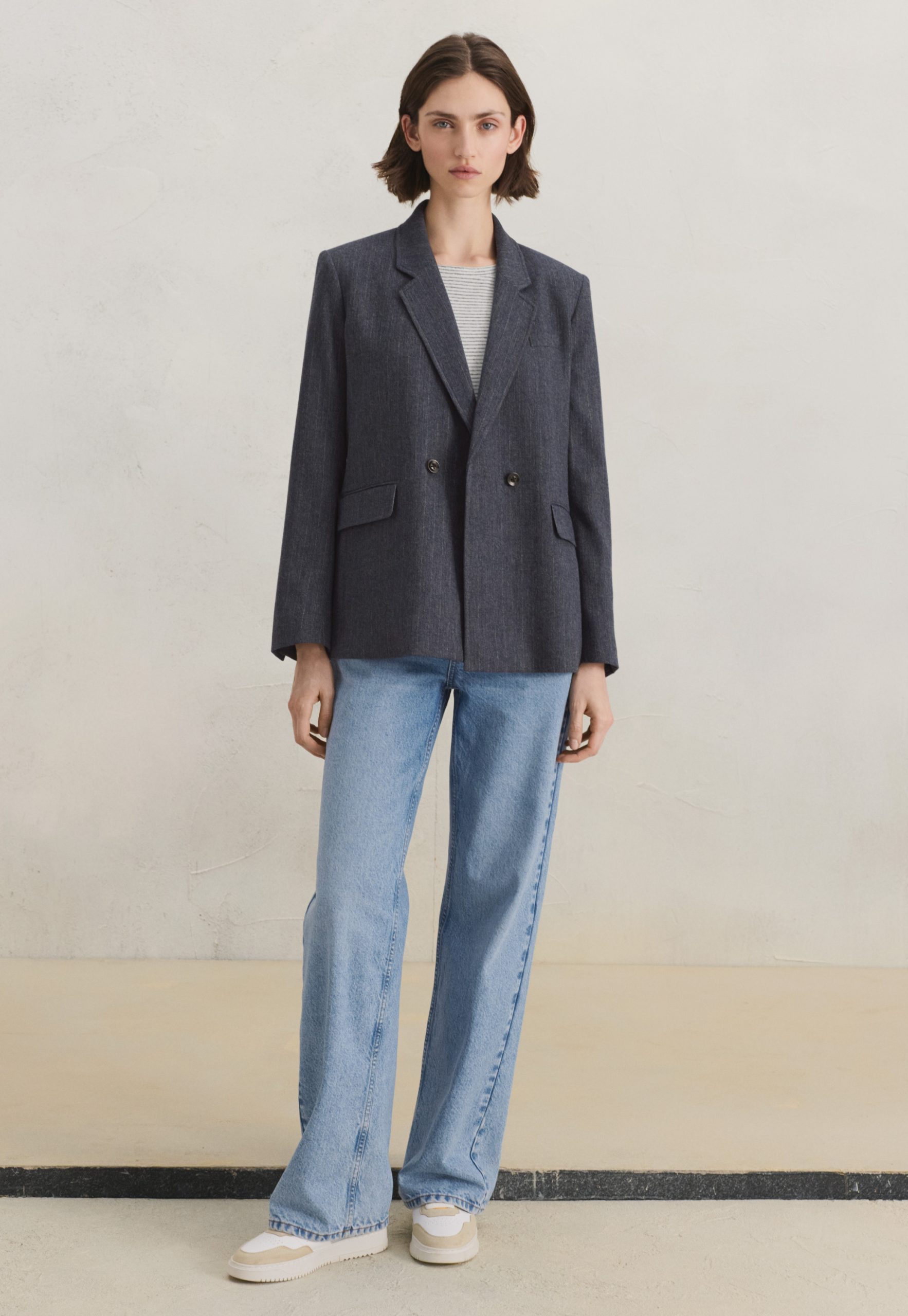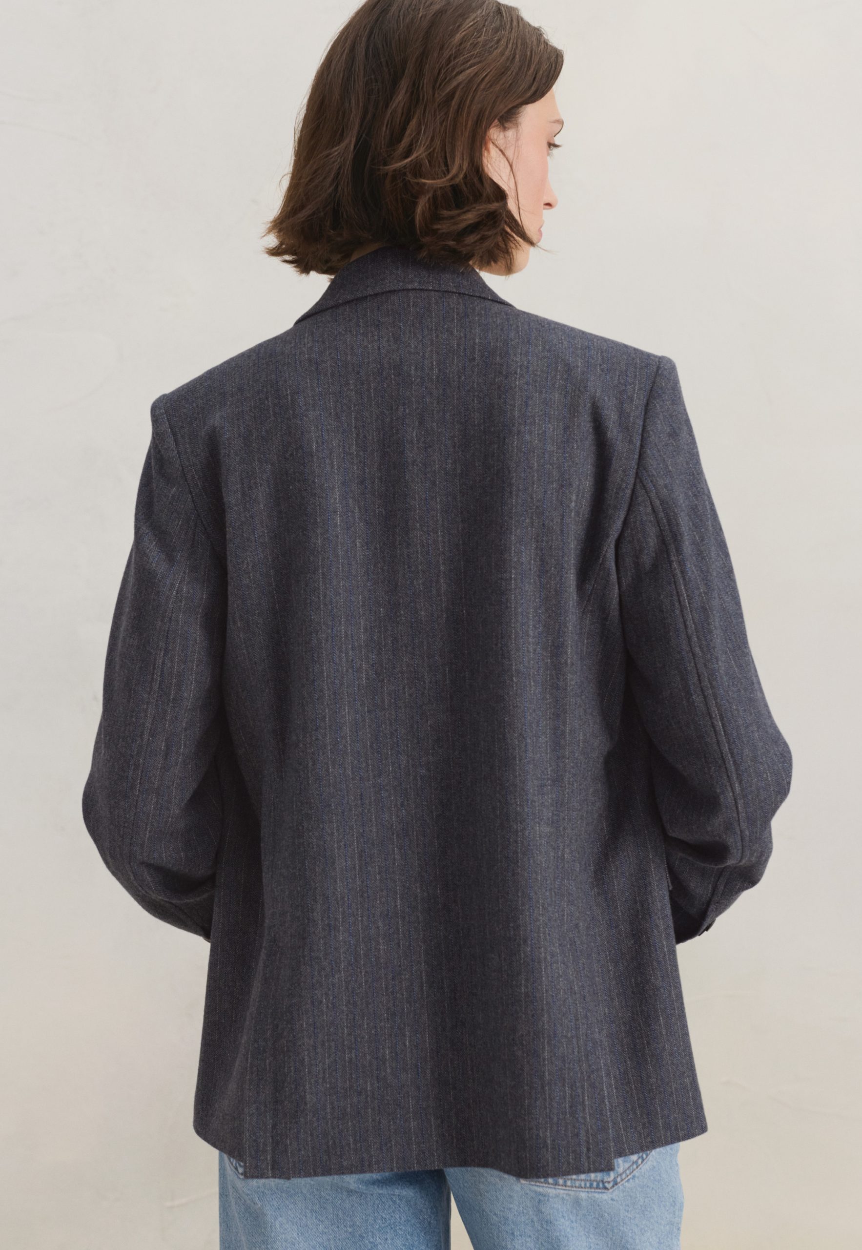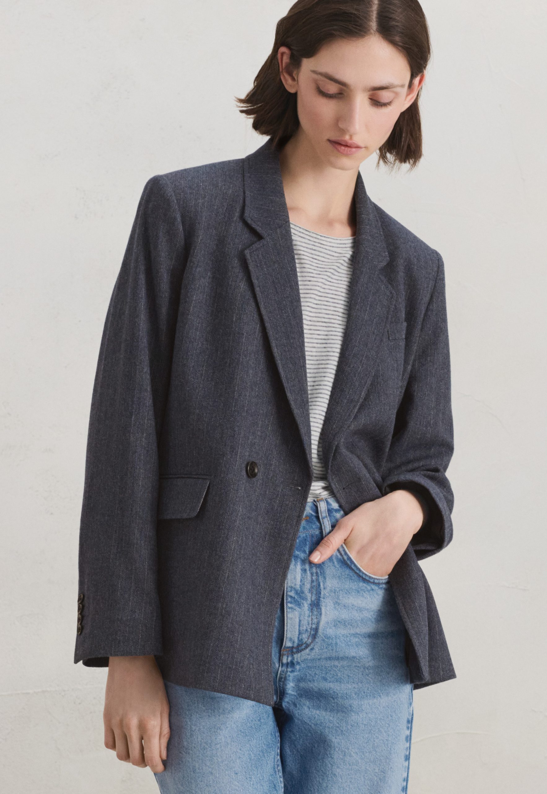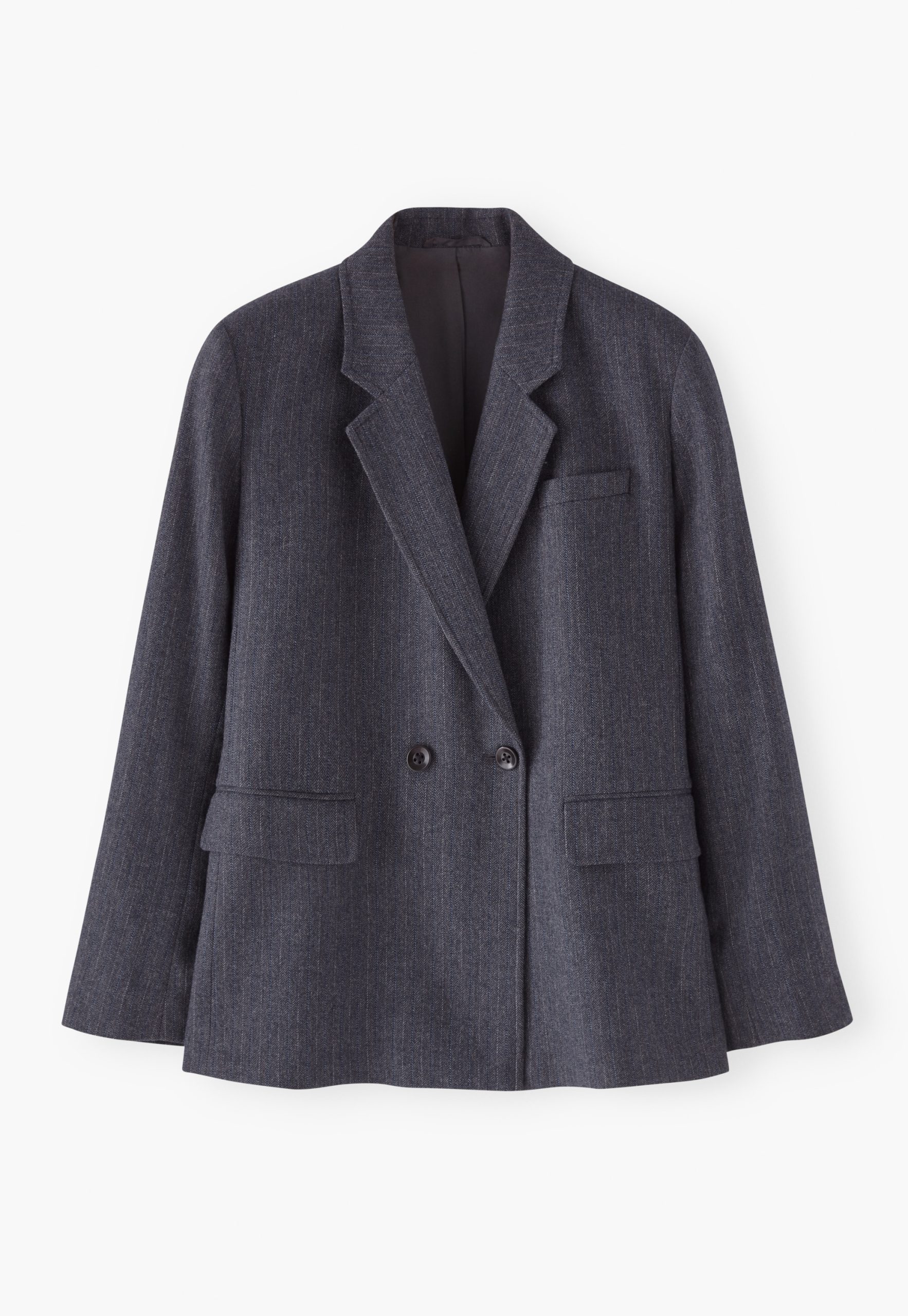 The essential double-breasted blazer in a wool and viscose herringbone weave with a subtle fine stripe. Beautifully tailored in a relaxed, longline fit, it will easily work with your existing wardrobe or pair it with the matching trousers to create a fabulous suit.