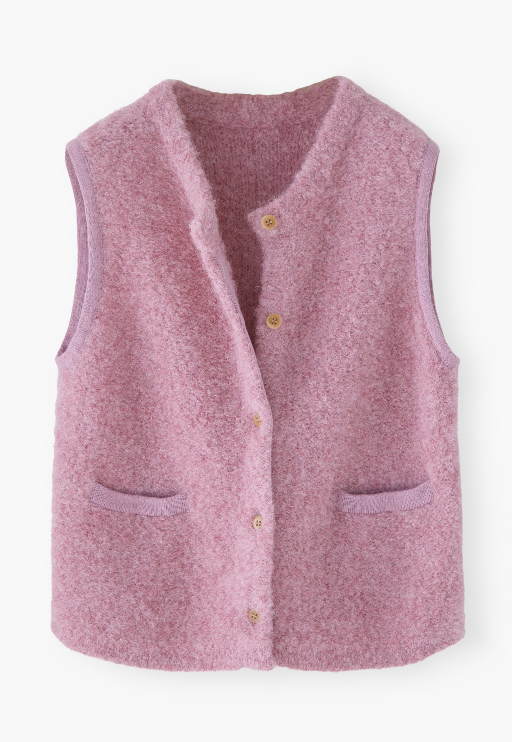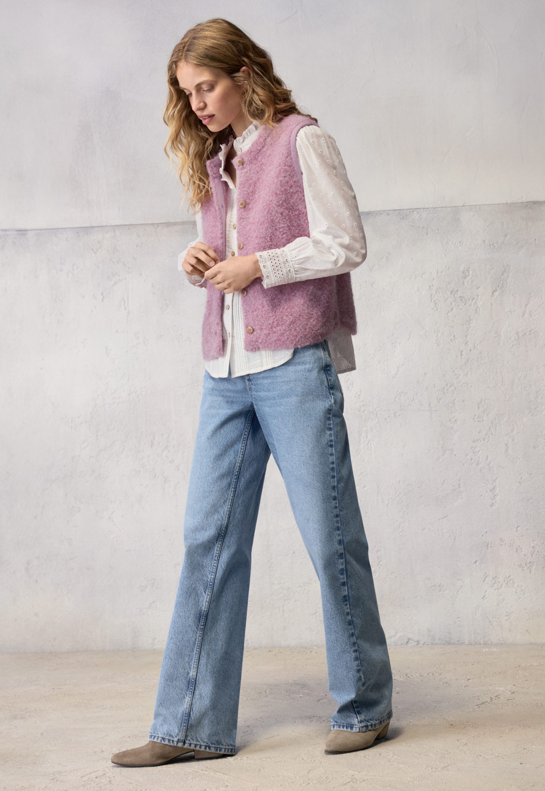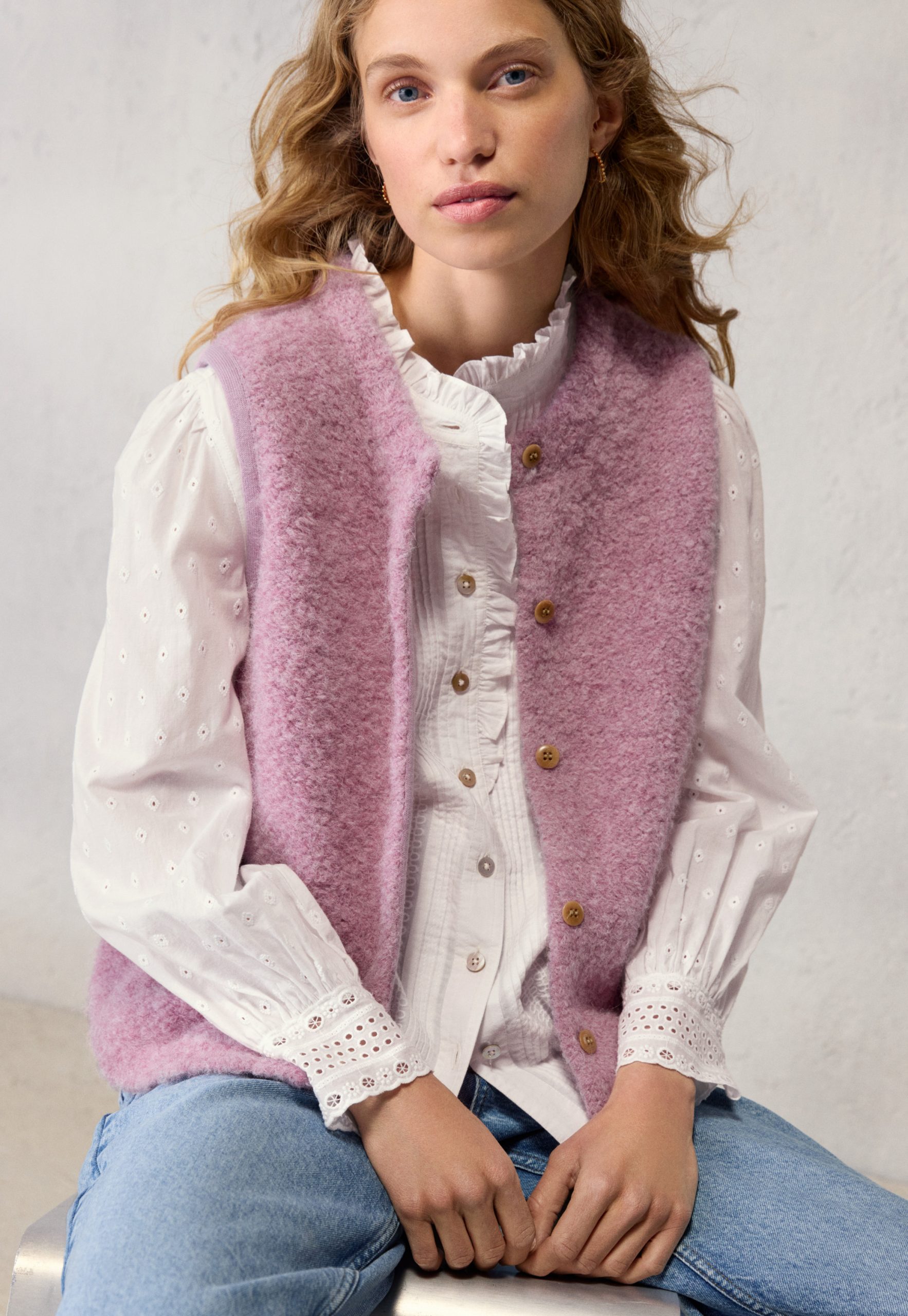 There’s nothing like a knitted gilet for adding a welcome extra layer. Beautifully textured in soft and cosy alpaca bouclé with contrasting trim at the pockets and armholes.