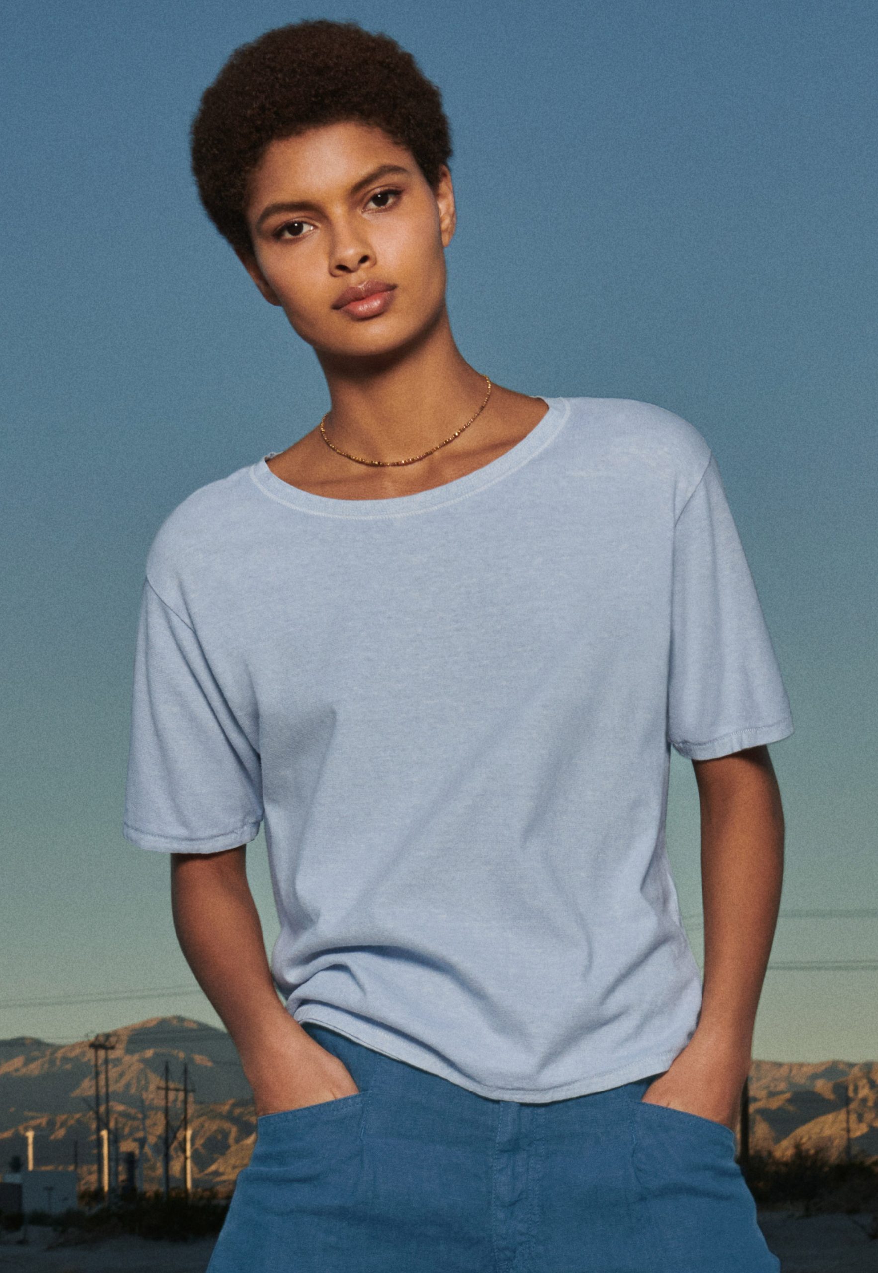 Garment, pigment-dyeing gives this T-shirt a loved and laundered look whilst the hemp and organic cotton mix is soft and cool next to the skin. Stitching around the neck and a raw finish at the hem add detail. Finished with a seam stitched down the centre-back.
