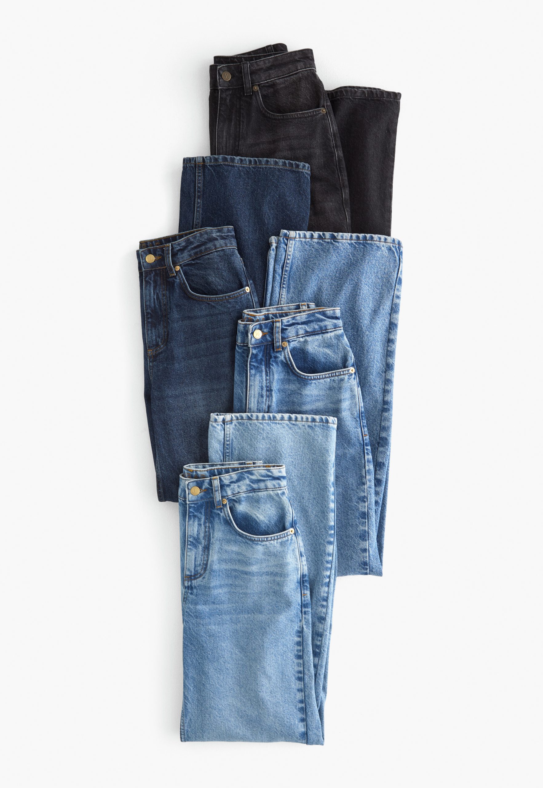 - Rigid denim in blue and black washes