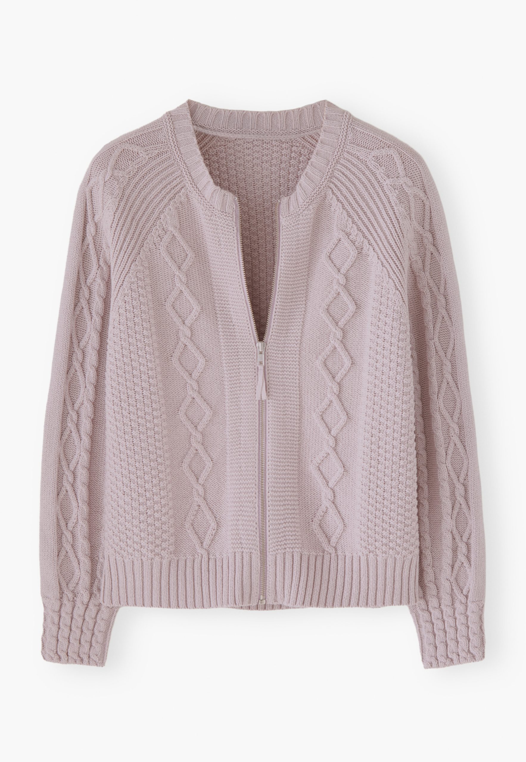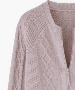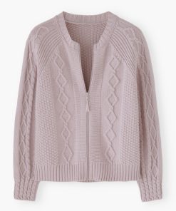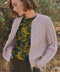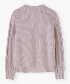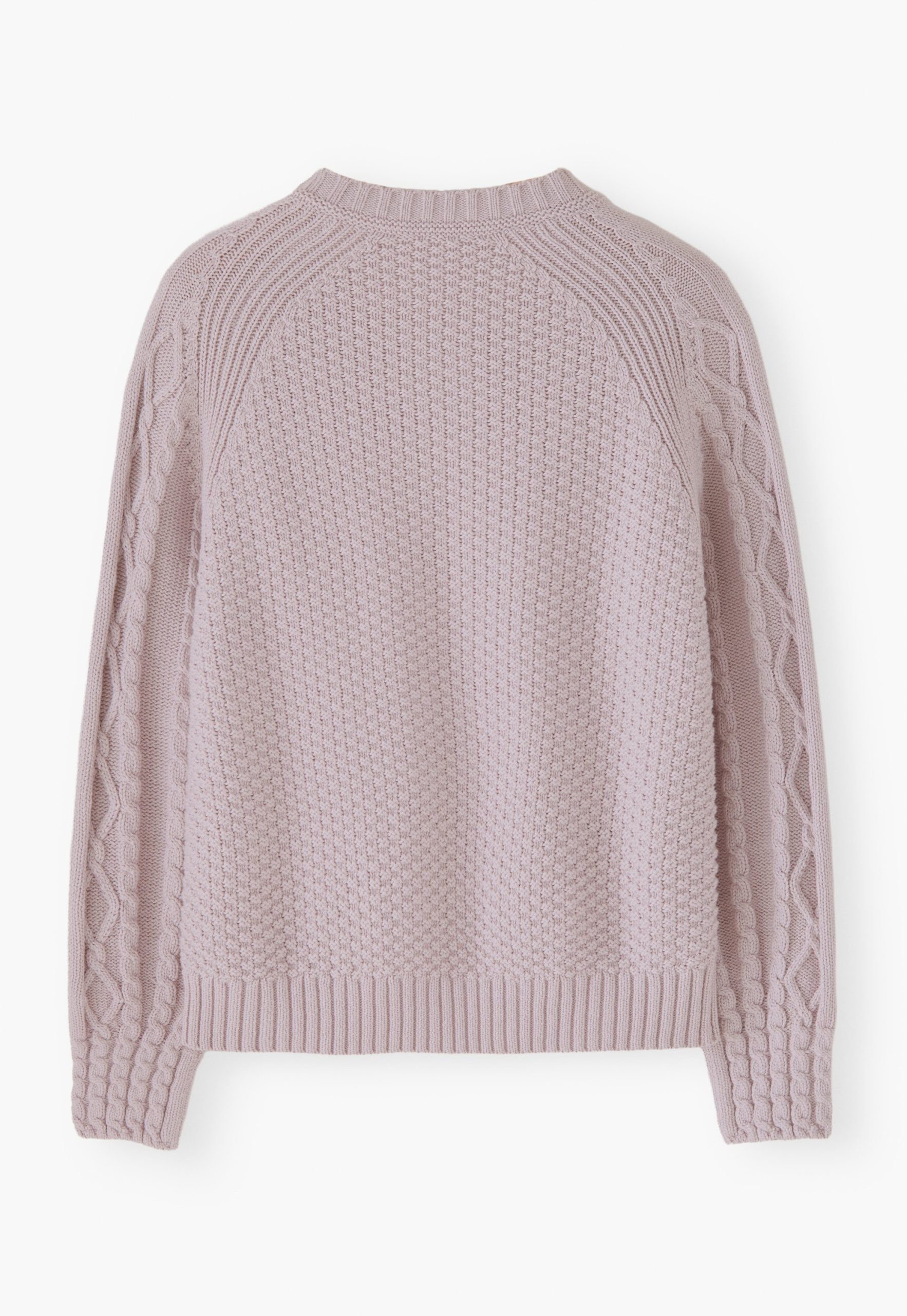 - Cable-stitch detail on front body and sleeves