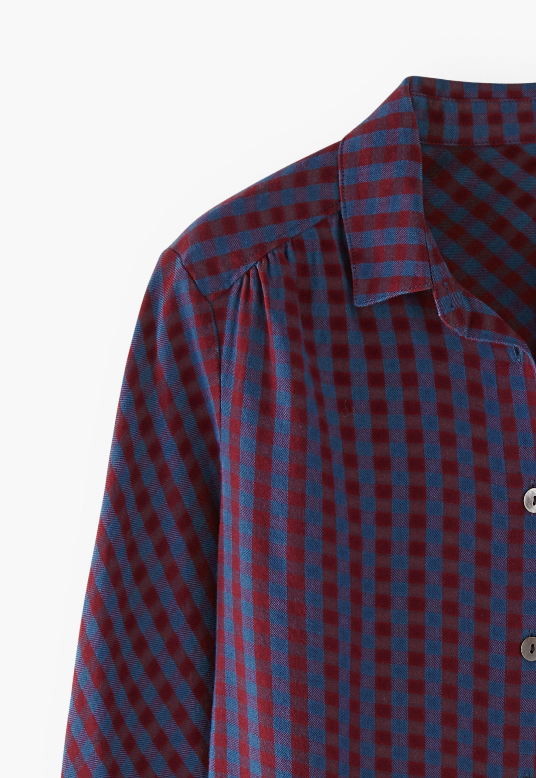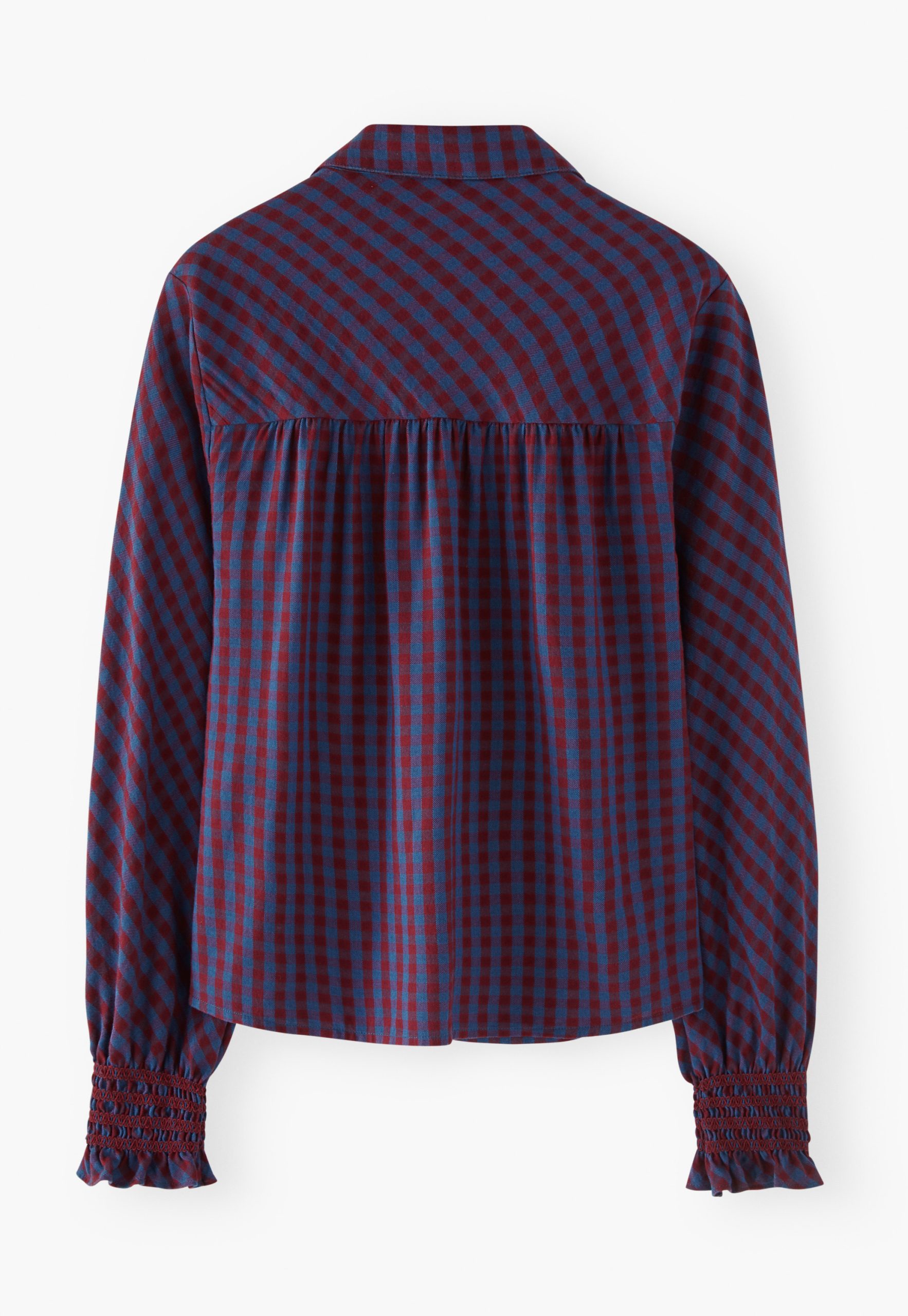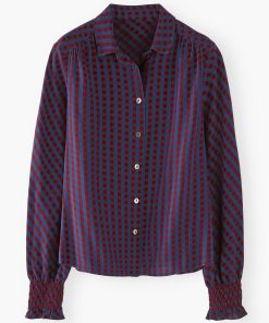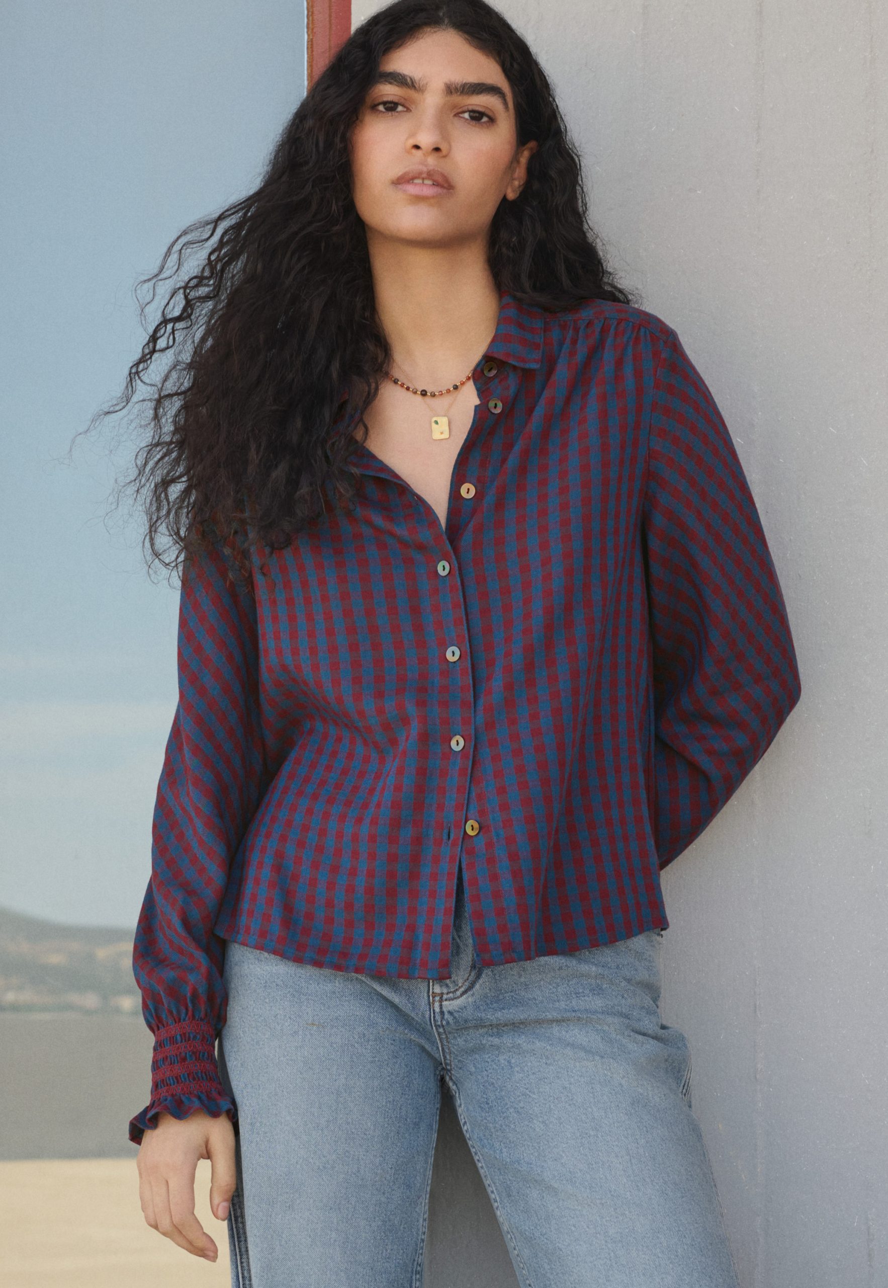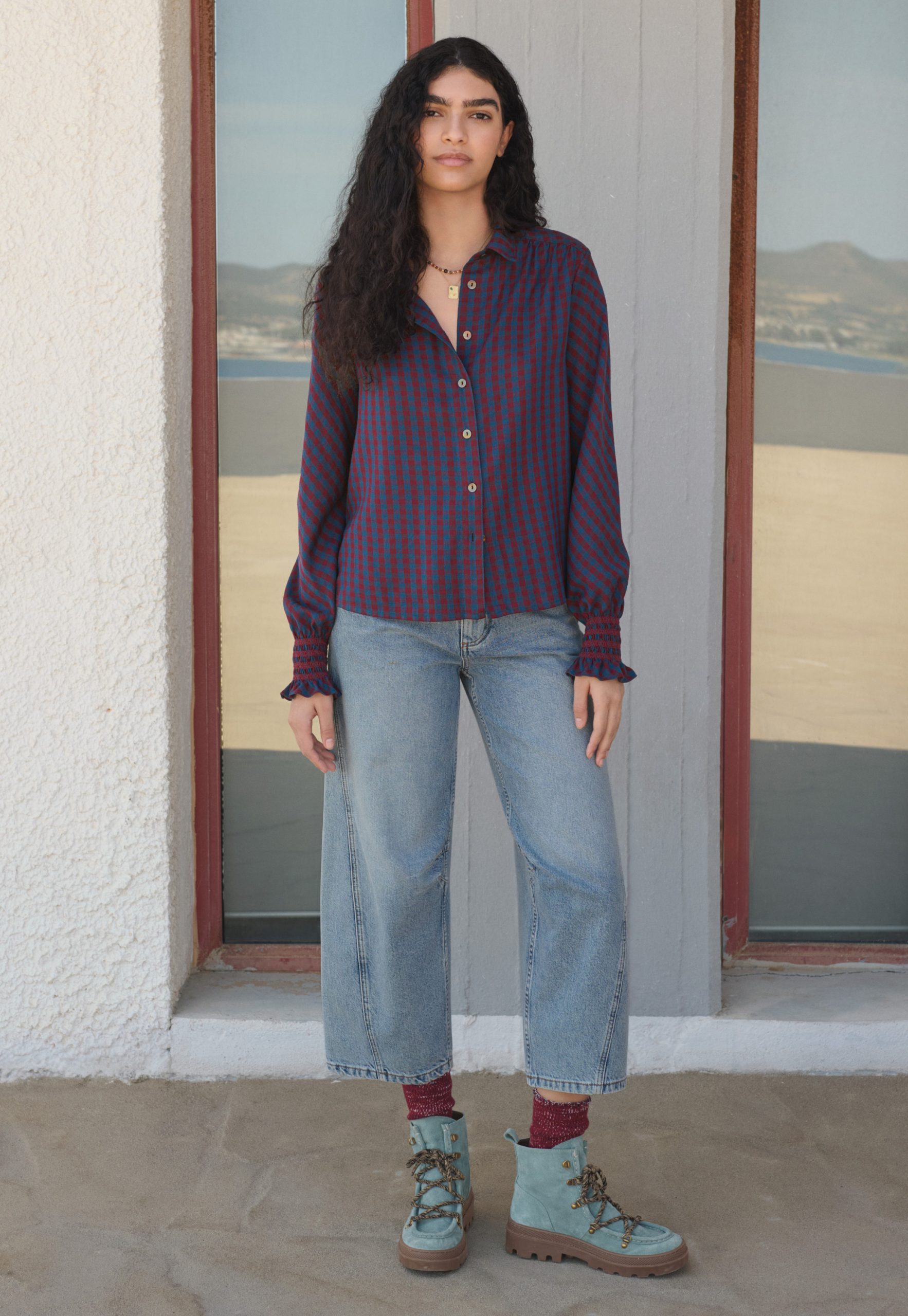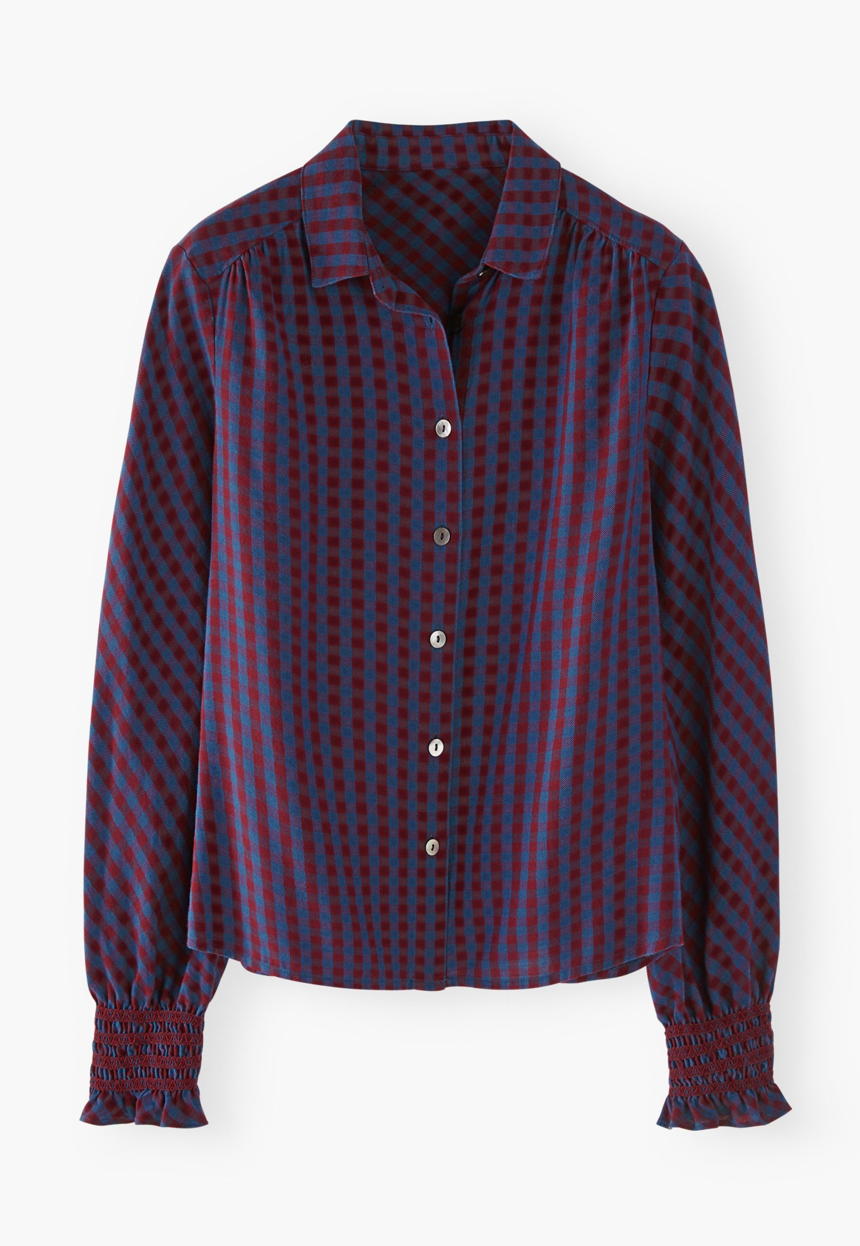 If you’re looking for a soft checked shirt to wear with denim, can we suggest this one? Lovely and lightweight, it has shirring stitching at the cuffs and fastens with iridescent buttons.