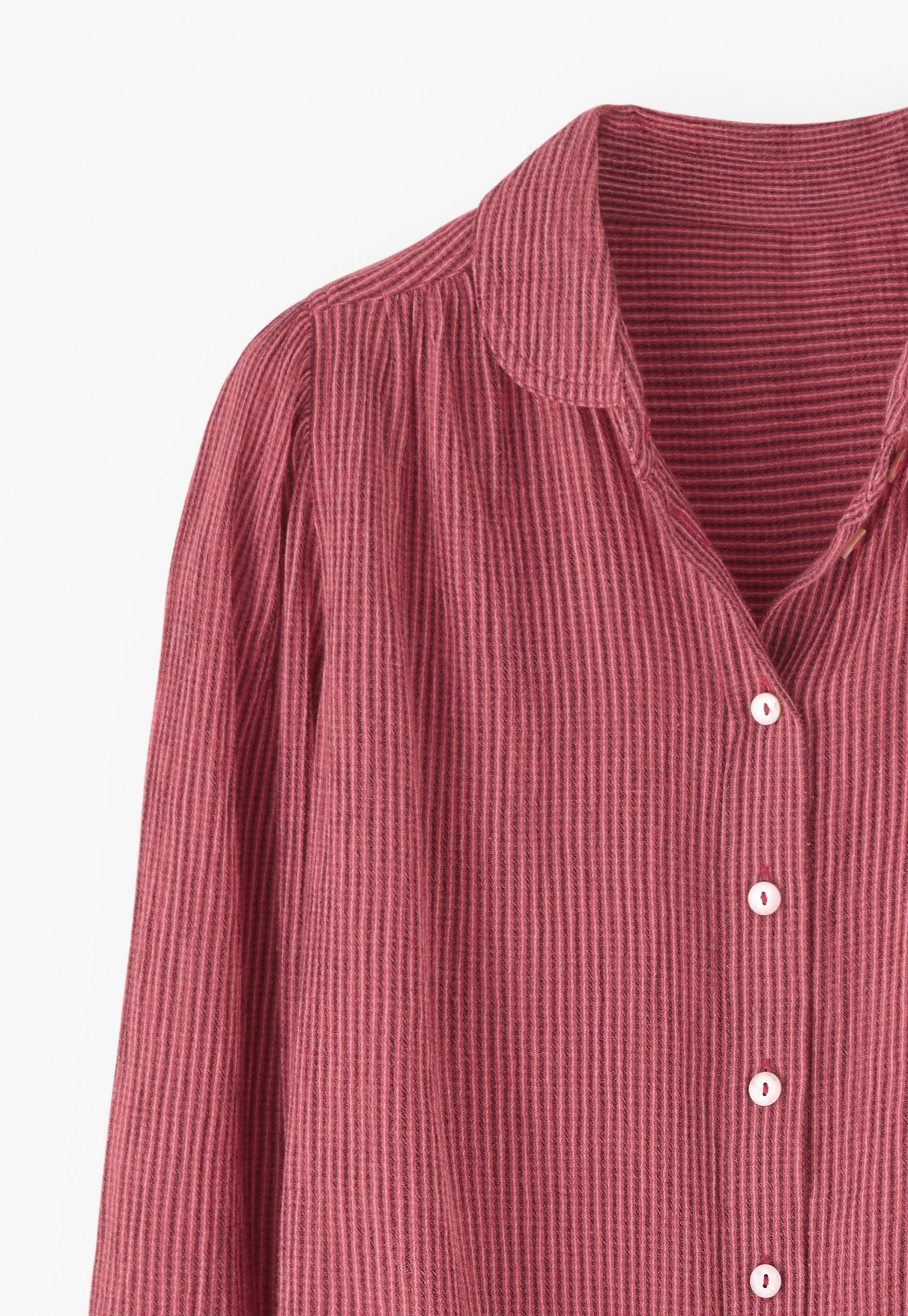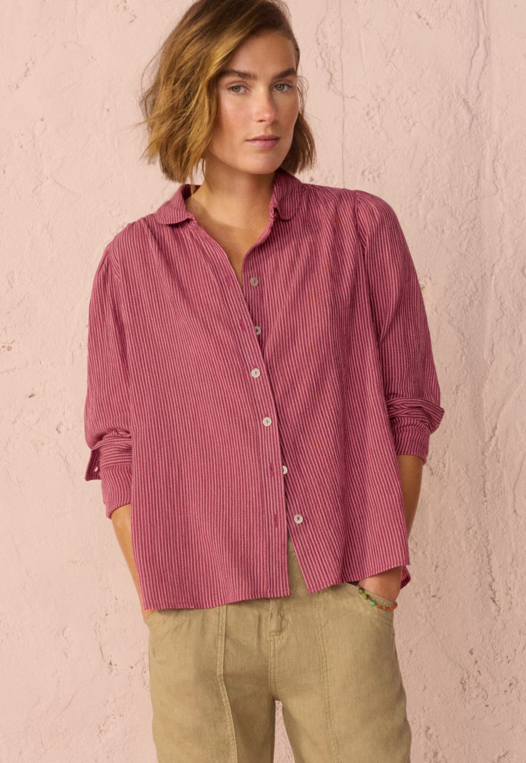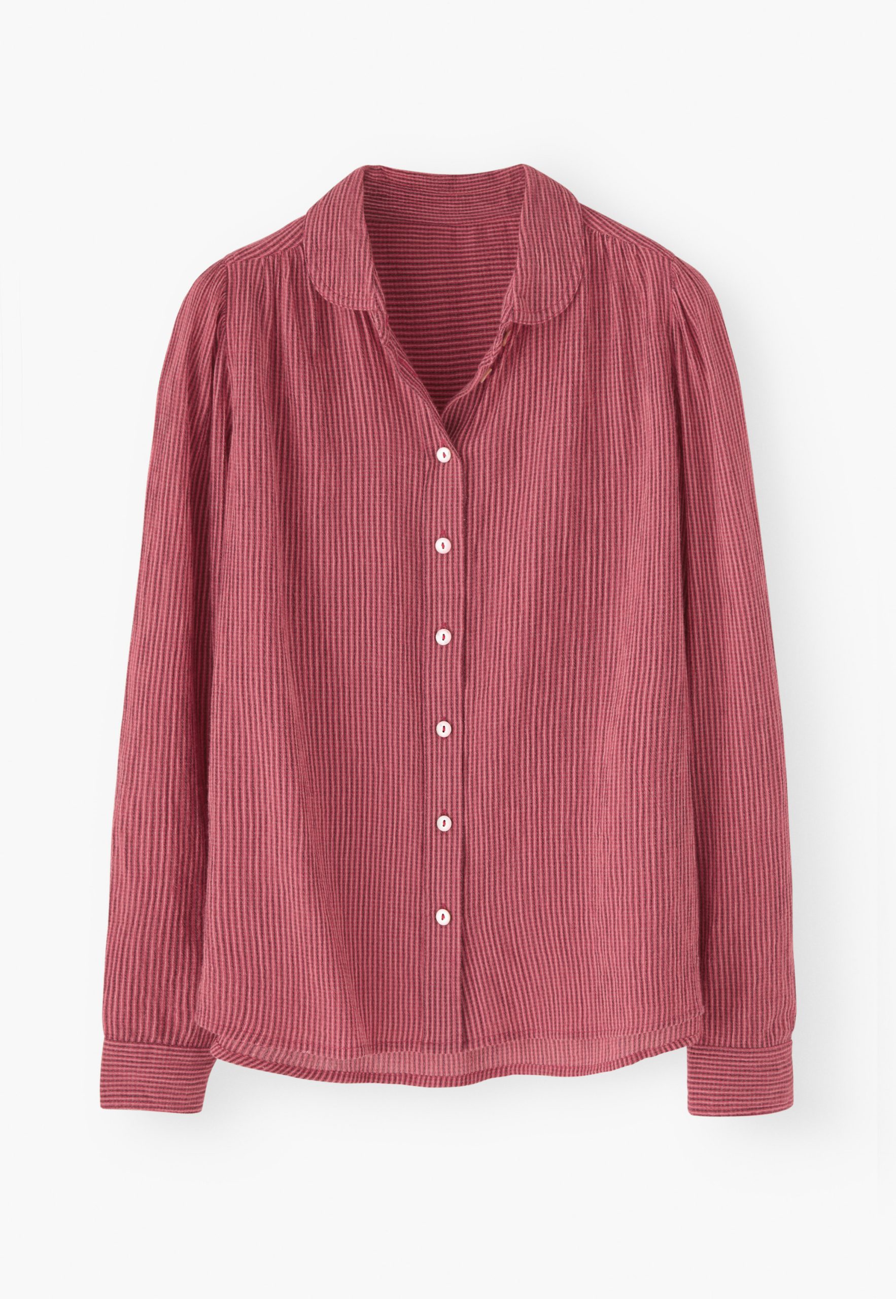 Fine lines feature over lightweight crinkle cotton to create a neat blouse for work or the weekend. With full-length sleeves and a gently curved hem.