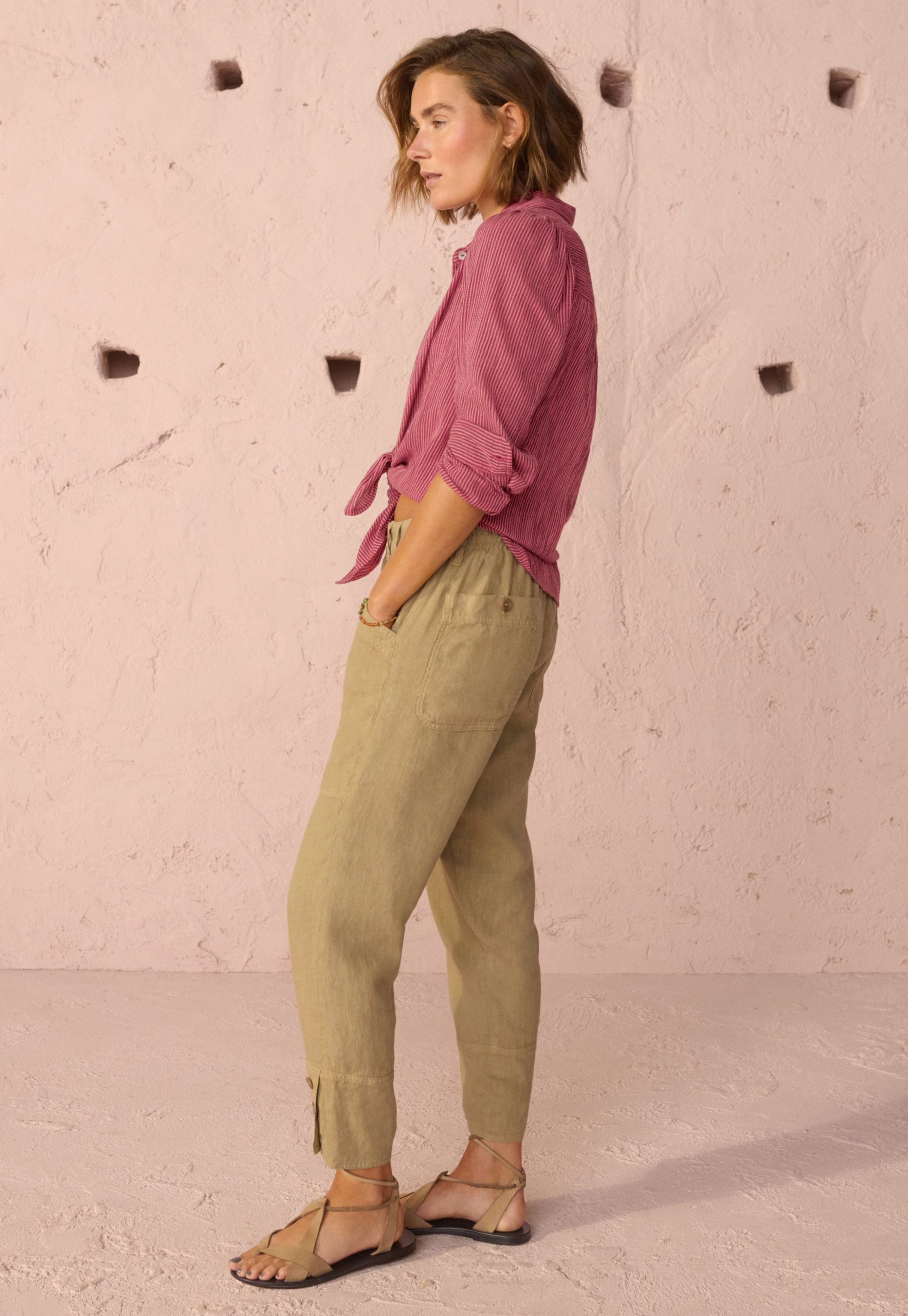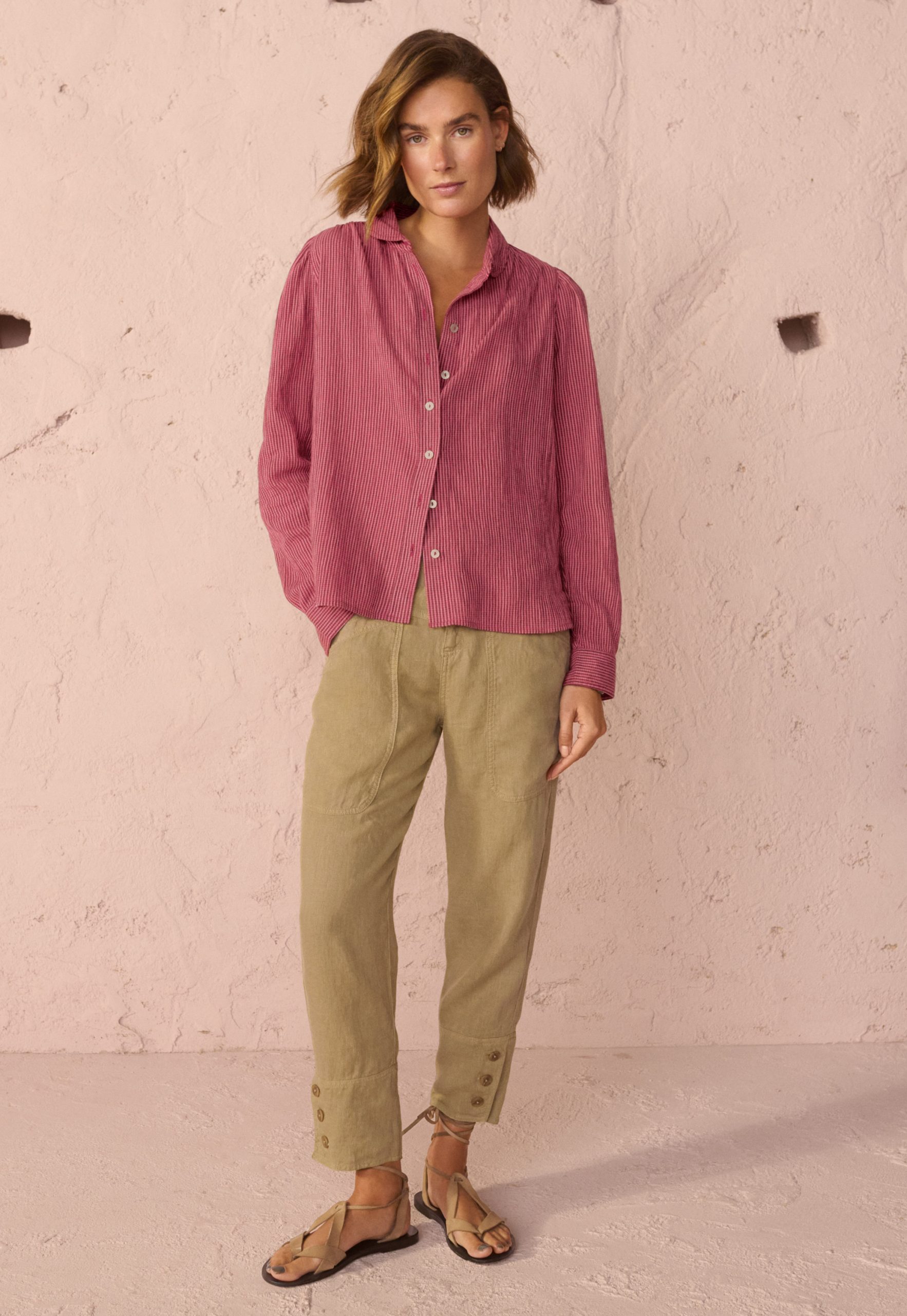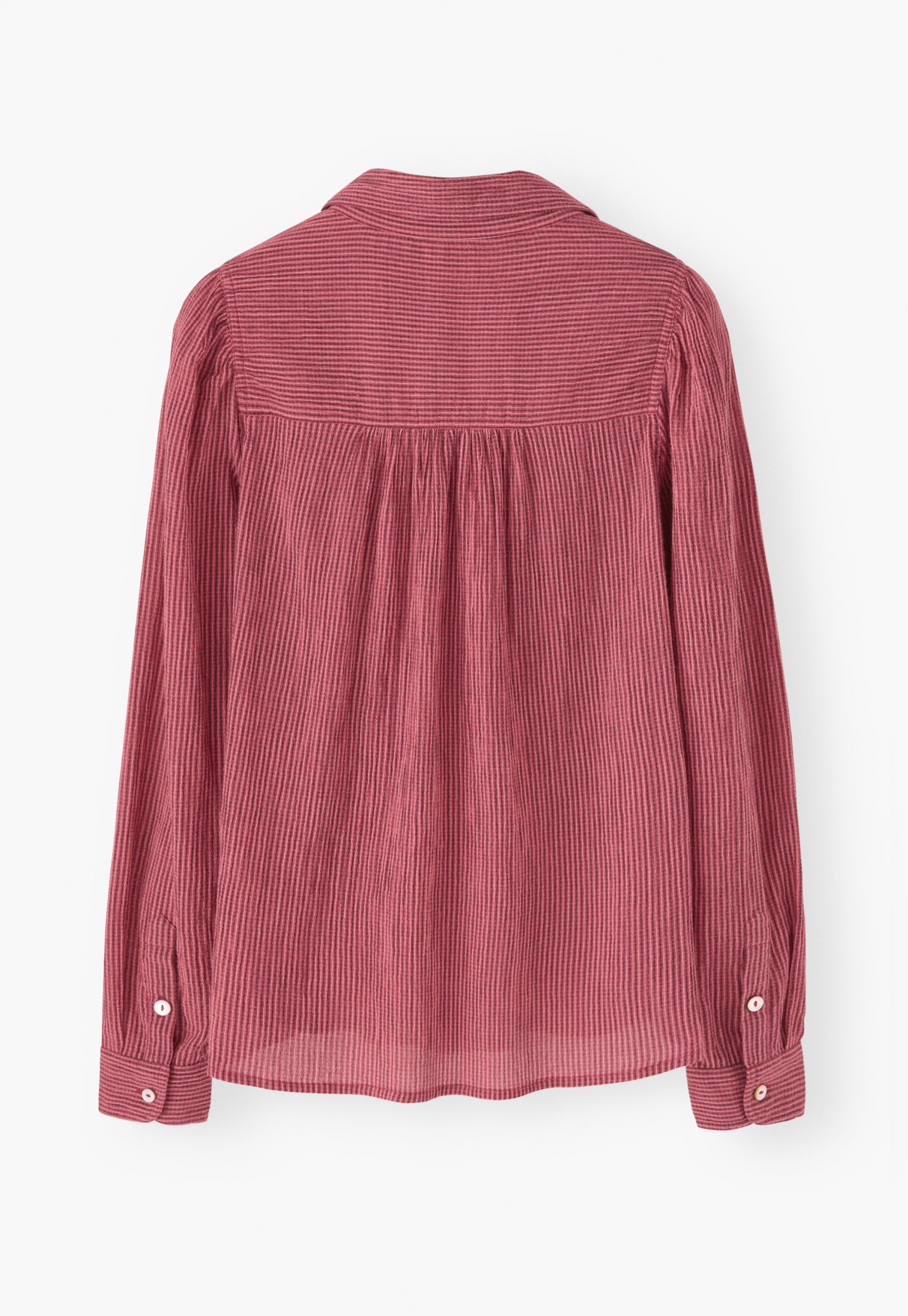 Fine lines feature over lightweight crinkle cotton to create a neat blouse for work or the weekend. With full-length sleeves and a gently curved hem.