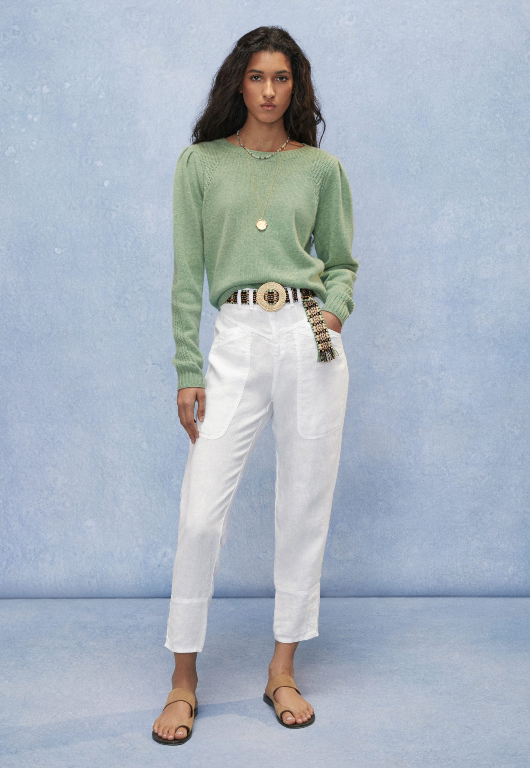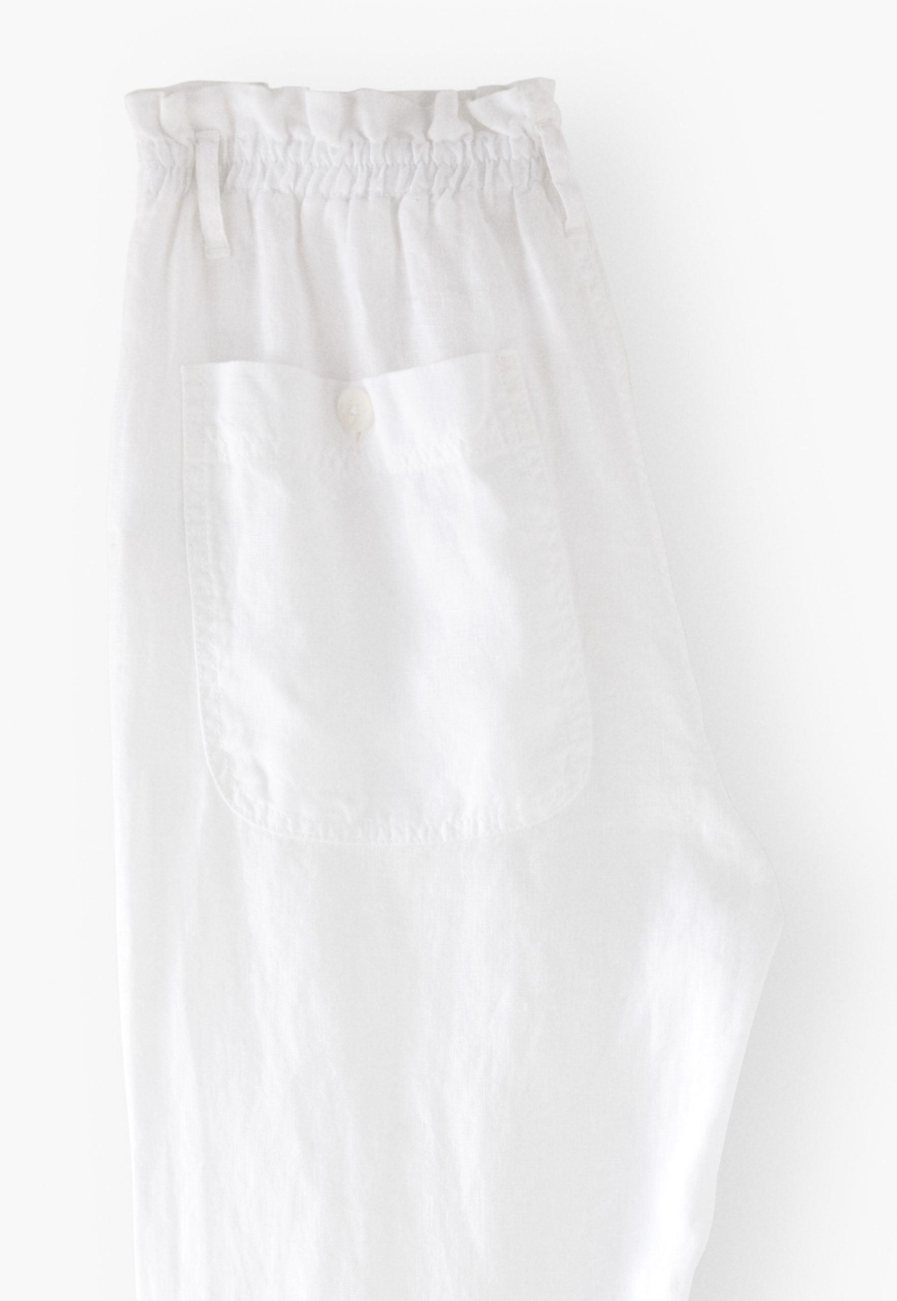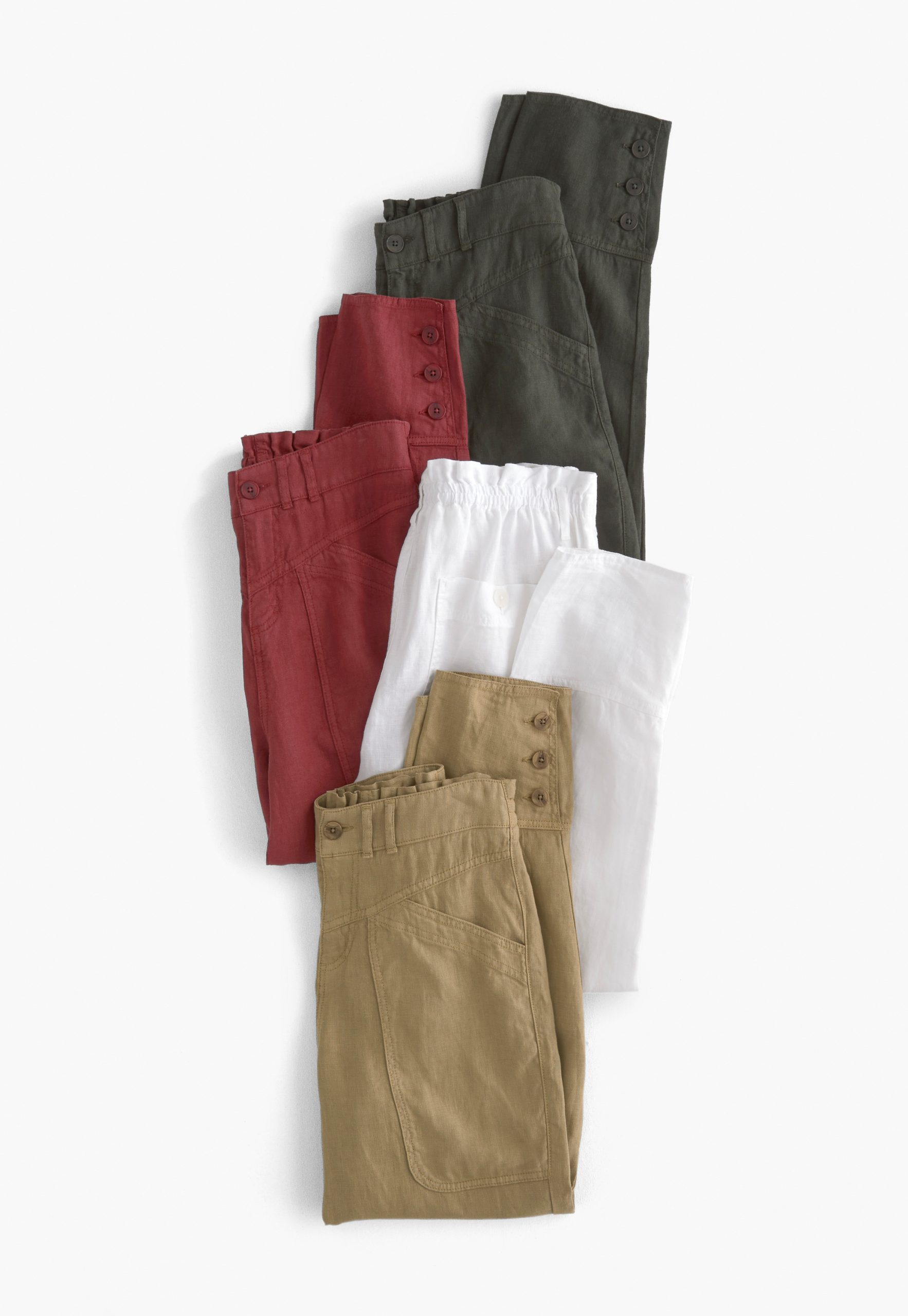 Beautifully cut garment-dyed linen cropped trousers with angled pocket-details and button fastenings at the hem. Elasticated at the back for a neat finish at the waist and loops so you can add your own belt.