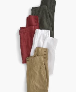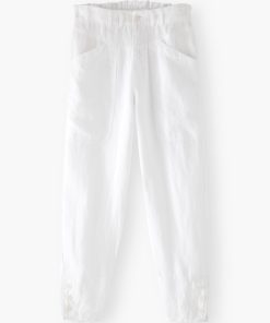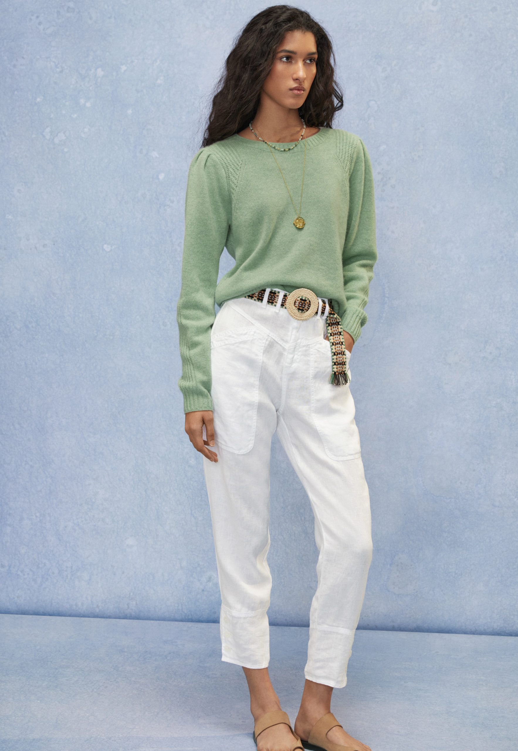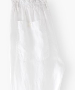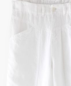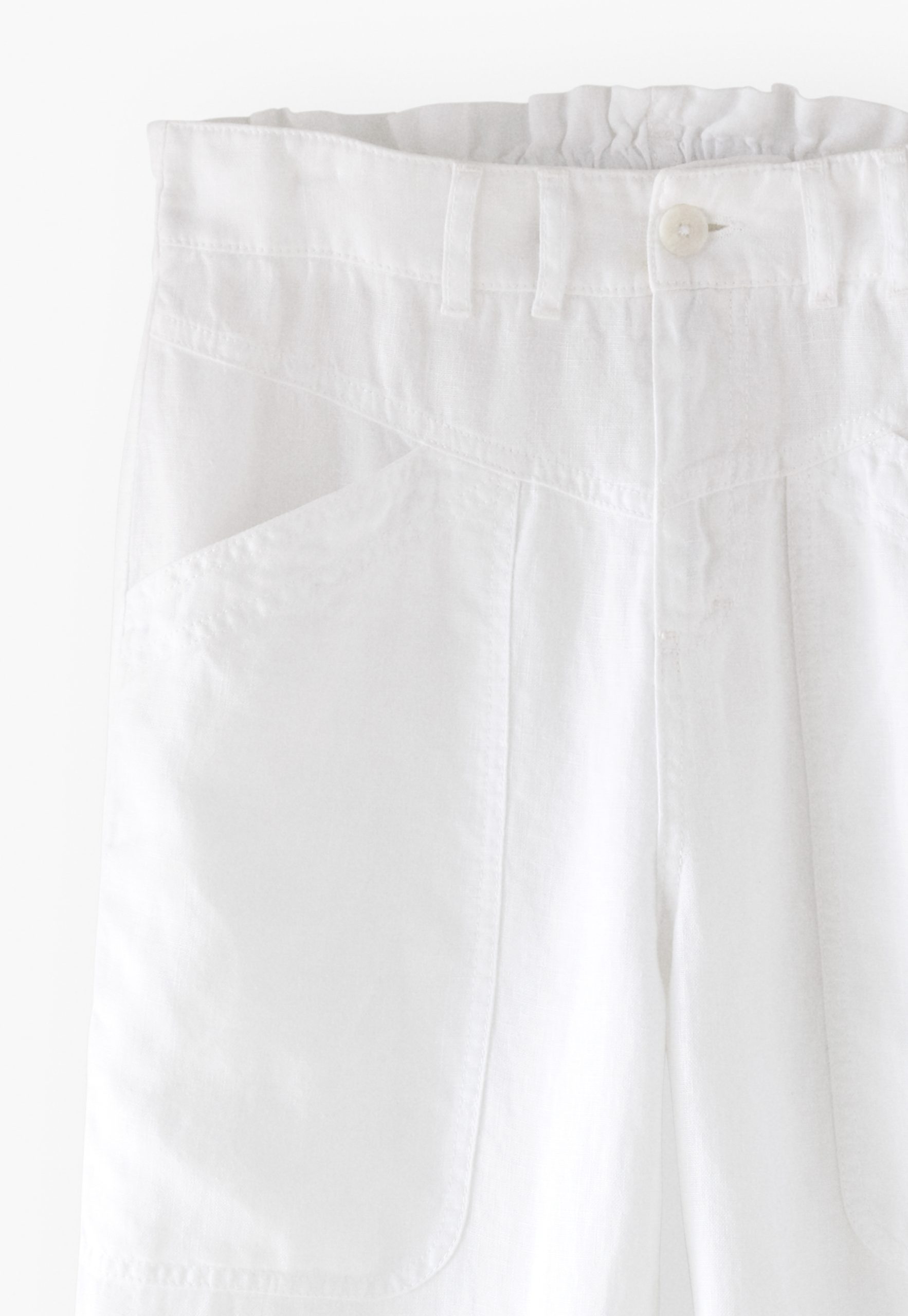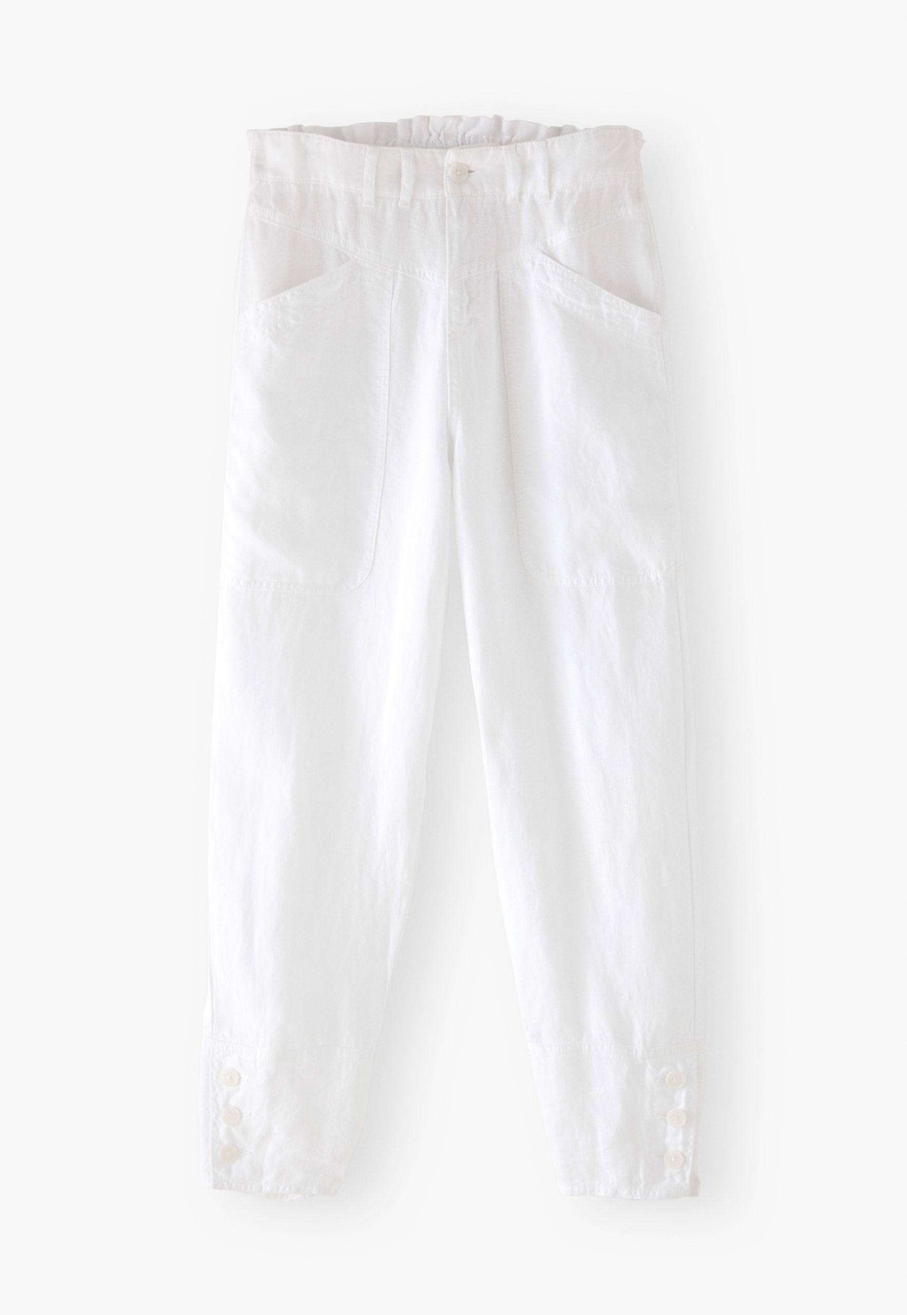 Beautifully cut garment-dyed linen cropped trousers with angled pocket-details and button fastenings at the hem. Elasticated at the back for a neat finish at the waist and loops so you can add your own belt.