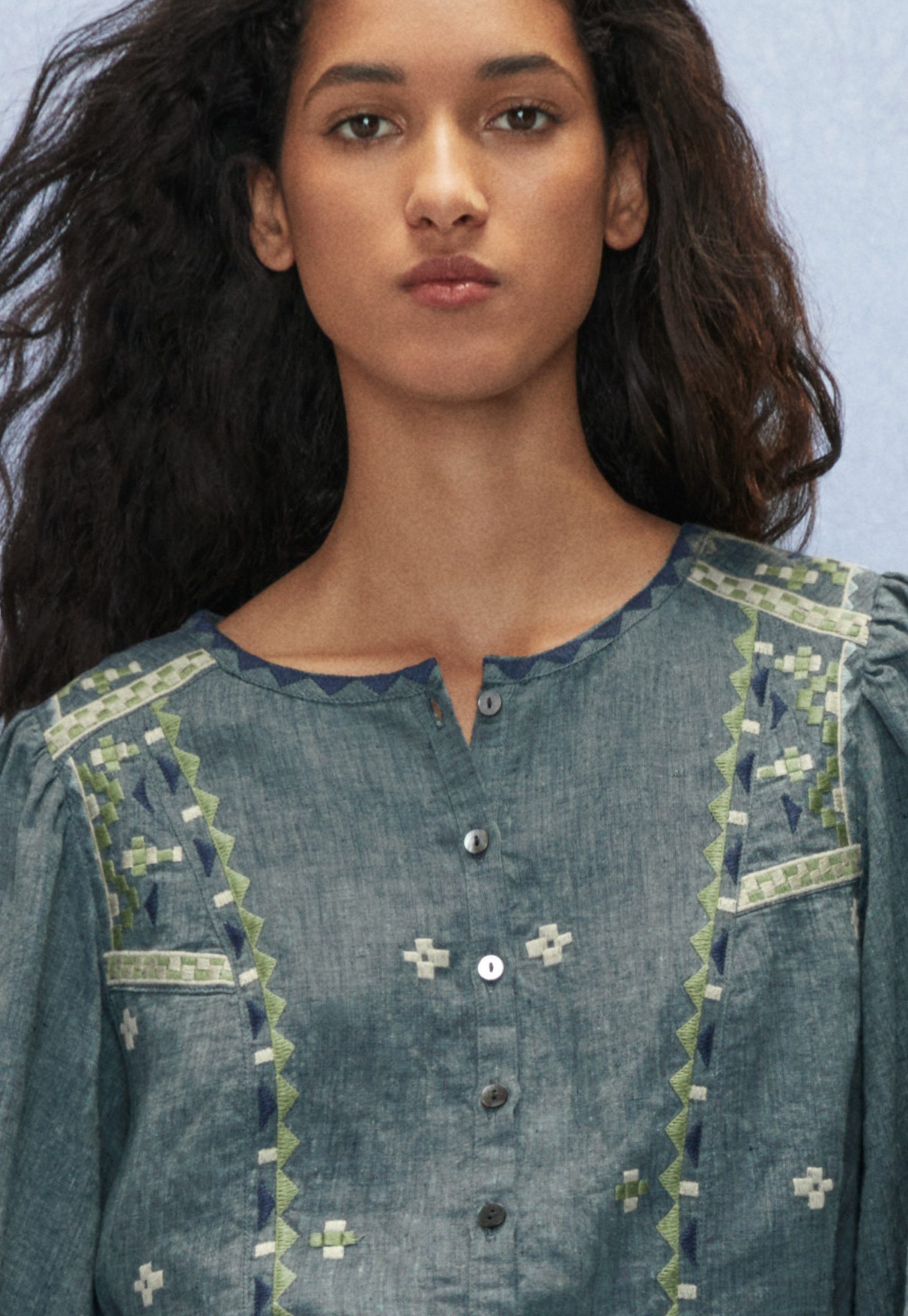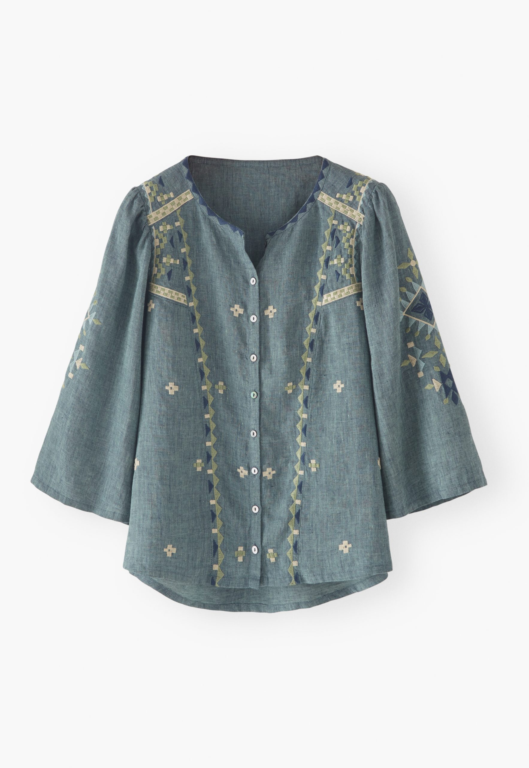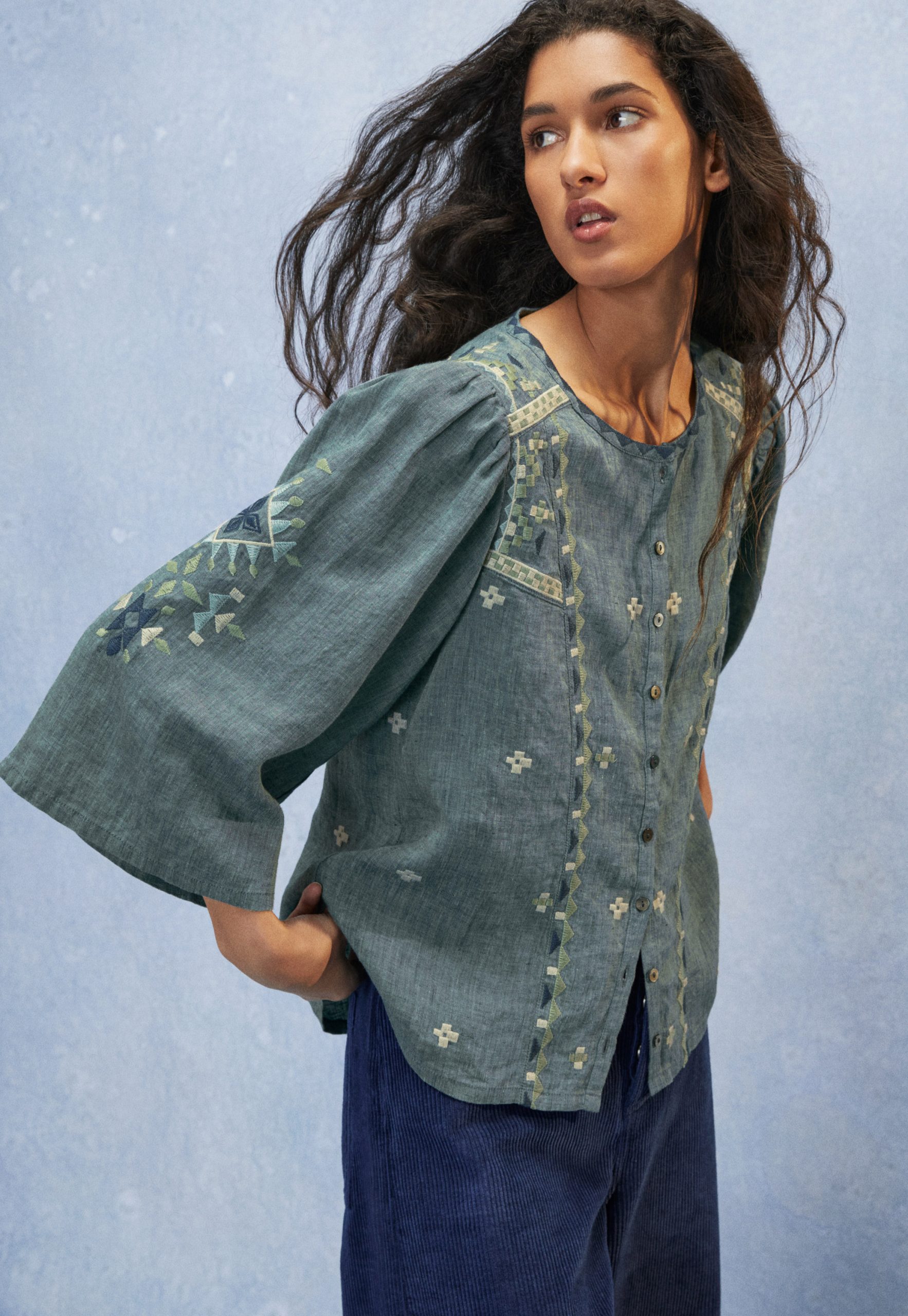 Fabulous linen blouse with a dynamic geometric design and tonal stitching at the collar and cuffs. Tuck in to shorts or jeans for a casual look or dress it up with a tapered trouser and higher heel.