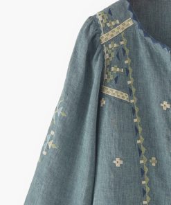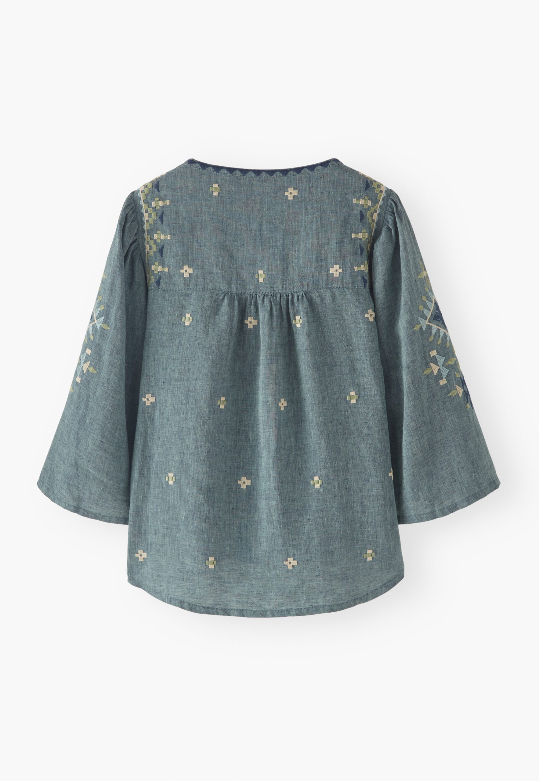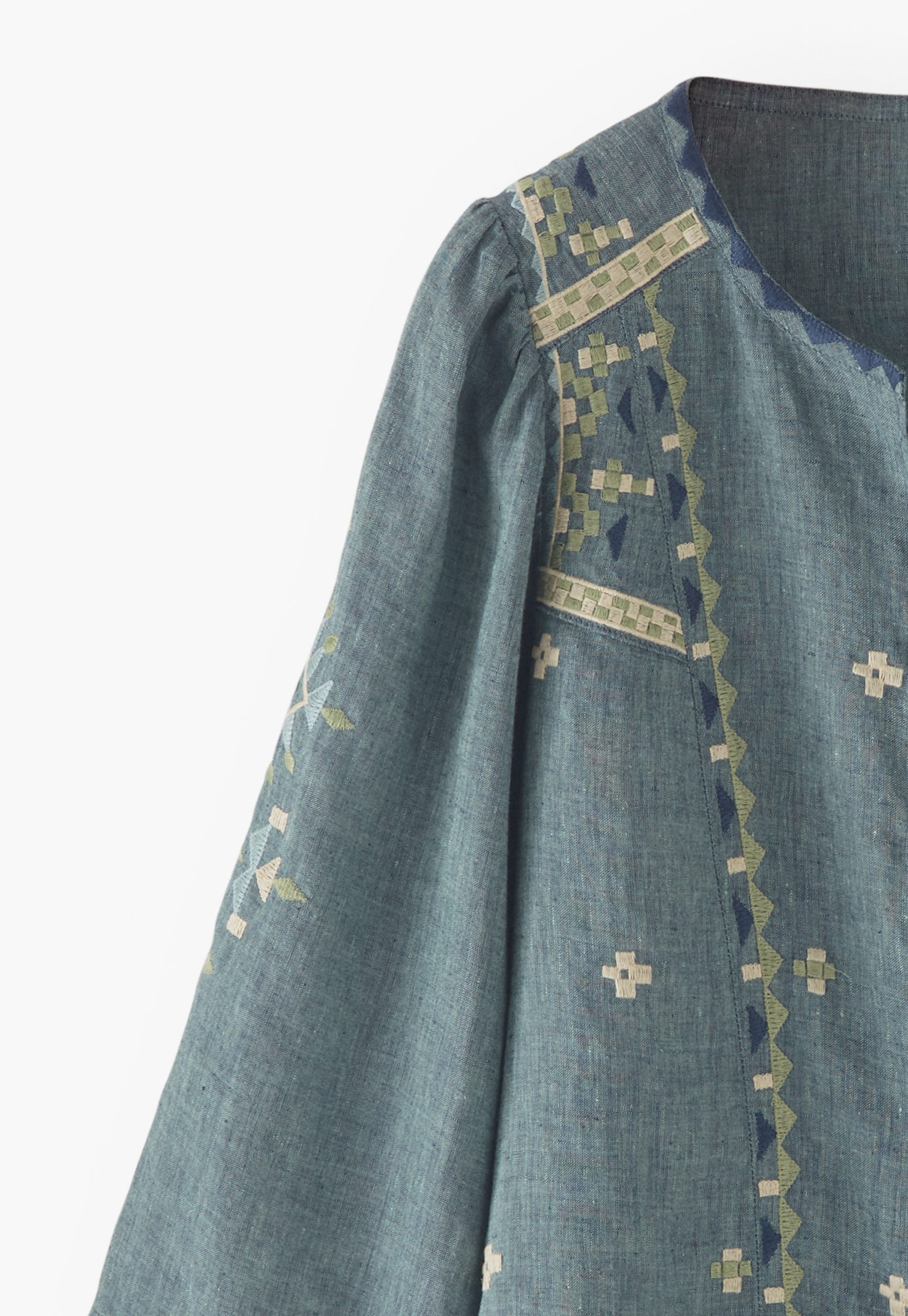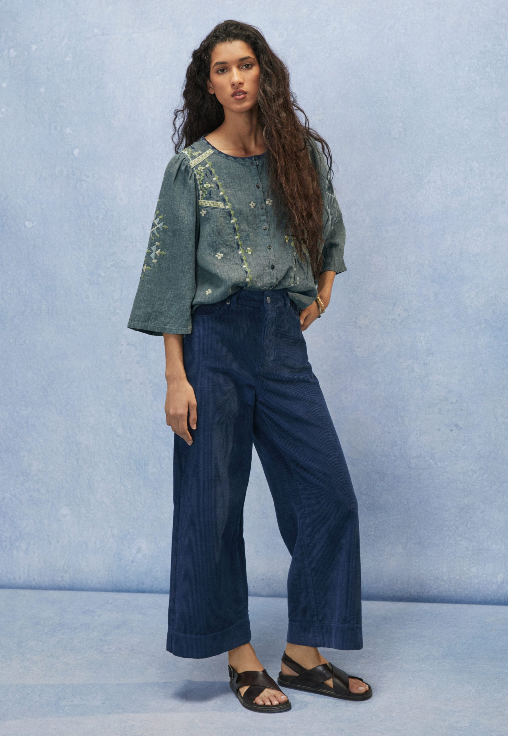 Fabulous linen blouse with a dynamic geometric design and tonal stitching at the collar and cuffs. Tuck in to shorts or jeans for a casual look or dress it up with a tapered trouser and higher heel.