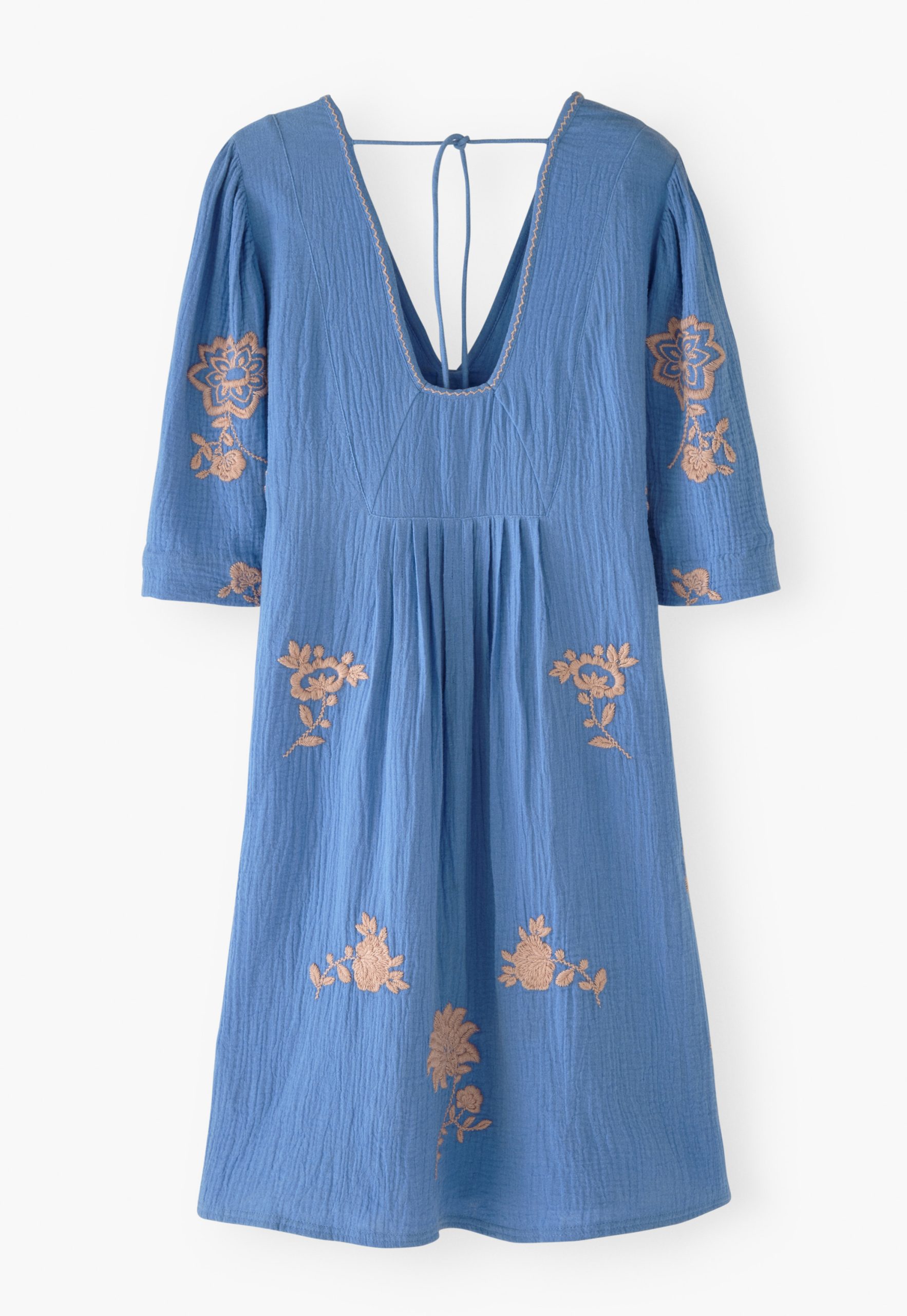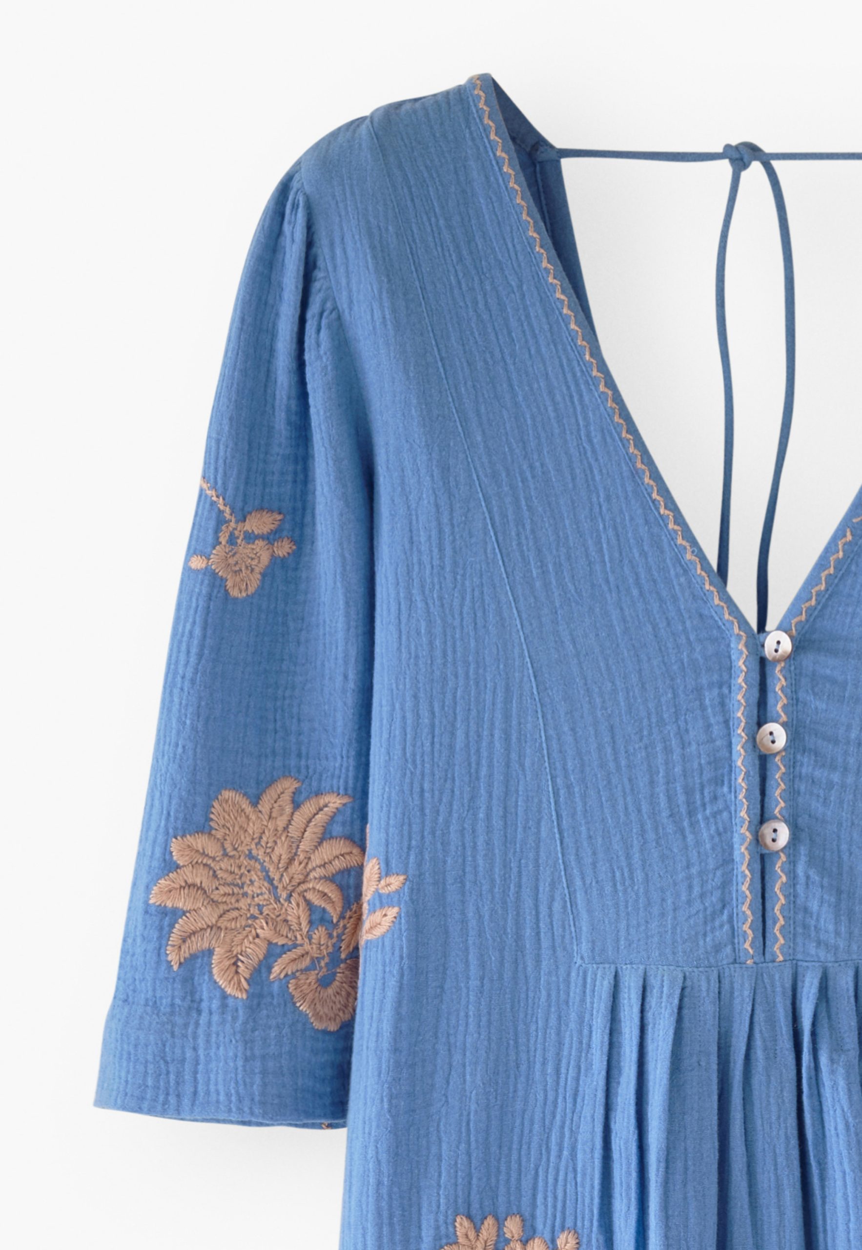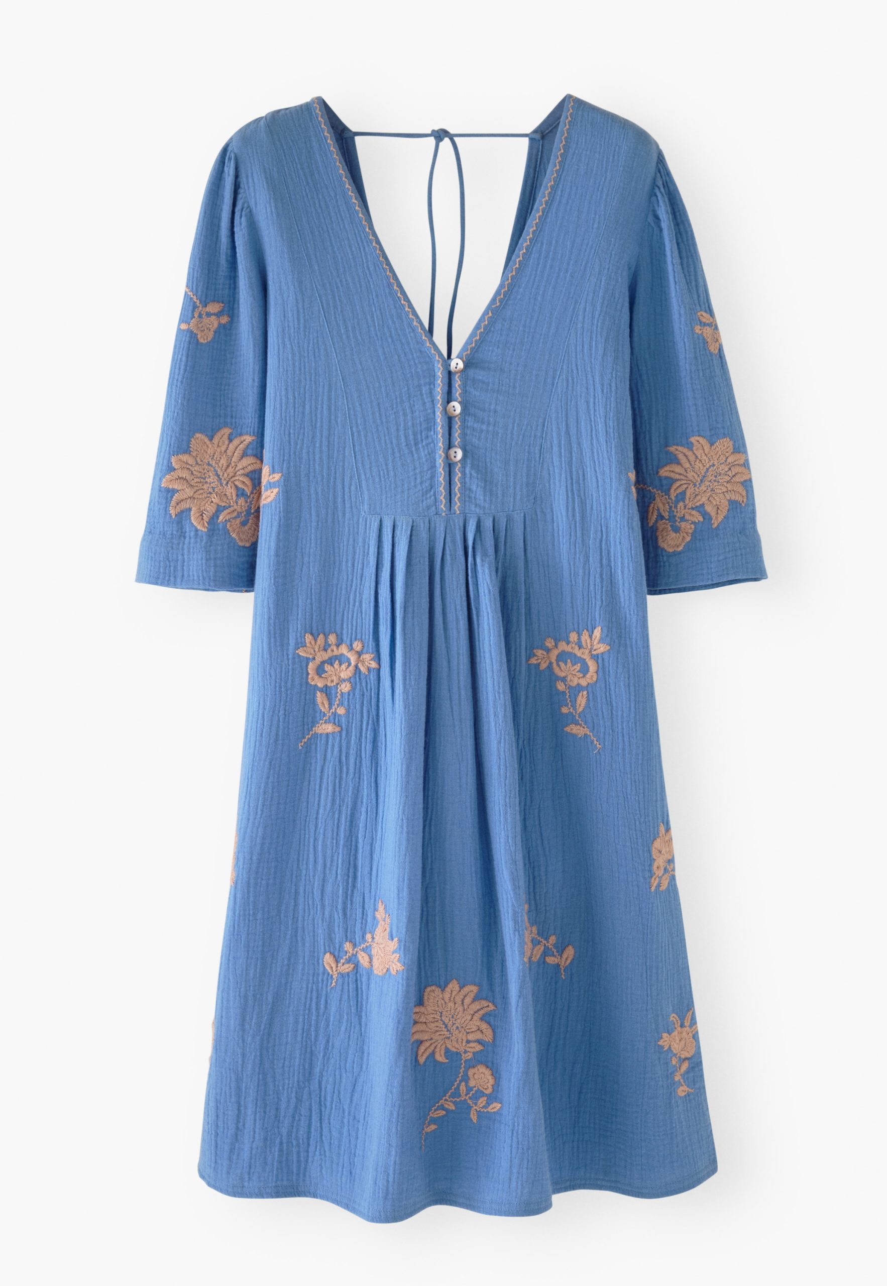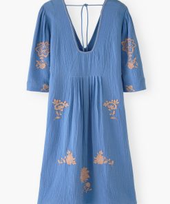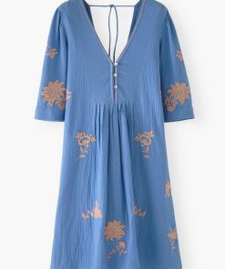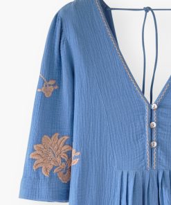 A beautiful dress for a memorable summer. Intricately stitched embroidered flowers cover gauzy double cotton to create a relaxed-fit dress with wide, elbow-length sleeves. Works for both barefoot on the beach and striding the city streets.