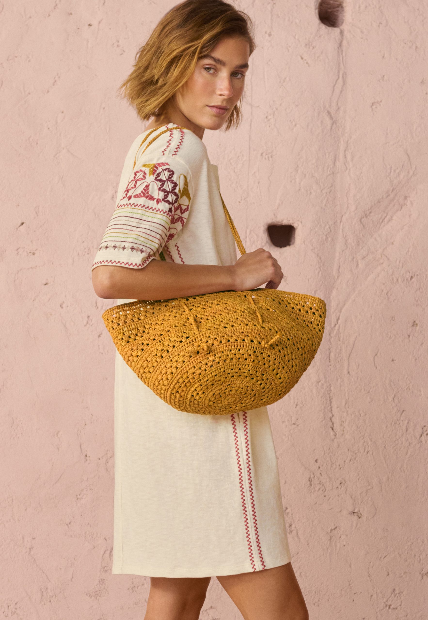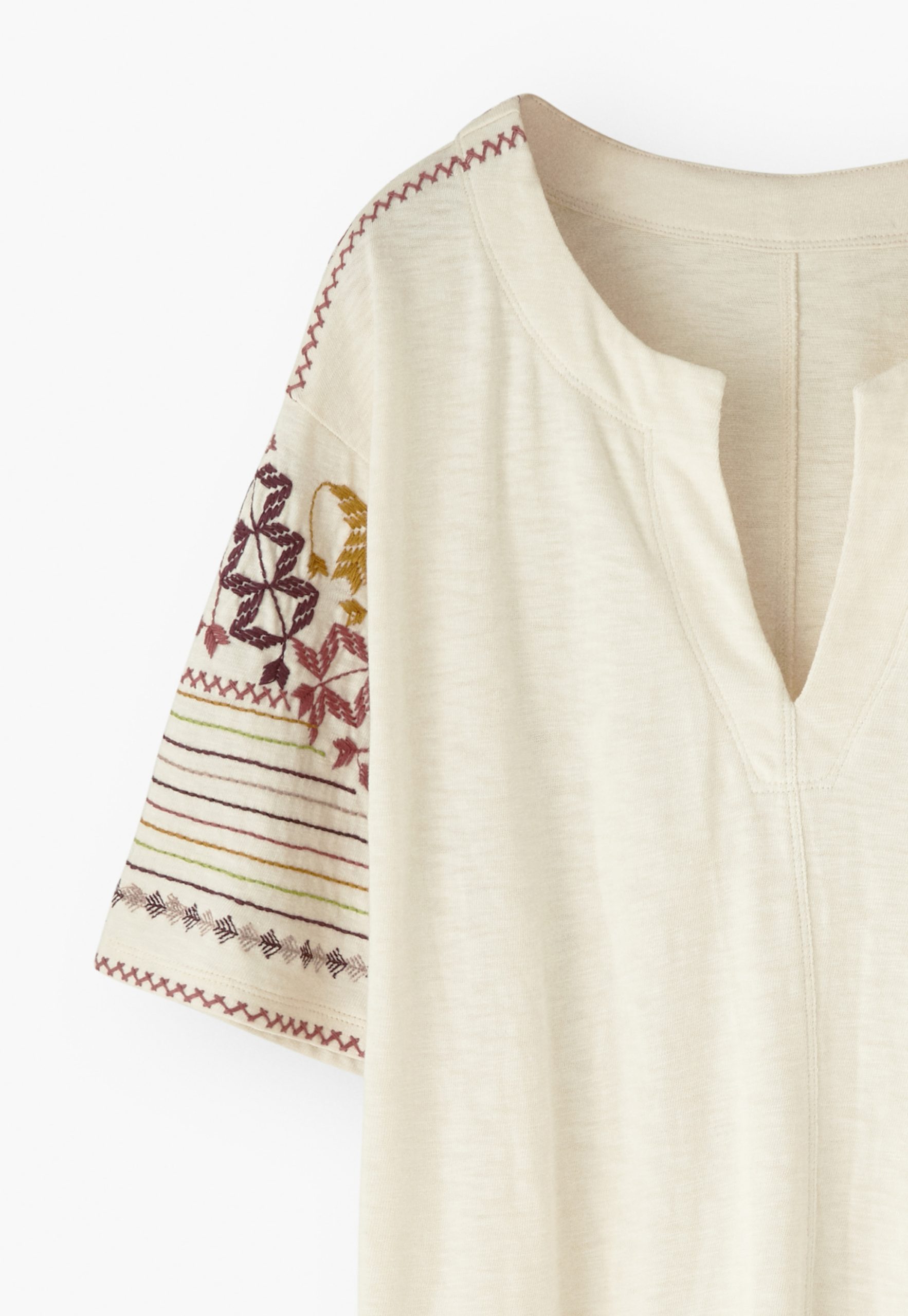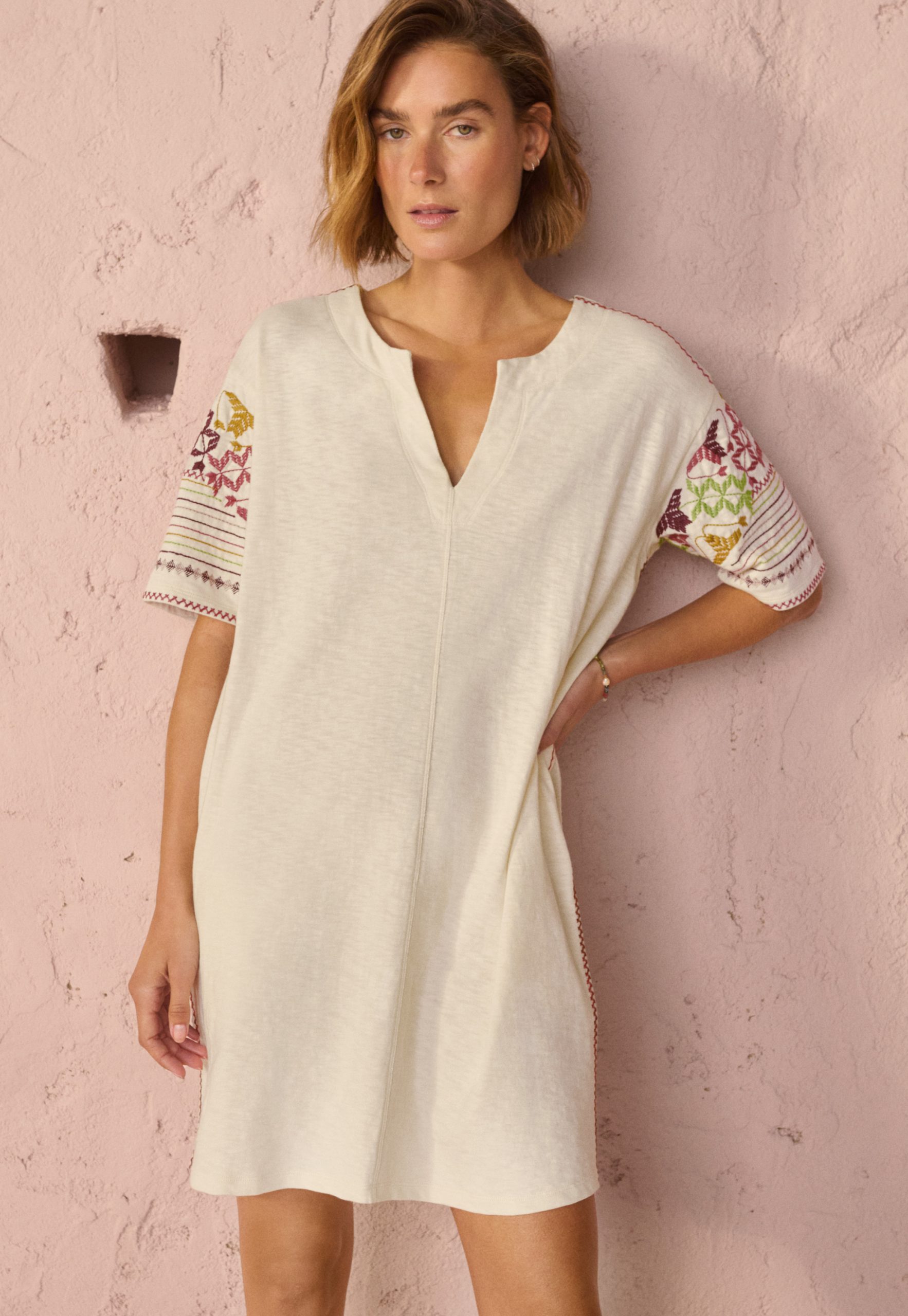 A great beach-cover up, this pure cotton shift dress has contrasting embroidery on the sleeves and seams. Easy dropped shoulders and a notched neckline complete with always-useful pockets.