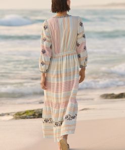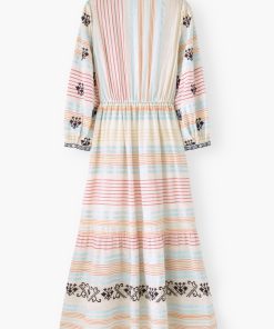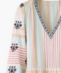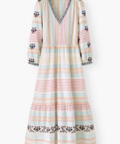 Fresh stripes and lightweight cotton meet to create this relaxed-fit v-neck dress. The bracelet-length sleeves and lower tier are scattered with bold embroidery details for a pop of contrast.
