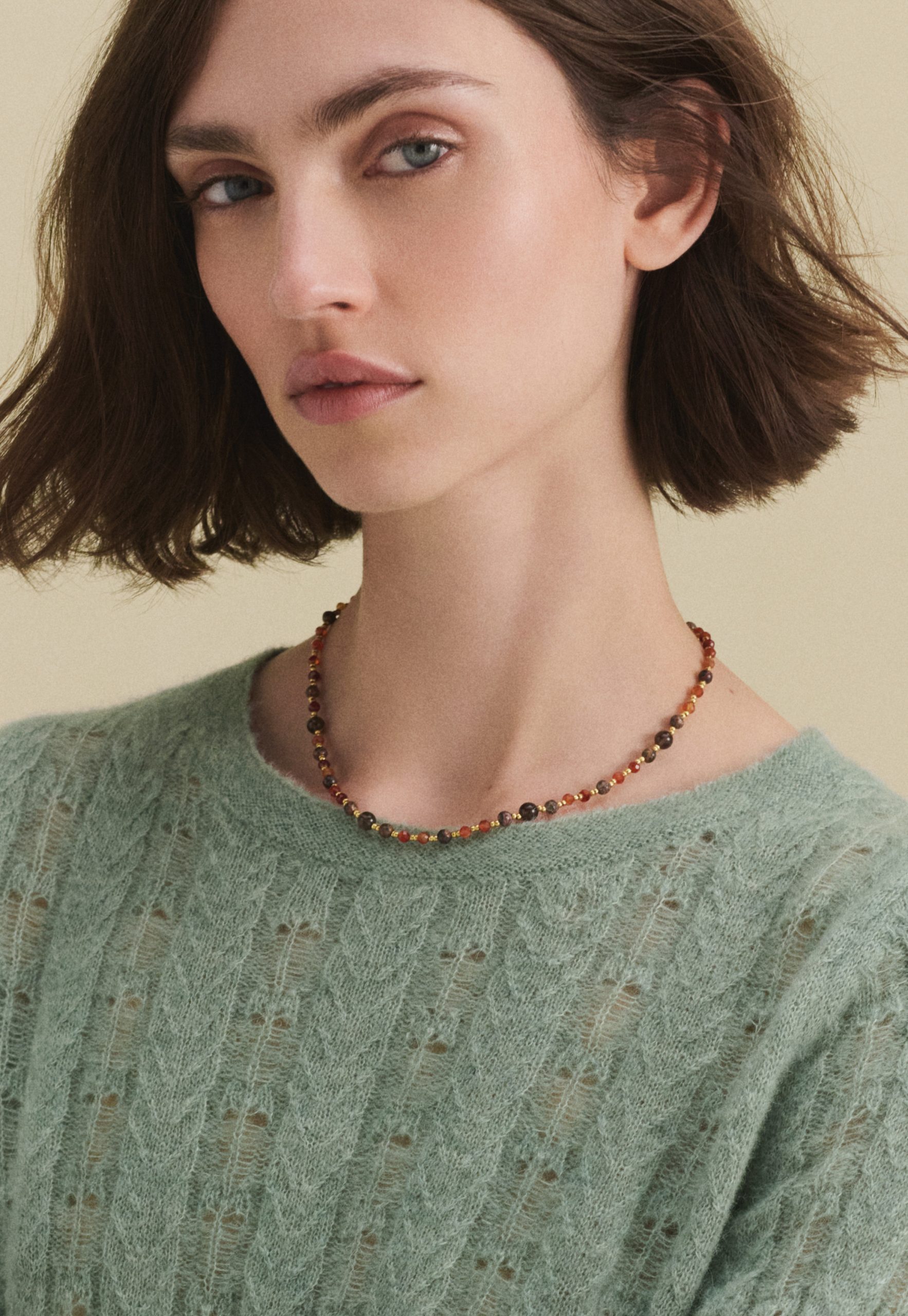 - Orange agate and smoky quartz beaded necklaceGold vermeil beadsAlternating bead patternRound clasp fastening