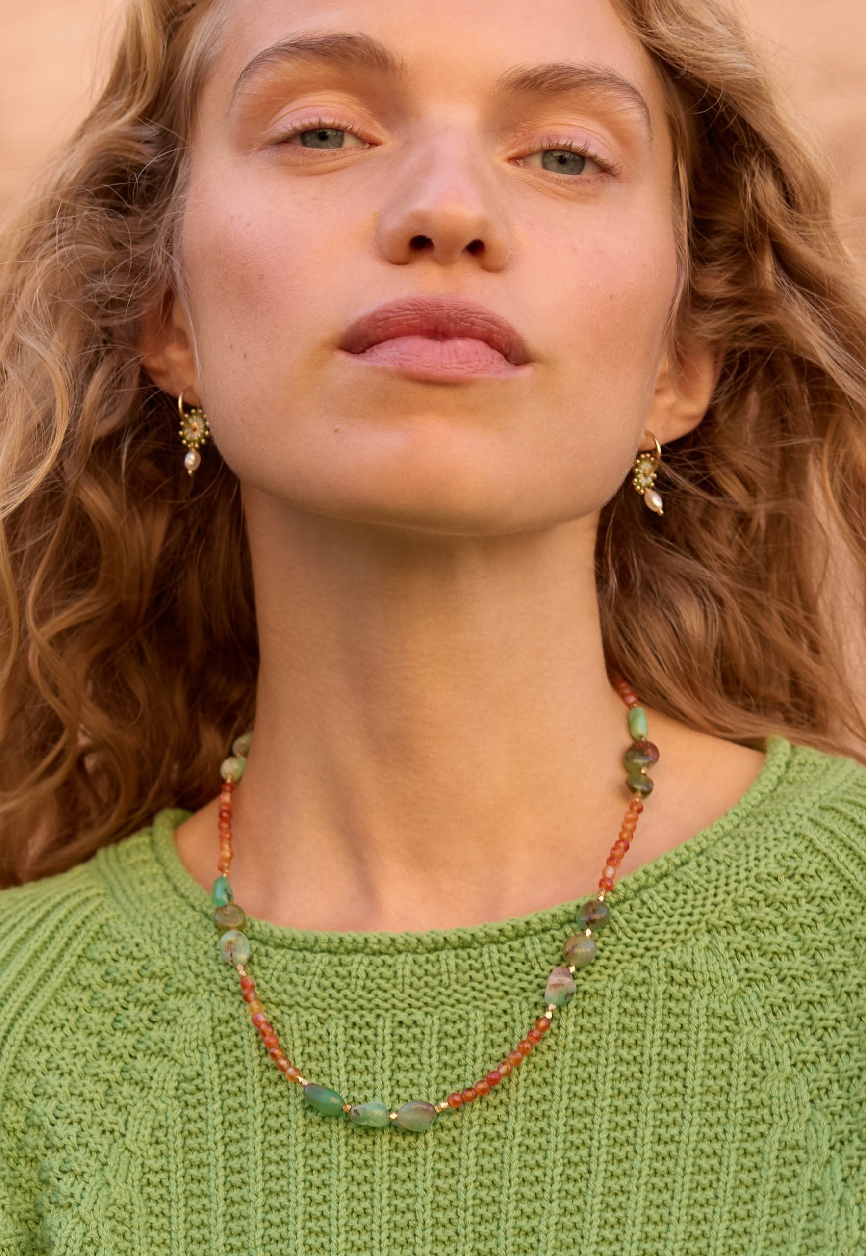 A beaded necklace with a captivating combination of agate and gold fill brass beads, designed to make a bold statement. The alternating bead pattern creates a visually striking rhythm, with the natural variation of the agate beads adding unique character to each piece.