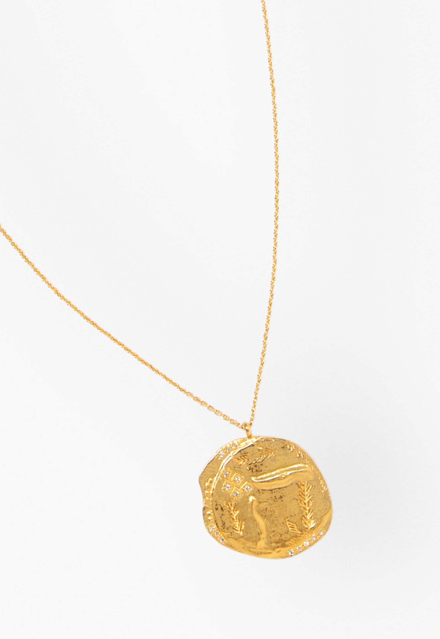 This fine link chain has a pretty matte gold pendent, engraved and set with white zirconia.