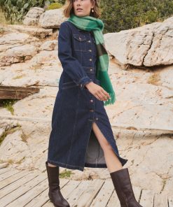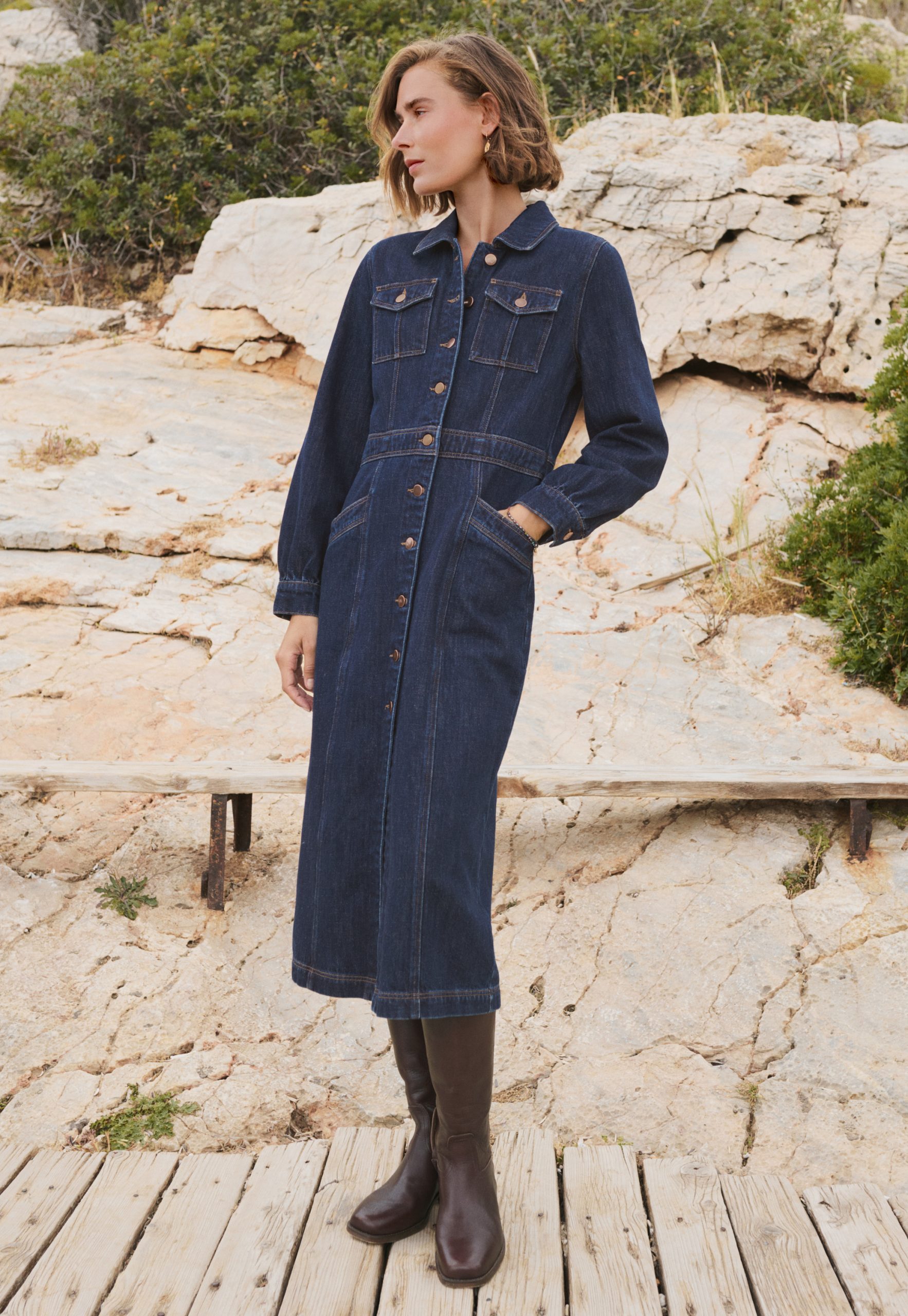A deep indigo shirtdress made from substantial cotton and hemp denim. In a straight, regular fit with utility styling – copper hardware and contrast stitching. Wear with bare legs and trainers until the temperature drops.