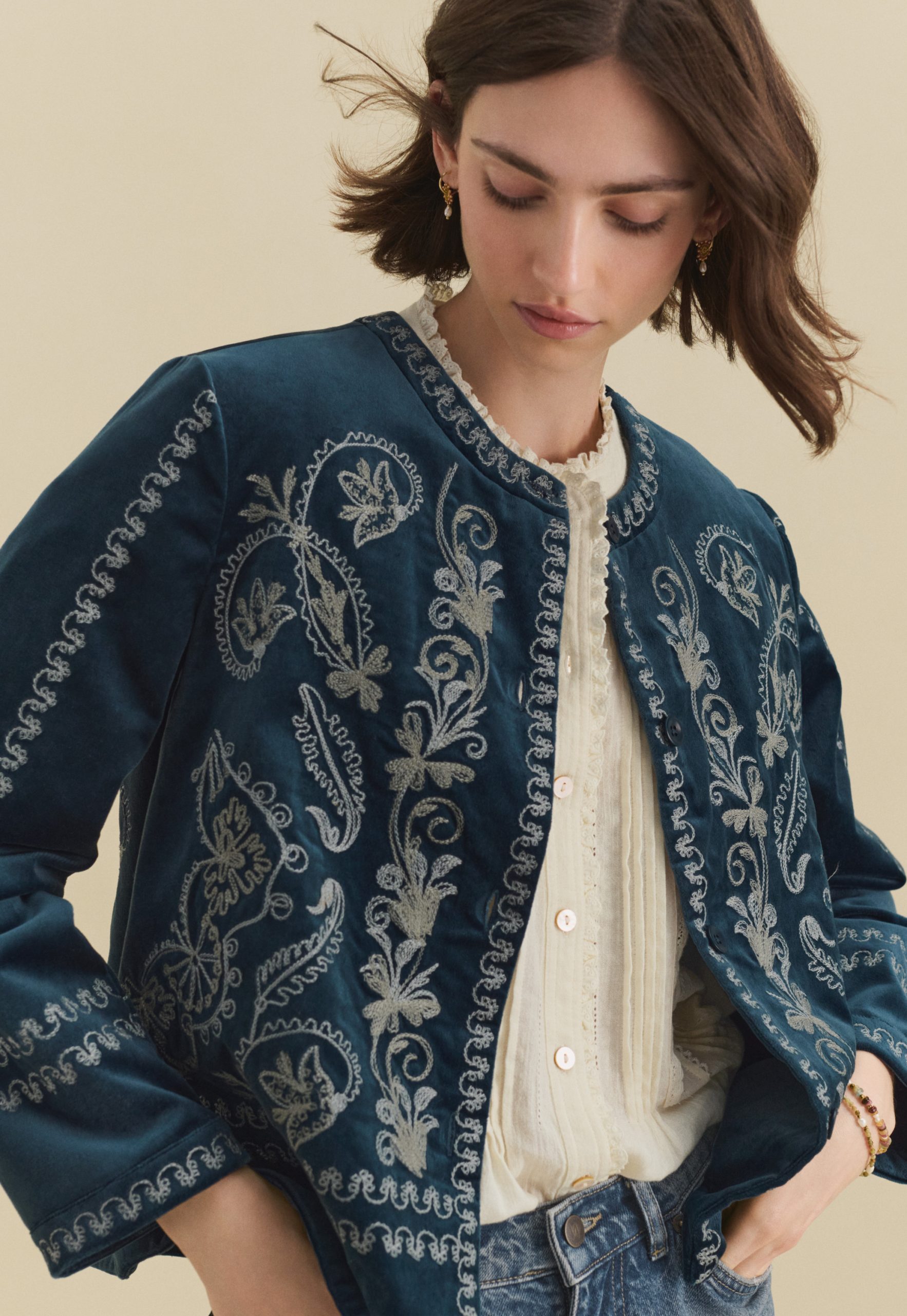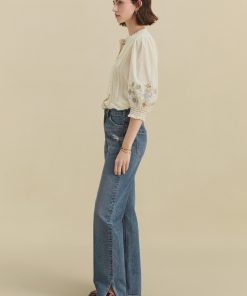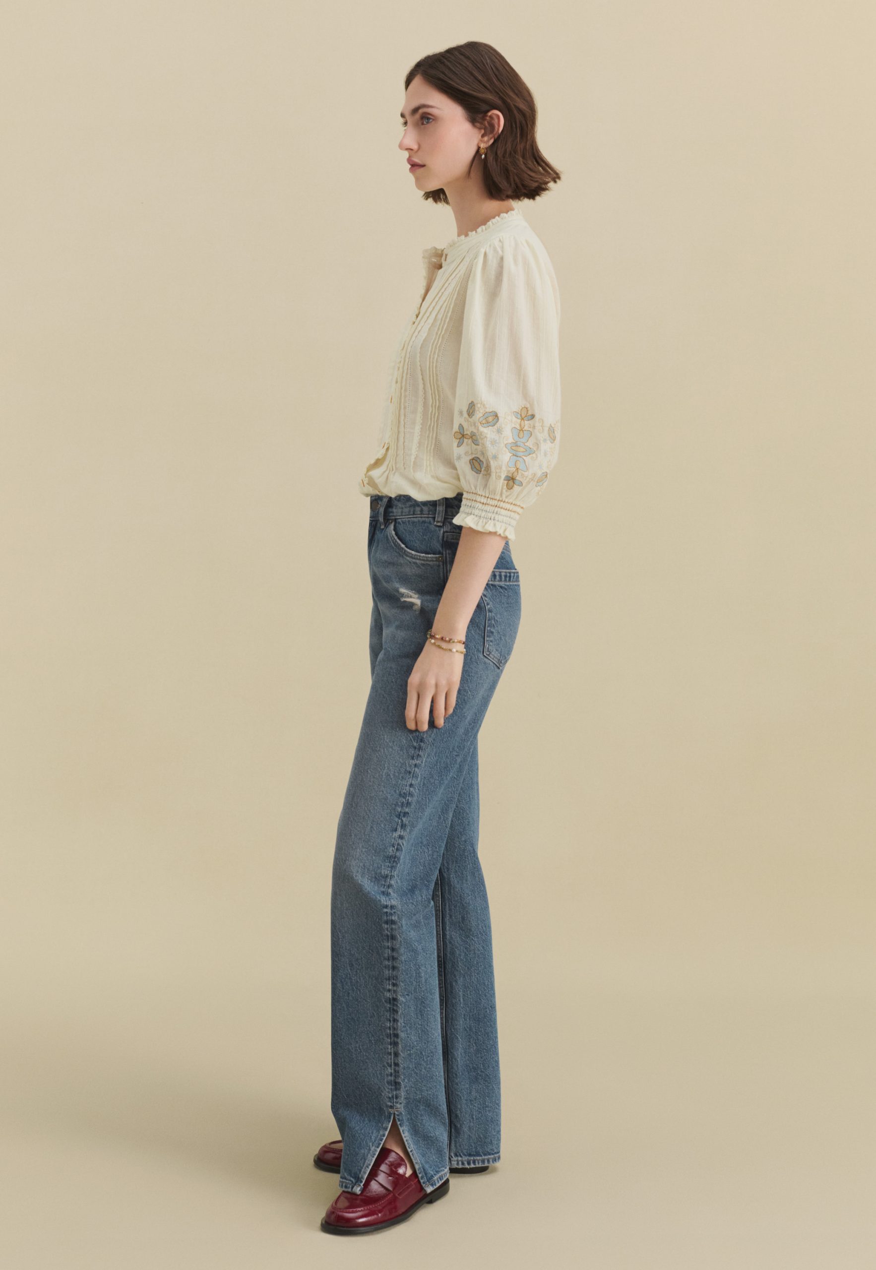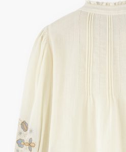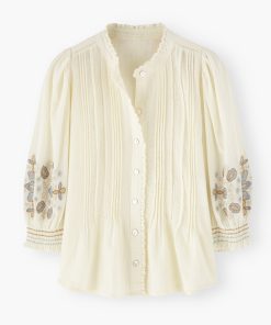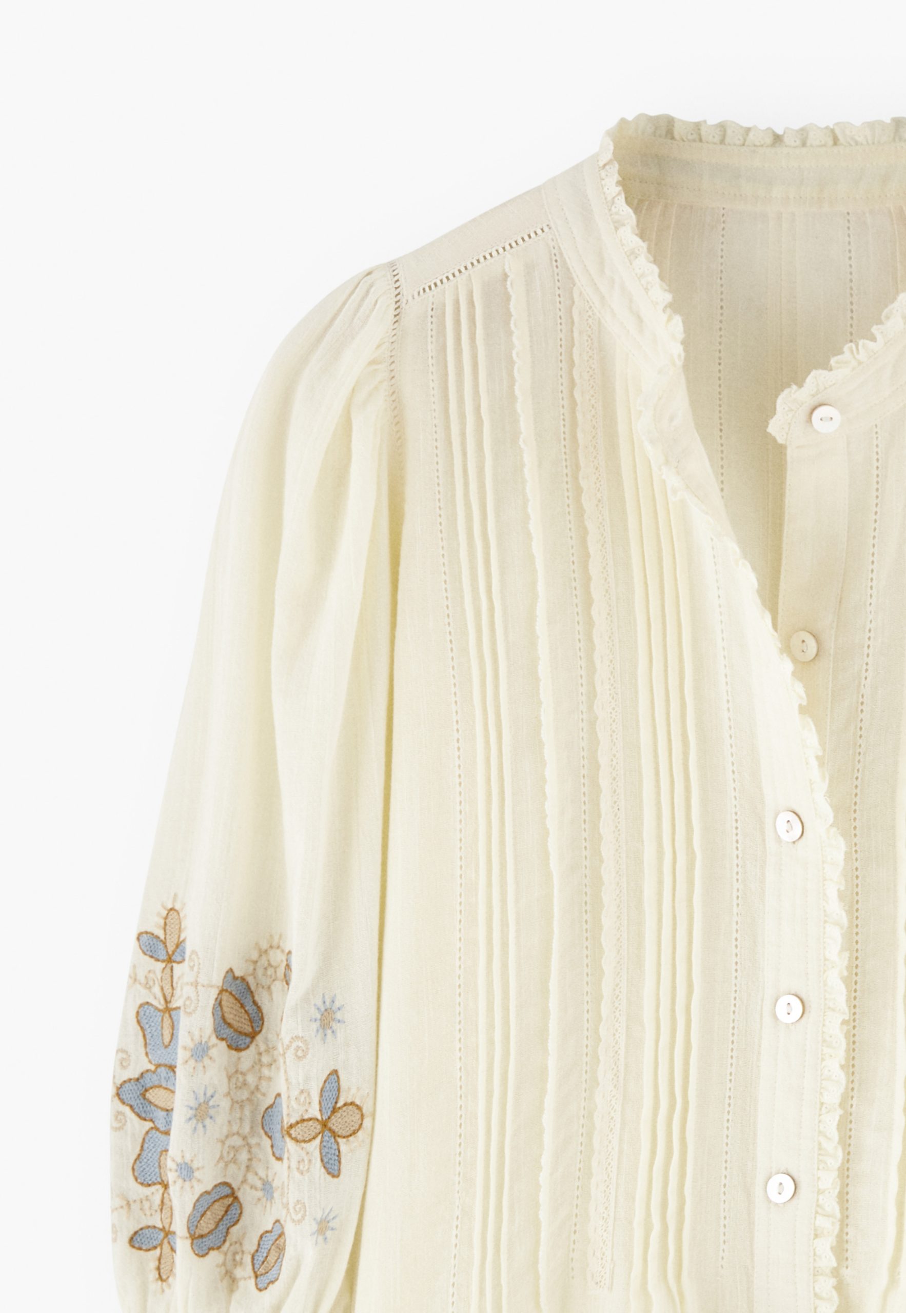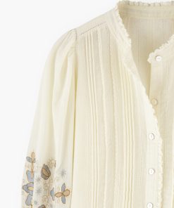 A breezy cotton blouse with intricate abstract floral embroidery on the blouson sleeves. In a relaxed fit with lace and pintuck details front and back, it’s perfect weekend brunch wear.