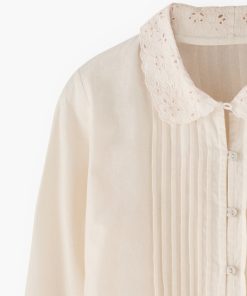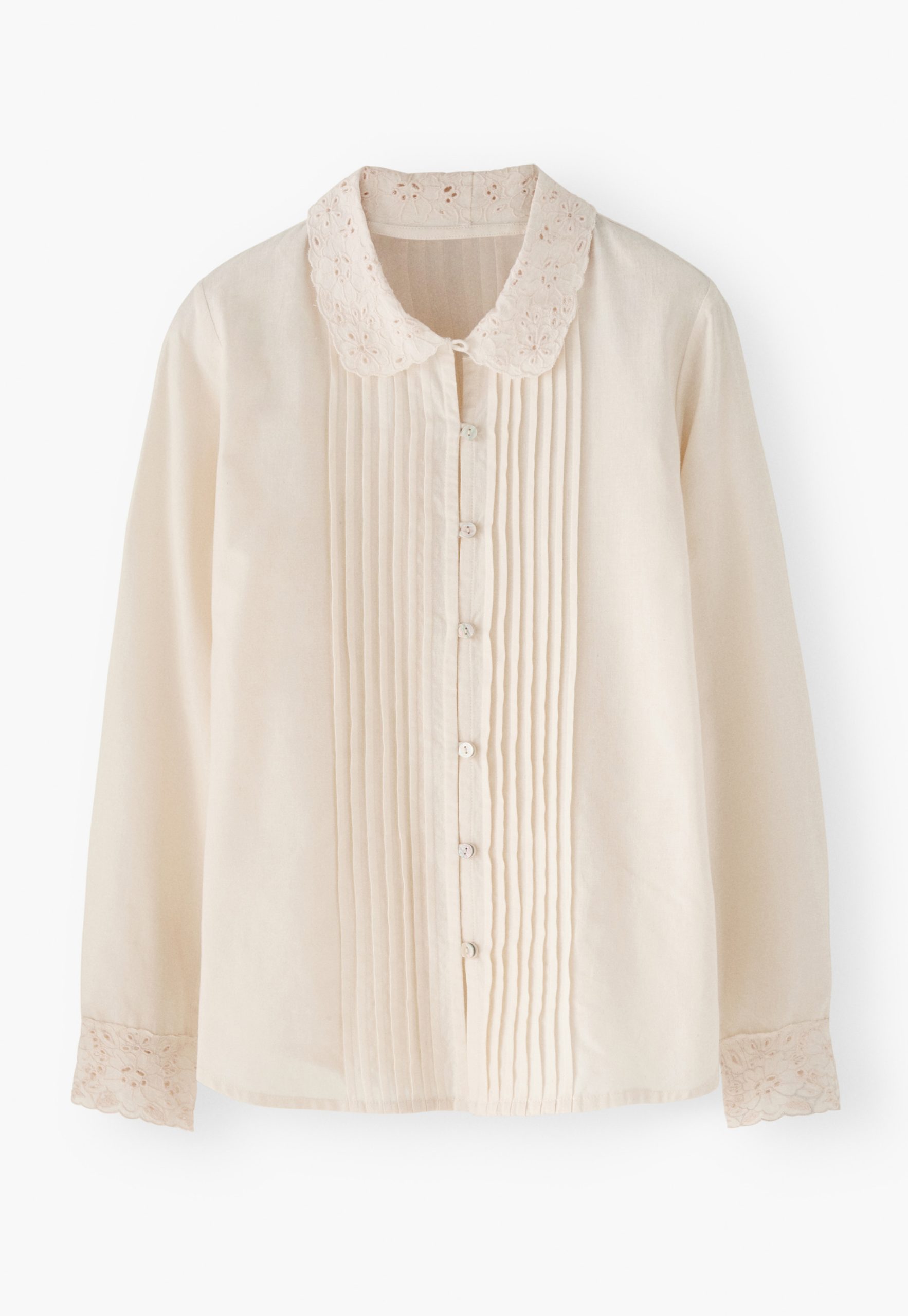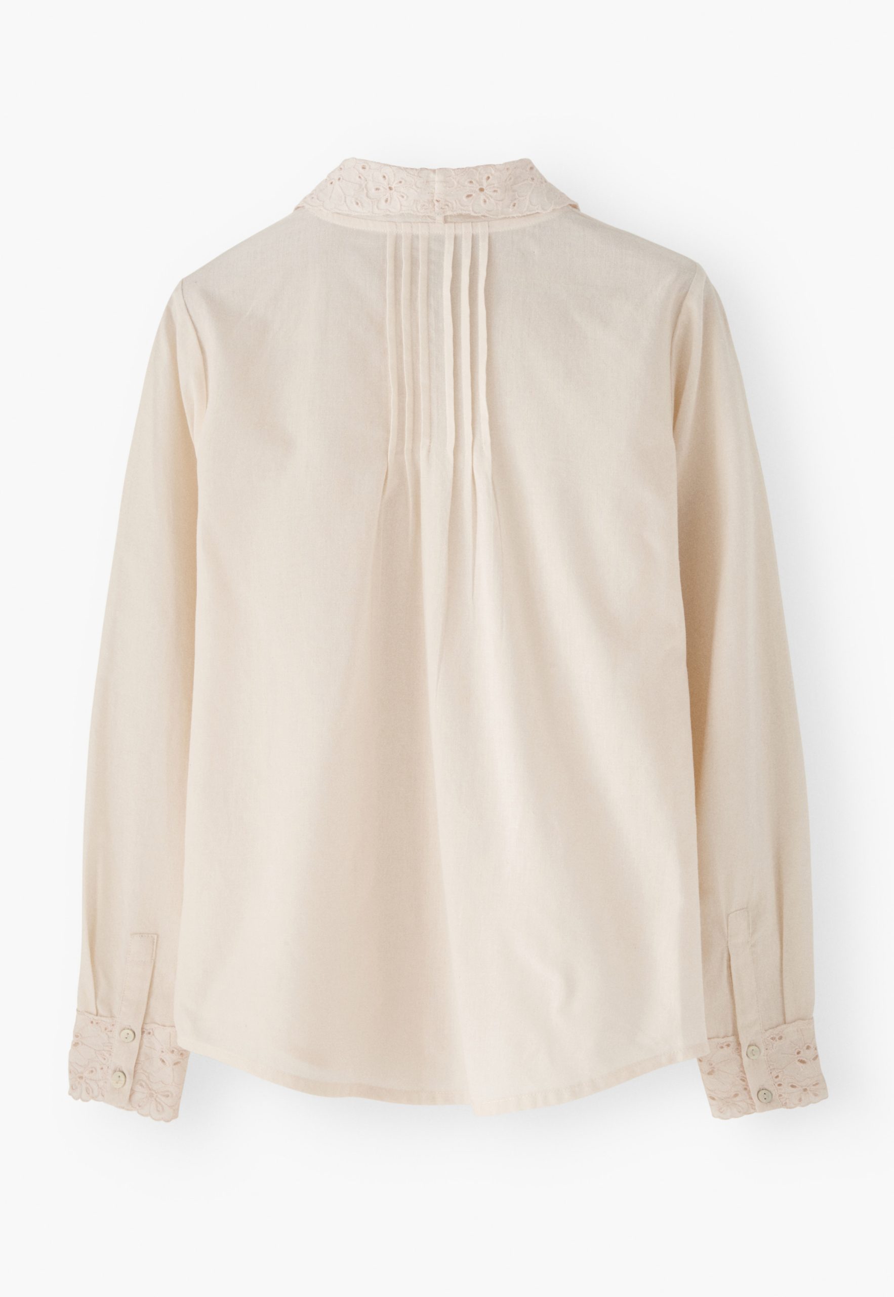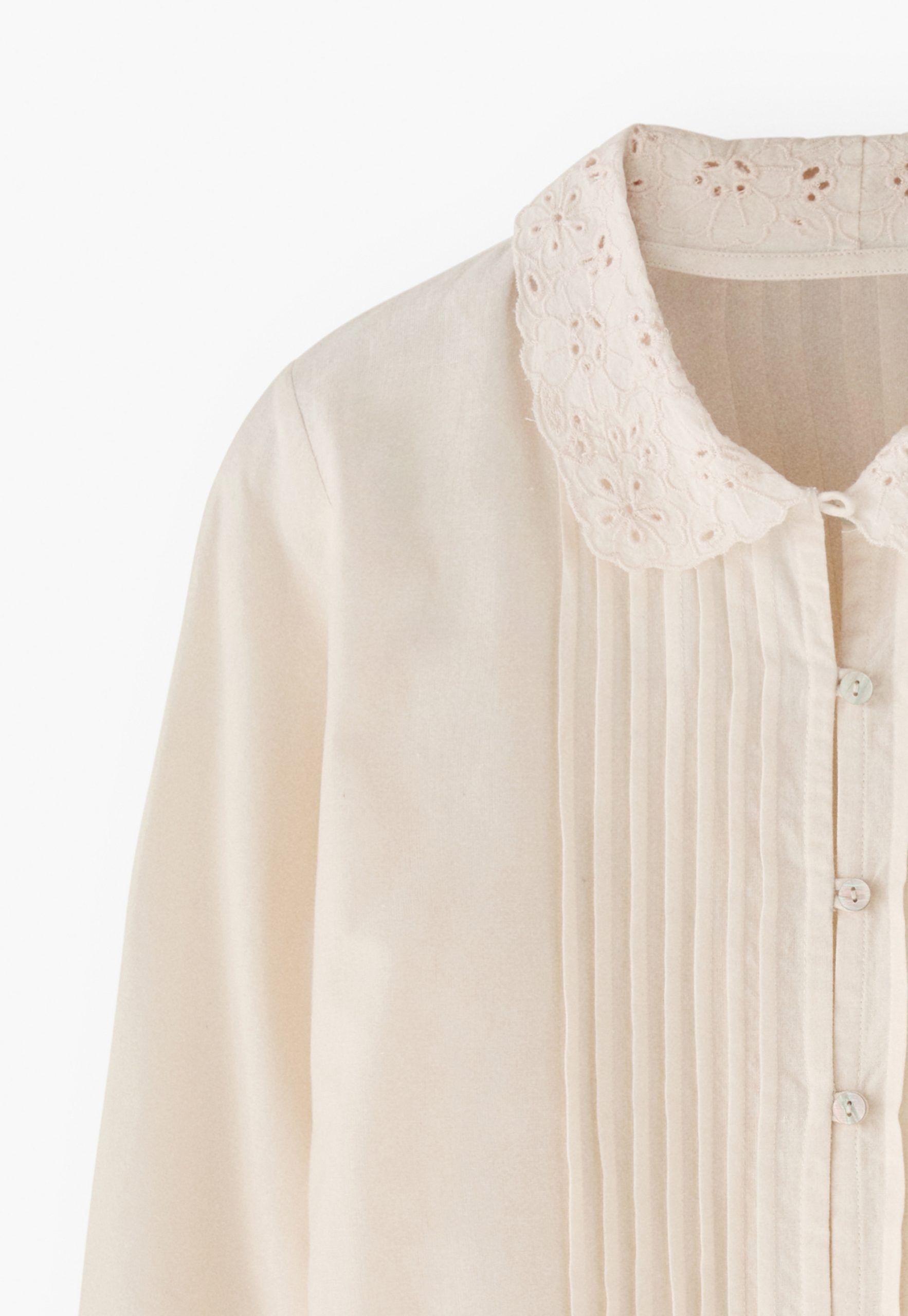 - Embroidery cutwork at cuffs