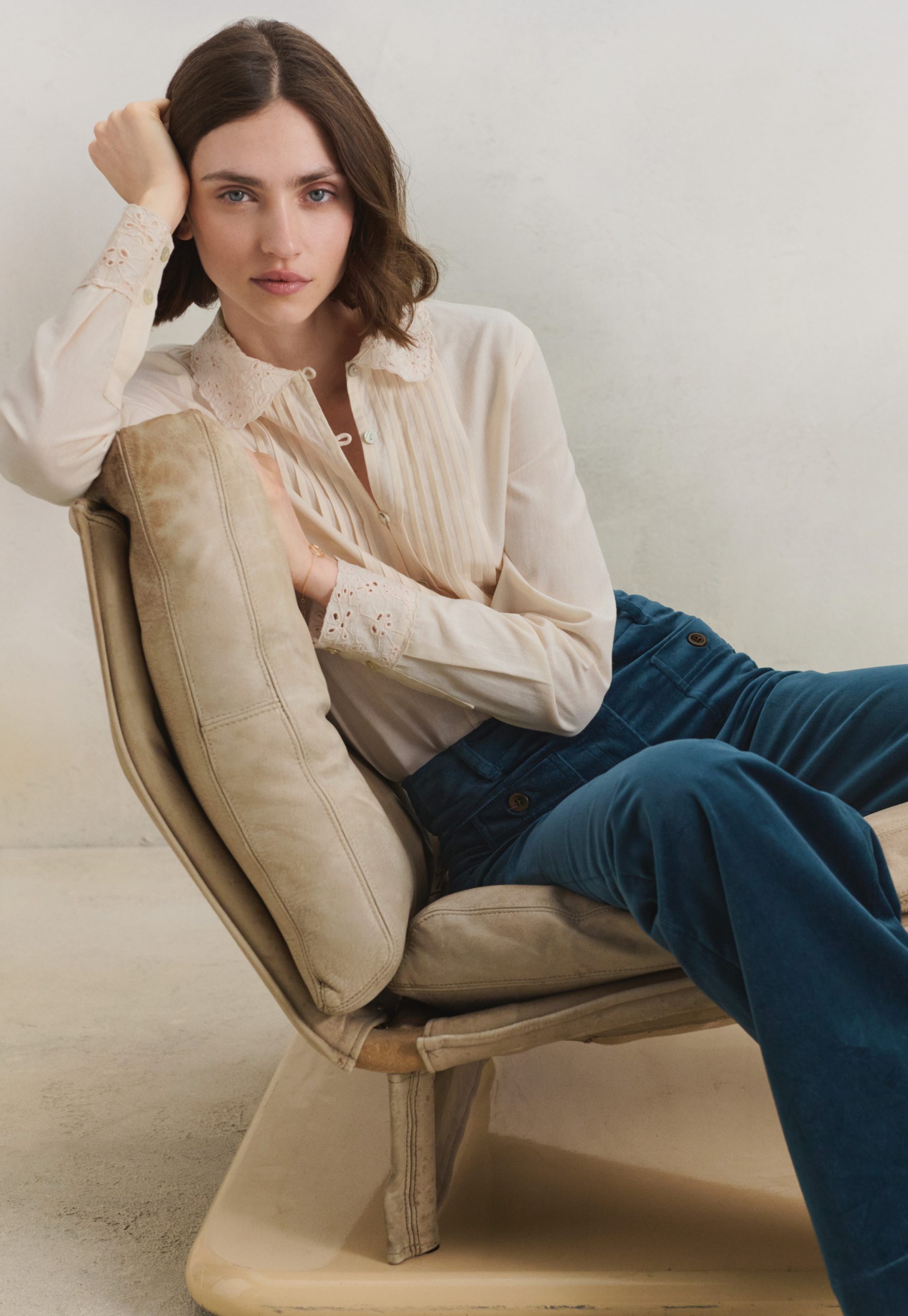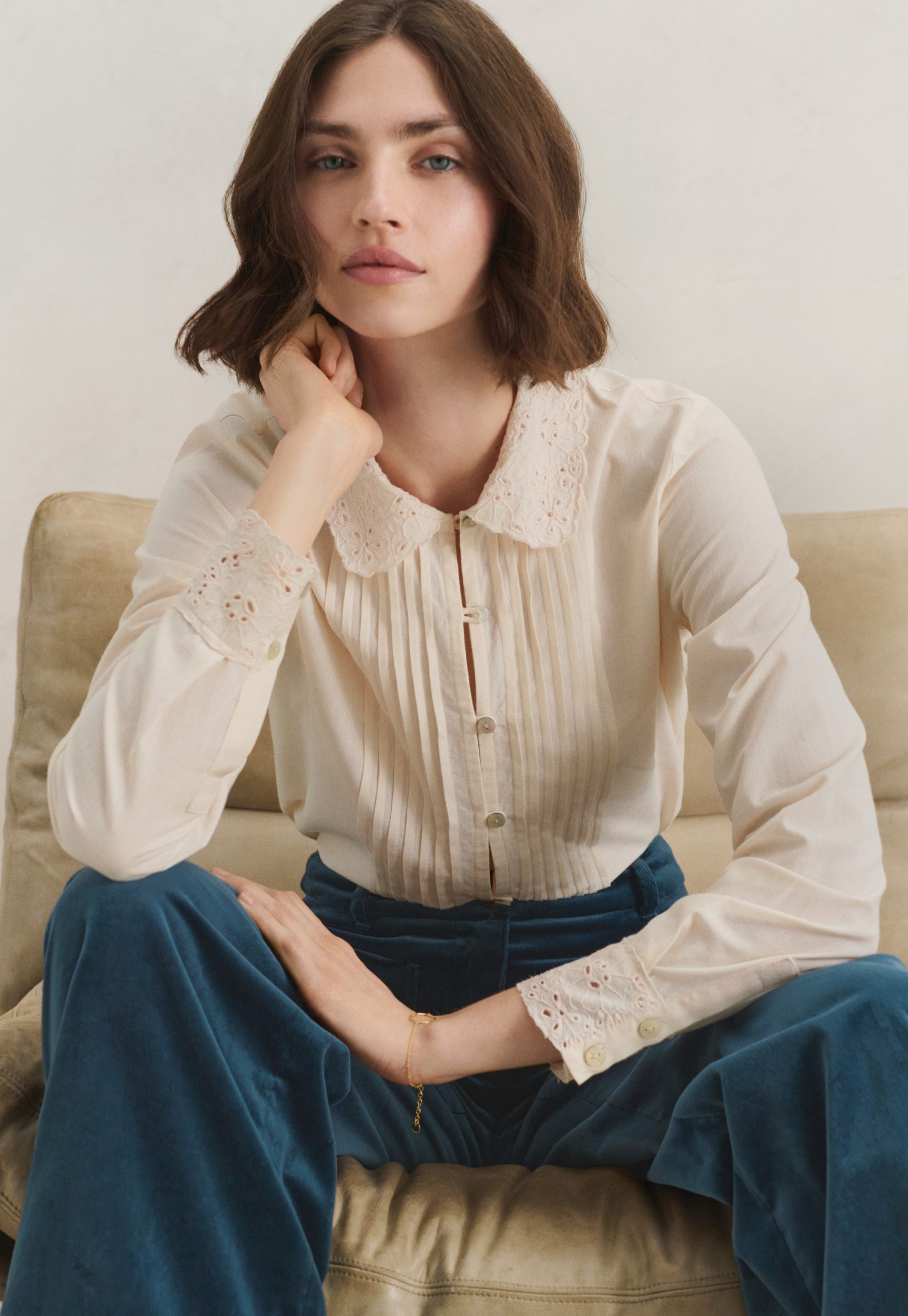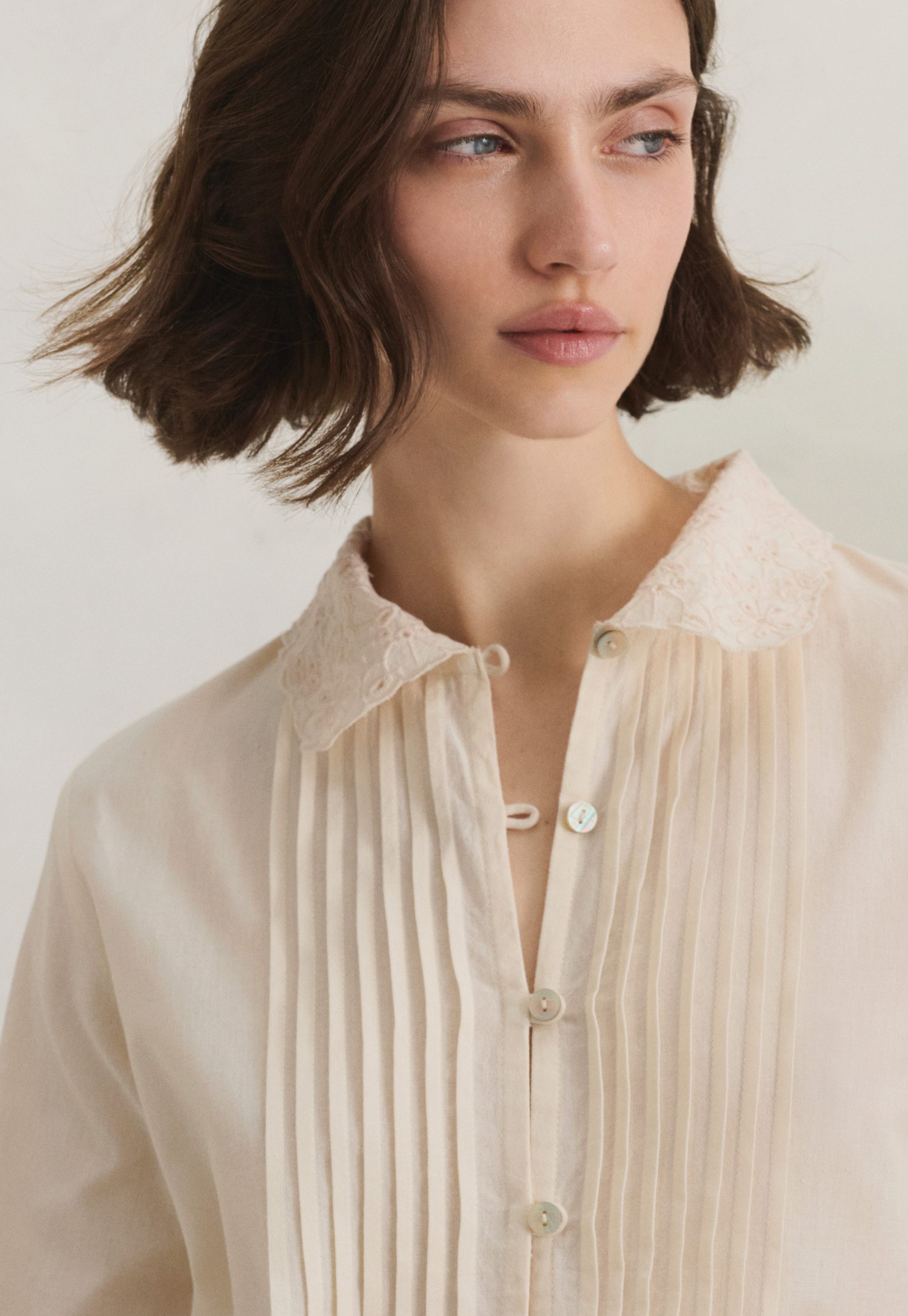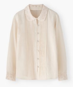 - Embroidery cutwork at cuffs