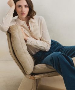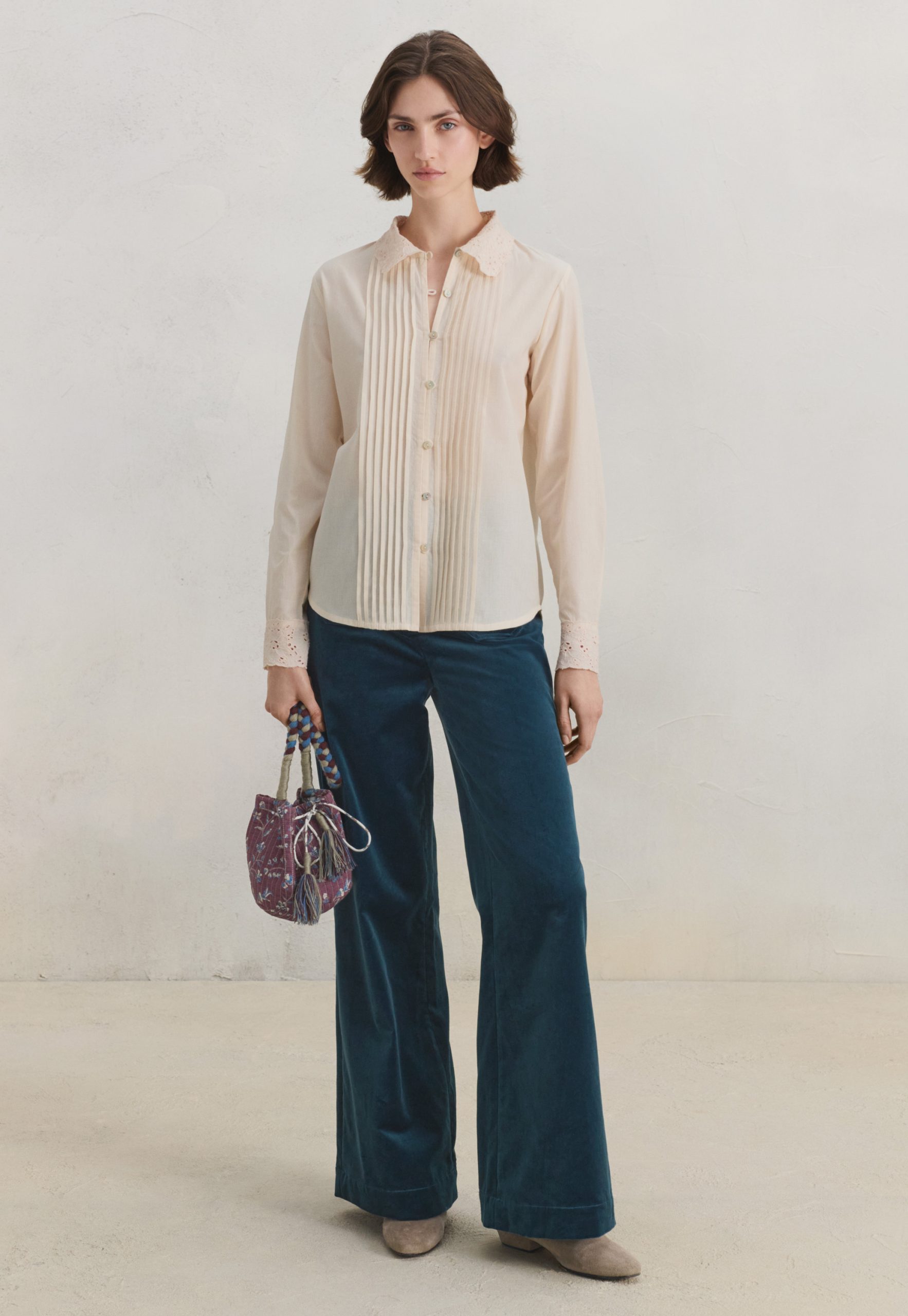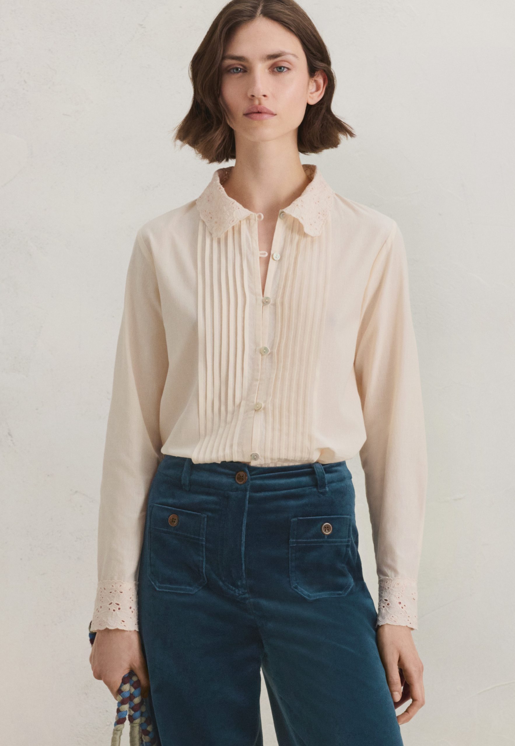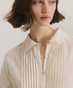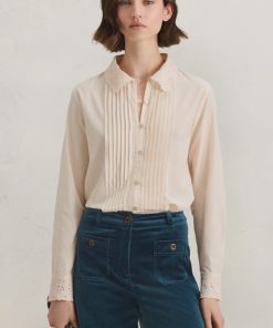 The embroidered collar and cutwork cuffs of this soft chambray cotton blouse are beautifully detailed as is the pintuck detail that runs from collar to hem. Whether worn on its own or under a sweater to reveal the collar, it’s a blouse with form and function.