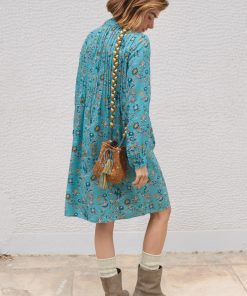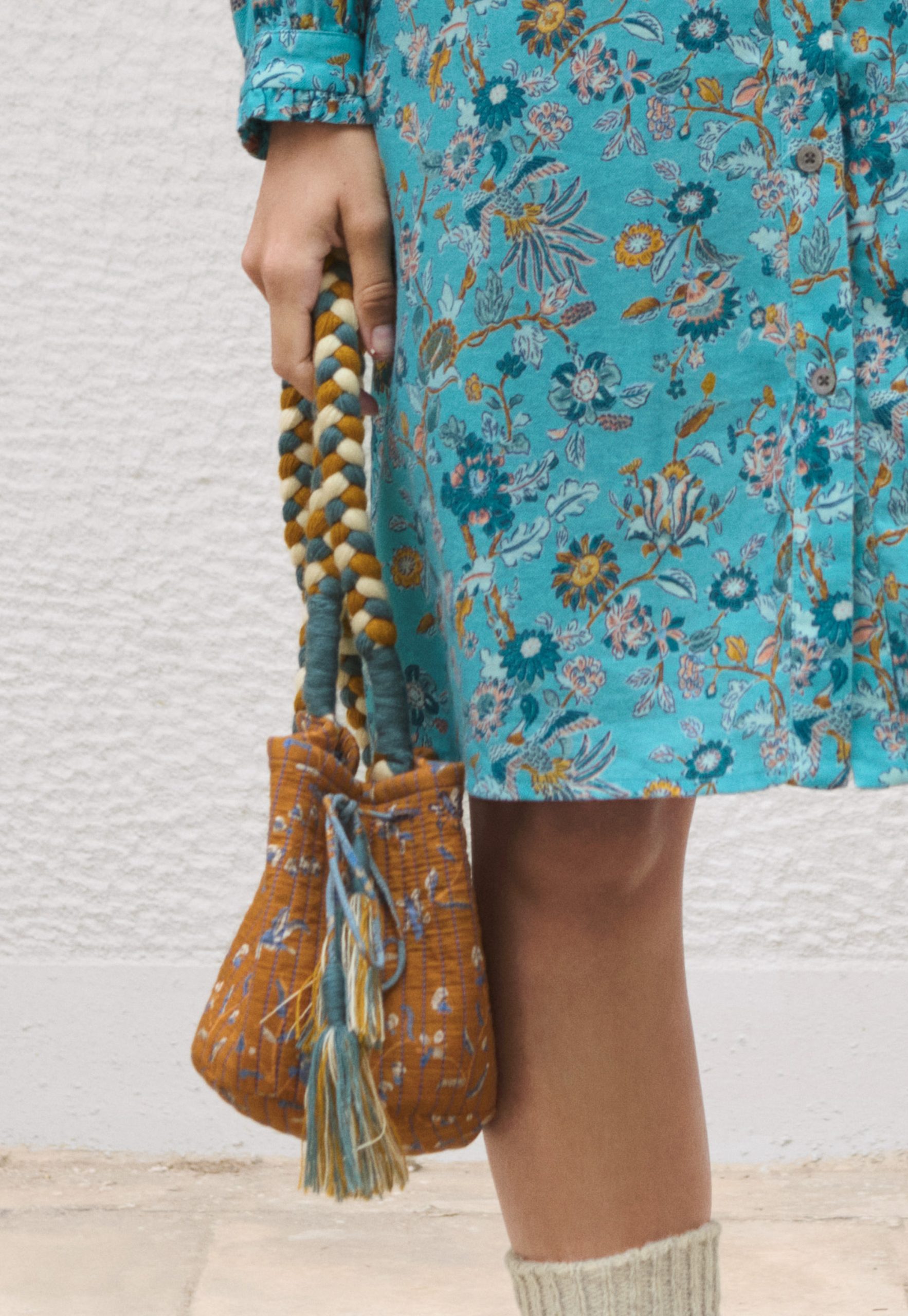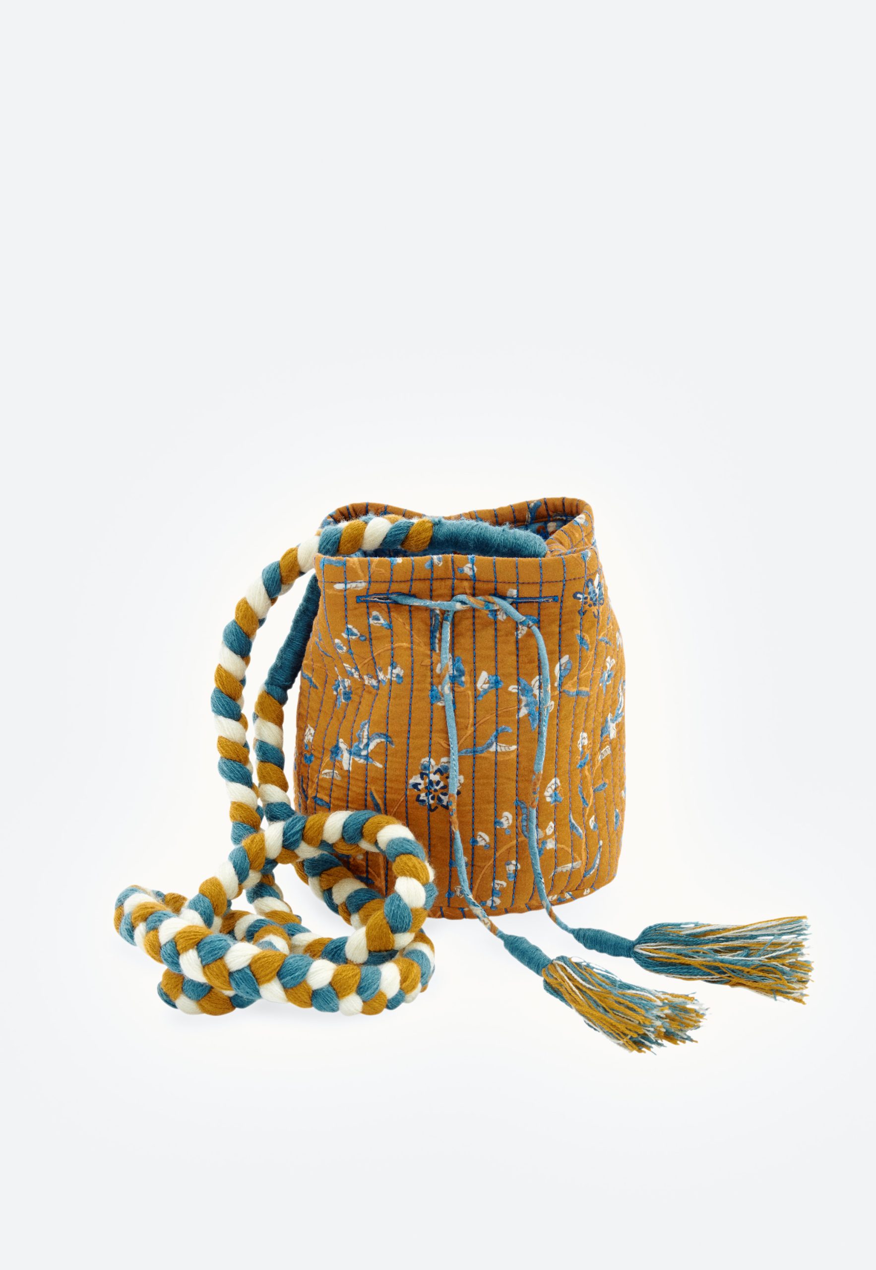 A useful and attractive lightweight quilted cotton bag featuring an exclusive Wrap London print, plaited cross-body strap, and a tasselled drawstring closure.