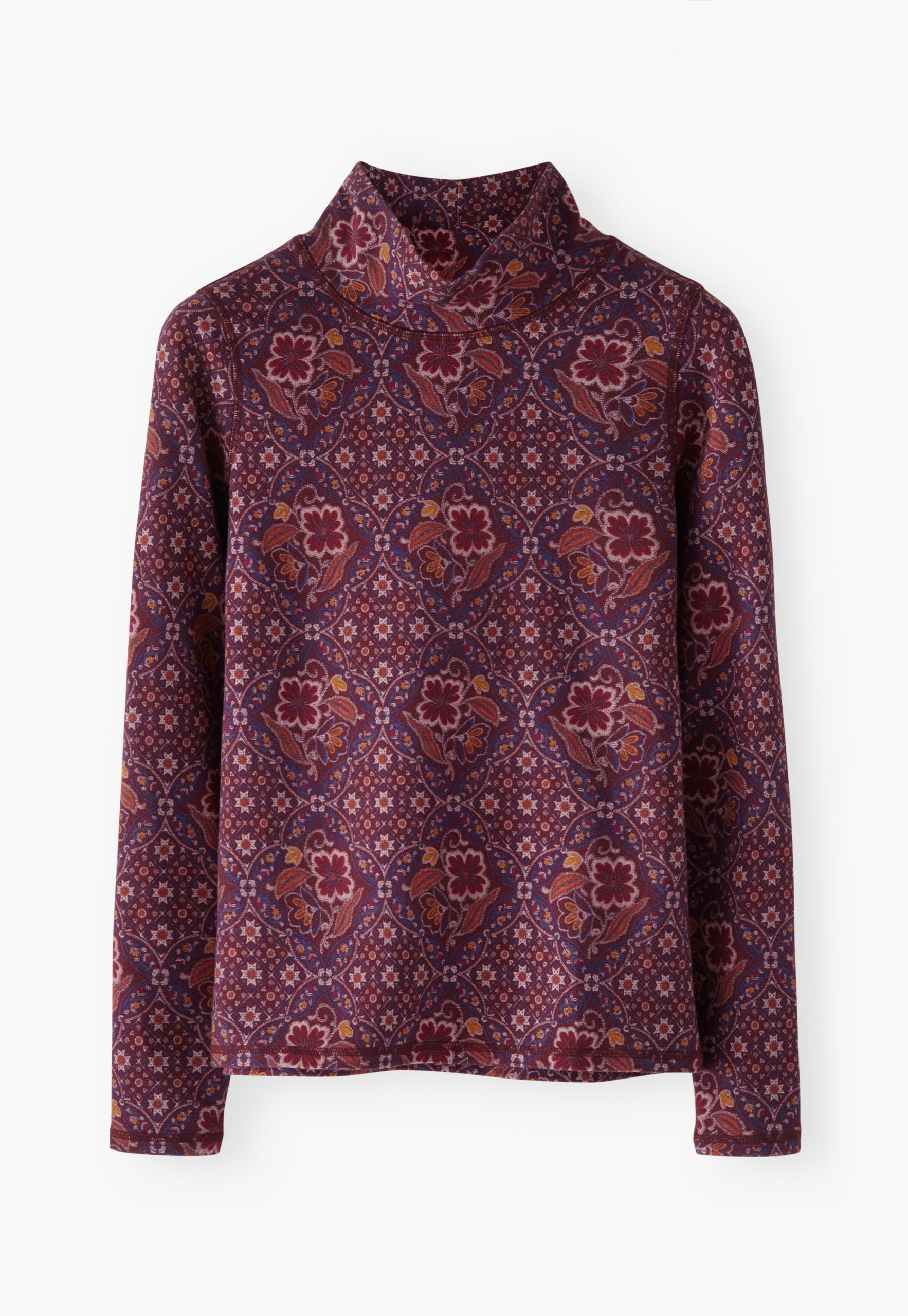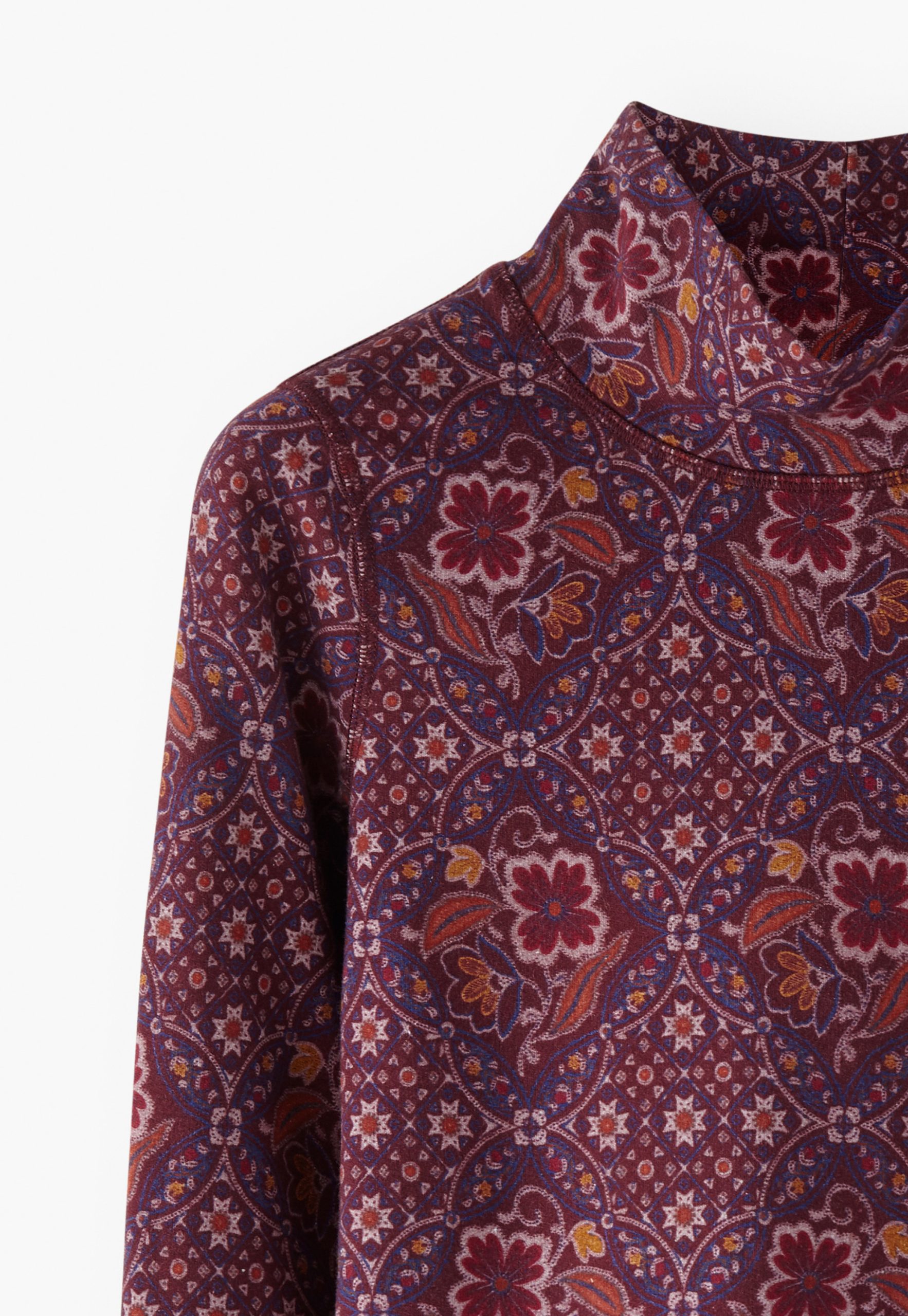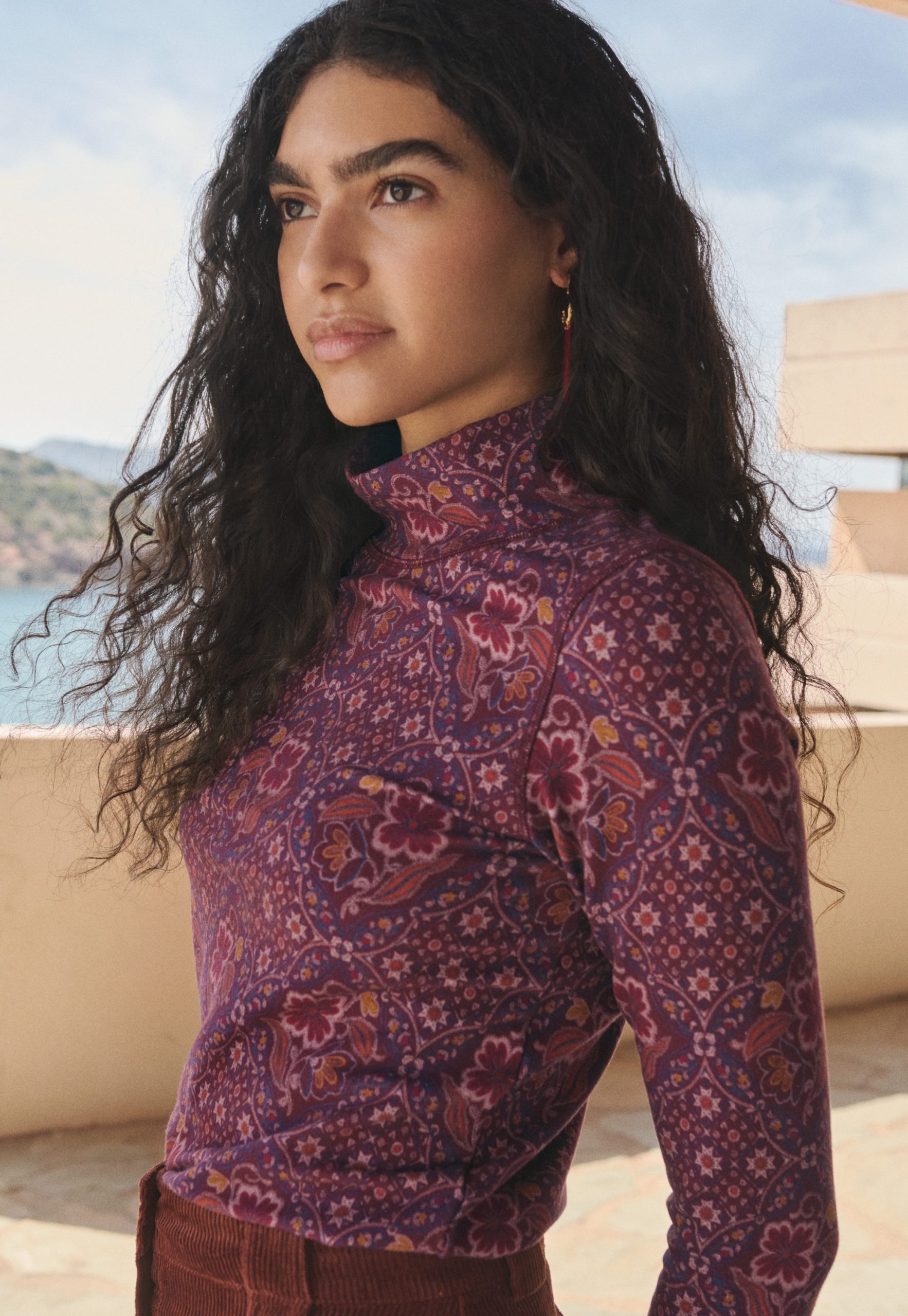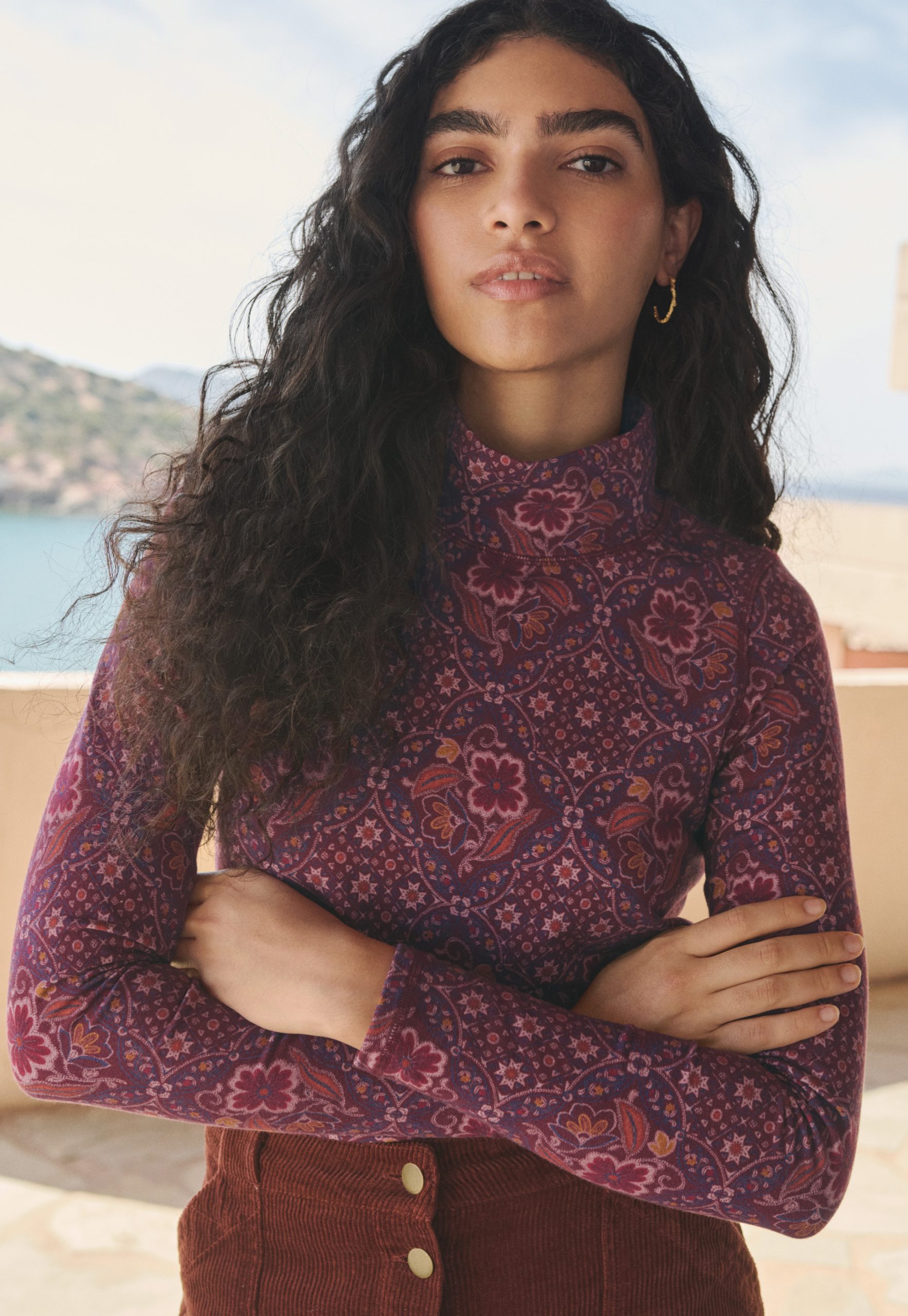 A fabulous top in soft and smooth hemp and organic cotton jersey. Slim-fit with a funnel neck, it features an intricately detailed exclusive Wrap London print.