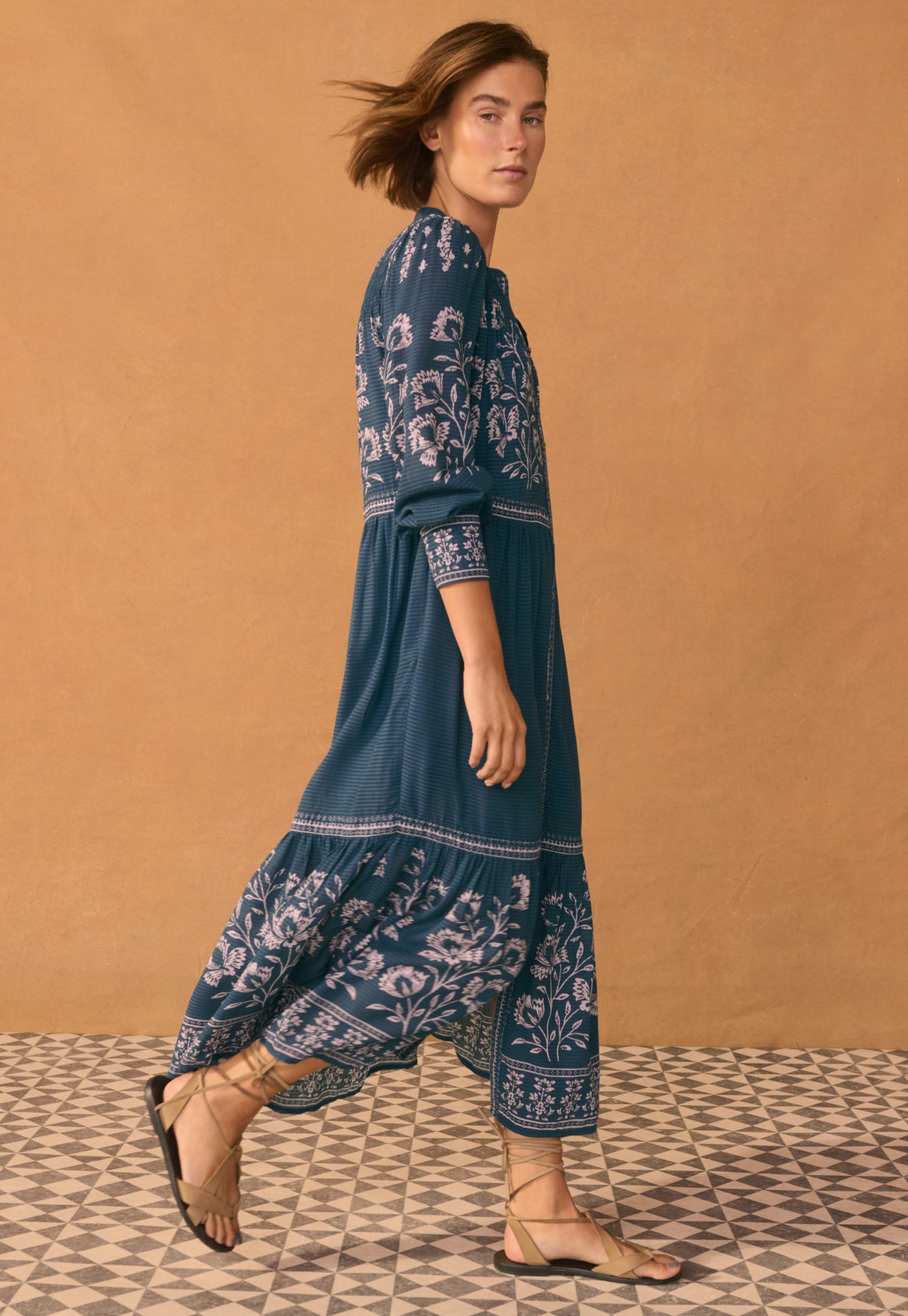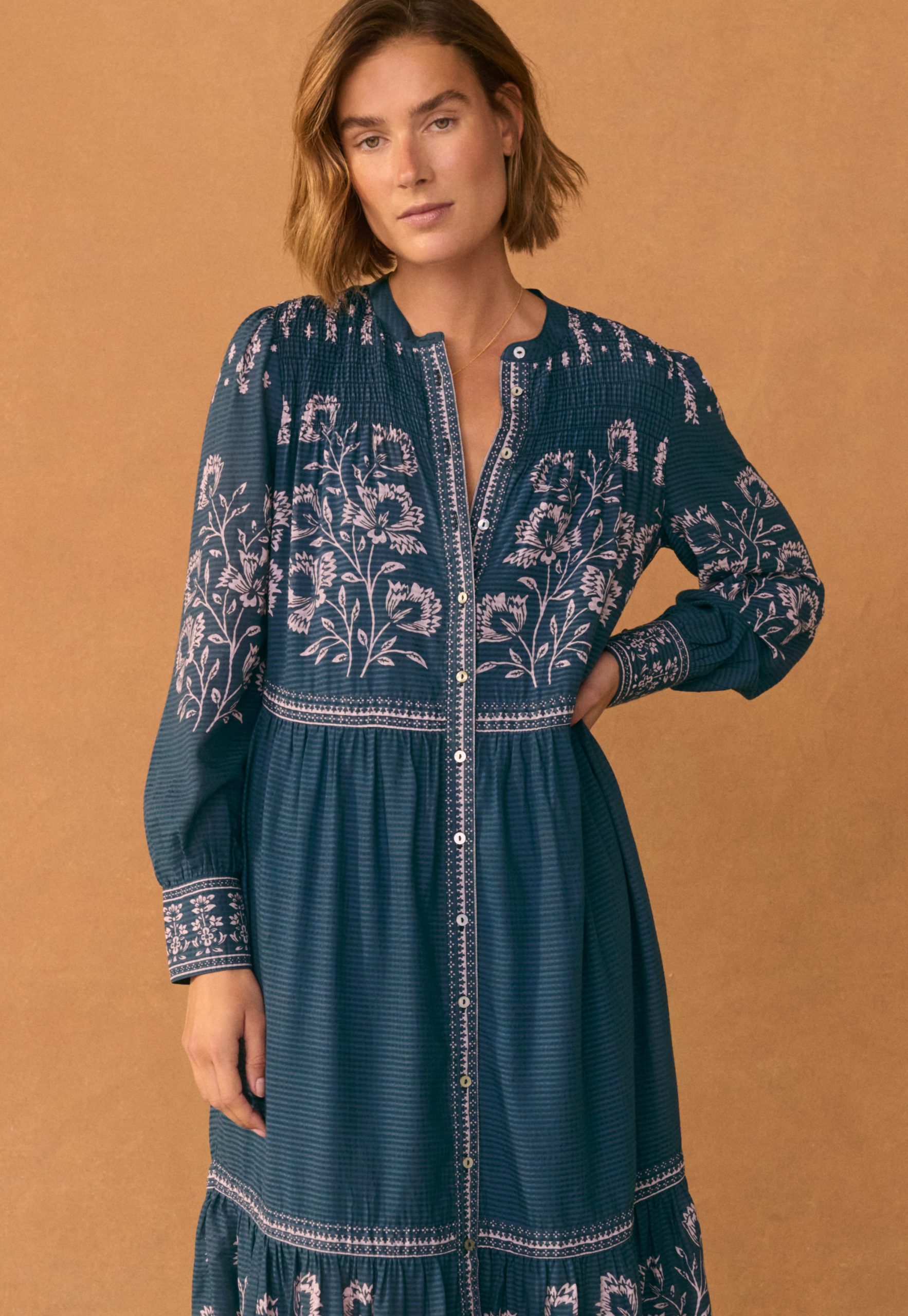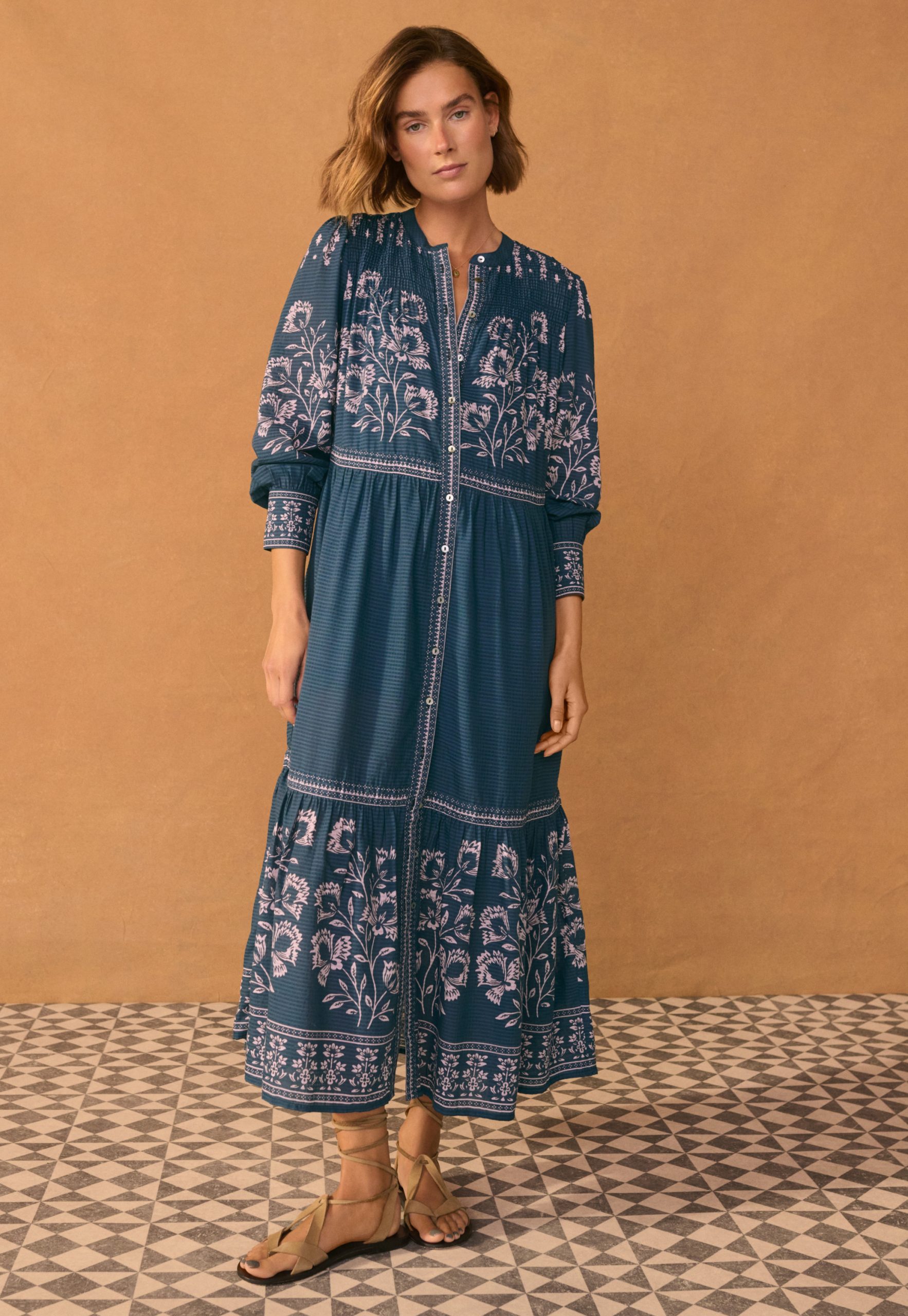 A relaxed, fluid dress that’s ready to be your new favourite outfit. In a lightweight cotton and modal blend with a subtle stripe overprinted with an exclusive Wrap London floral pattern. With full-length blouson sleeves, special shirring details at the front and back yoke and a dramatic deep hem.