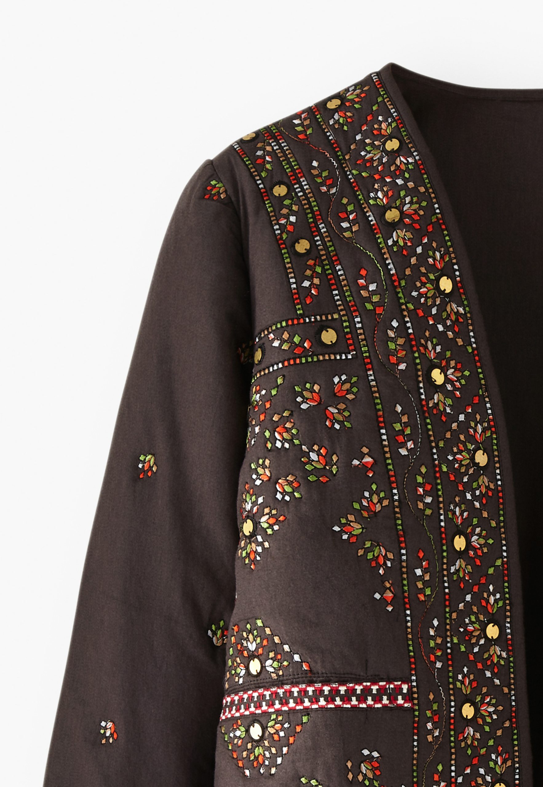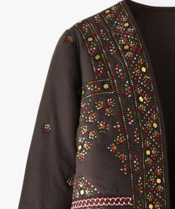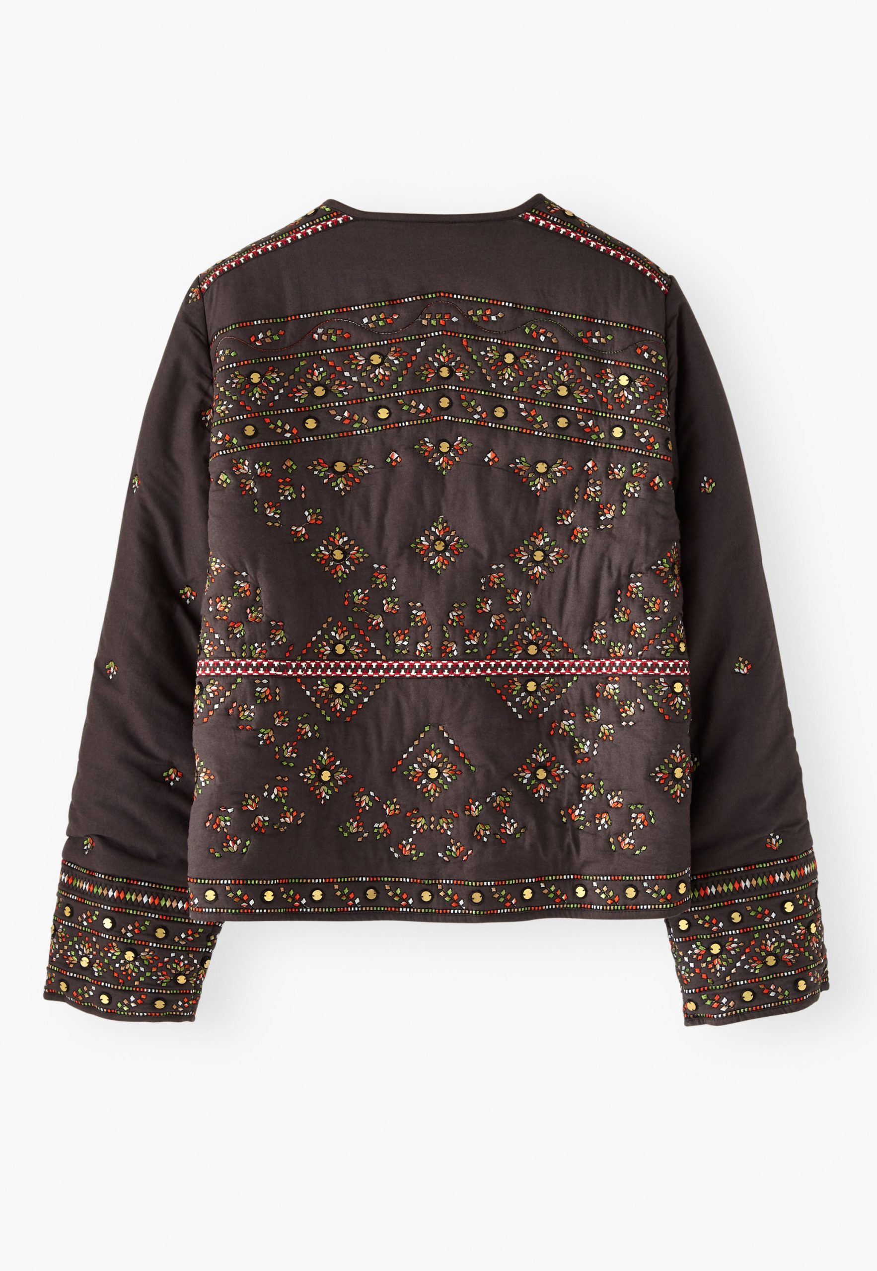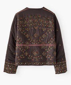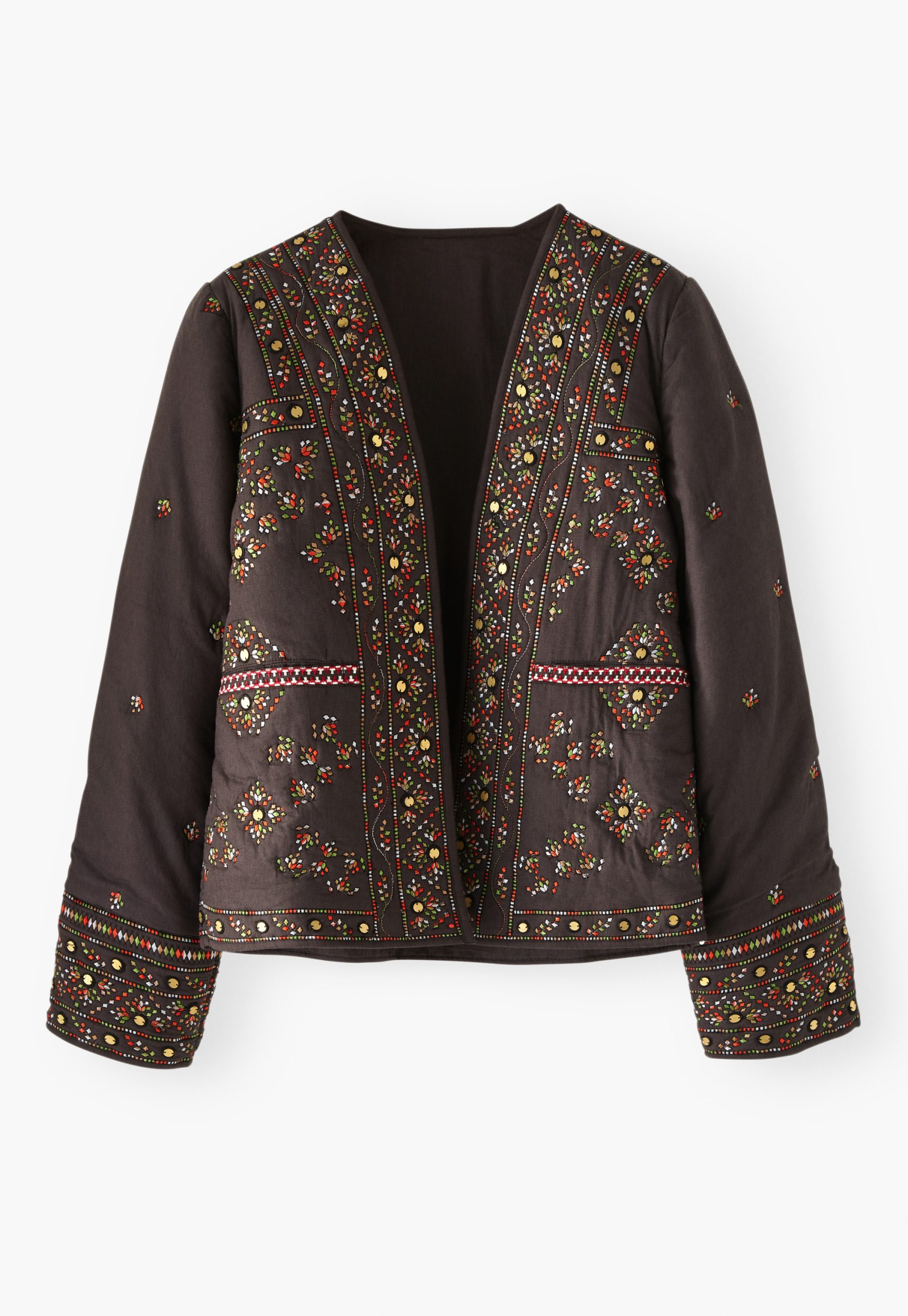 A fabulous finishing touch to your outfit, this softly quilted jacket is incredibly detailed with all-over embroidery to catch the eye and metal sequins to catch the light. In a regular fit with edge-to-edge styling, it even has hidden pockets at the front. Fully lined.