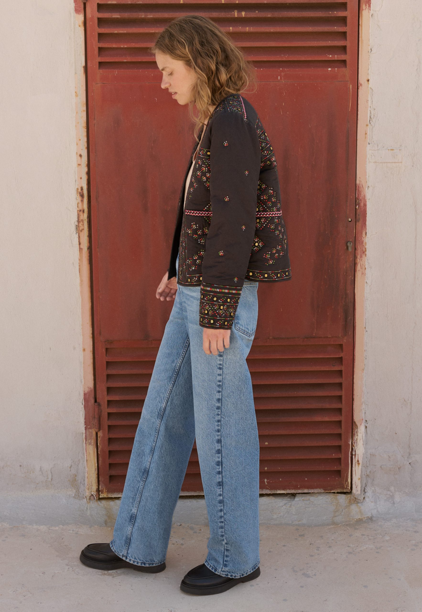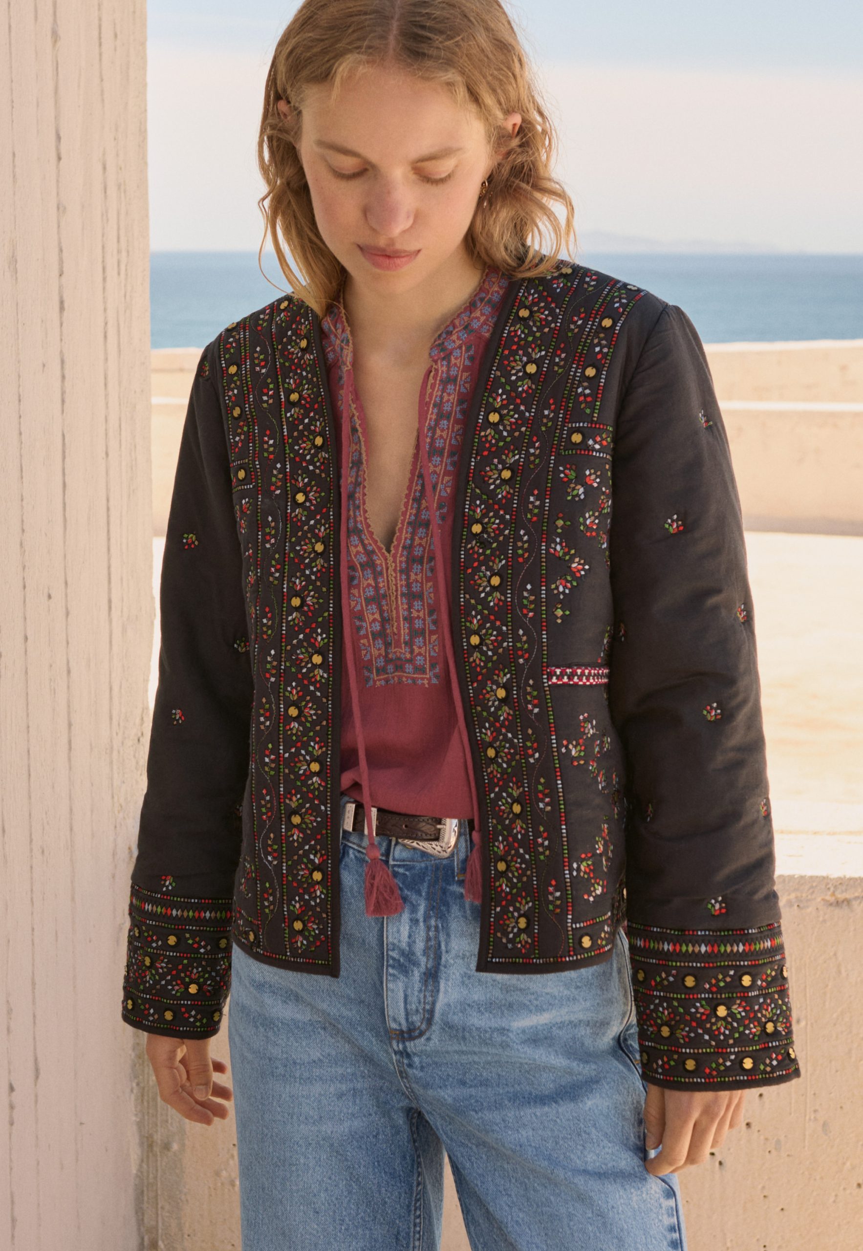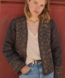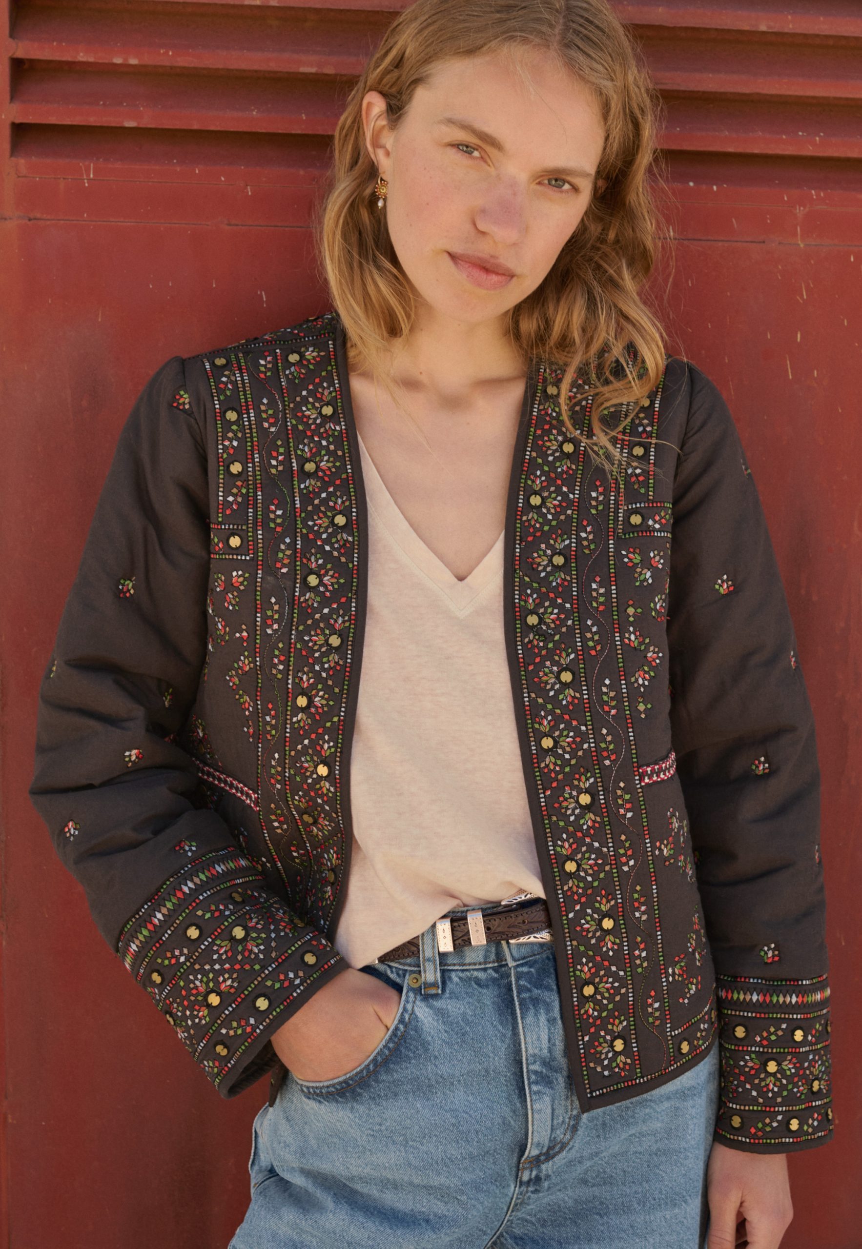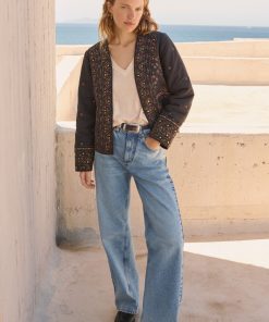 A fabulous finishing touch to your outfit, this softly quilted jacket is incredibly detailed with all-over embroidery to catch the eye and metal sequins to catch the light. In a regular fit with edge-to-edge styling, it even has hidden pockets at the front. Fully lined.