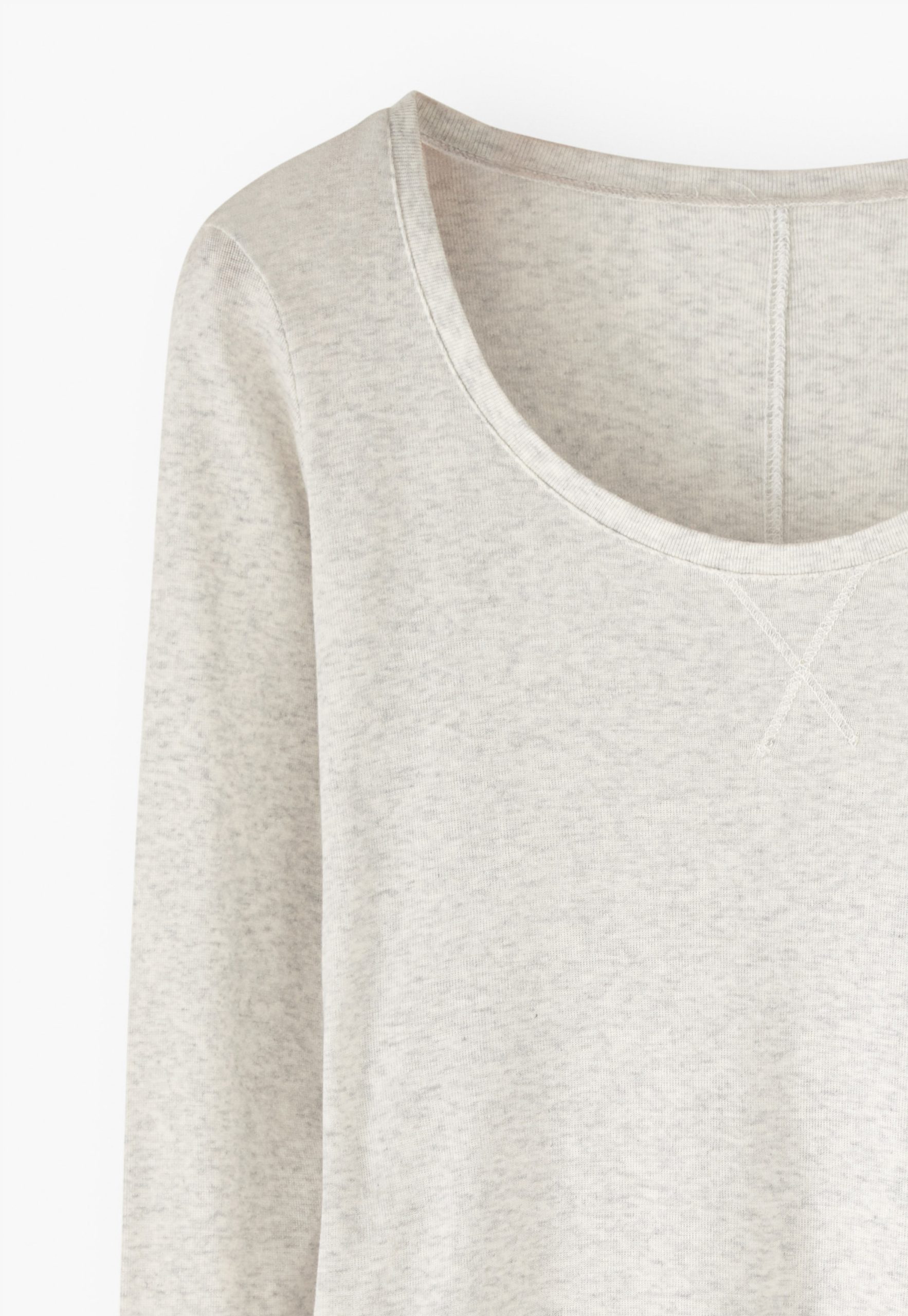 Neat-fitting, skinny knit with a lower neckline so it can be hidden under sweaters, or wear half-tuck with jeans and the curved hem on show.