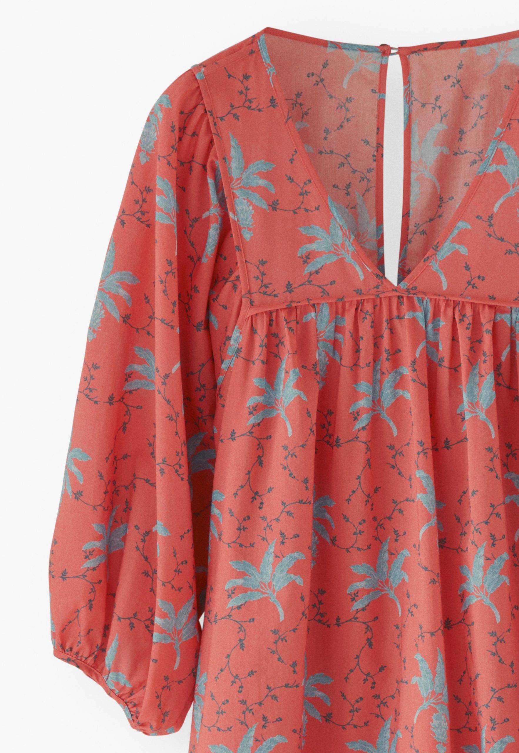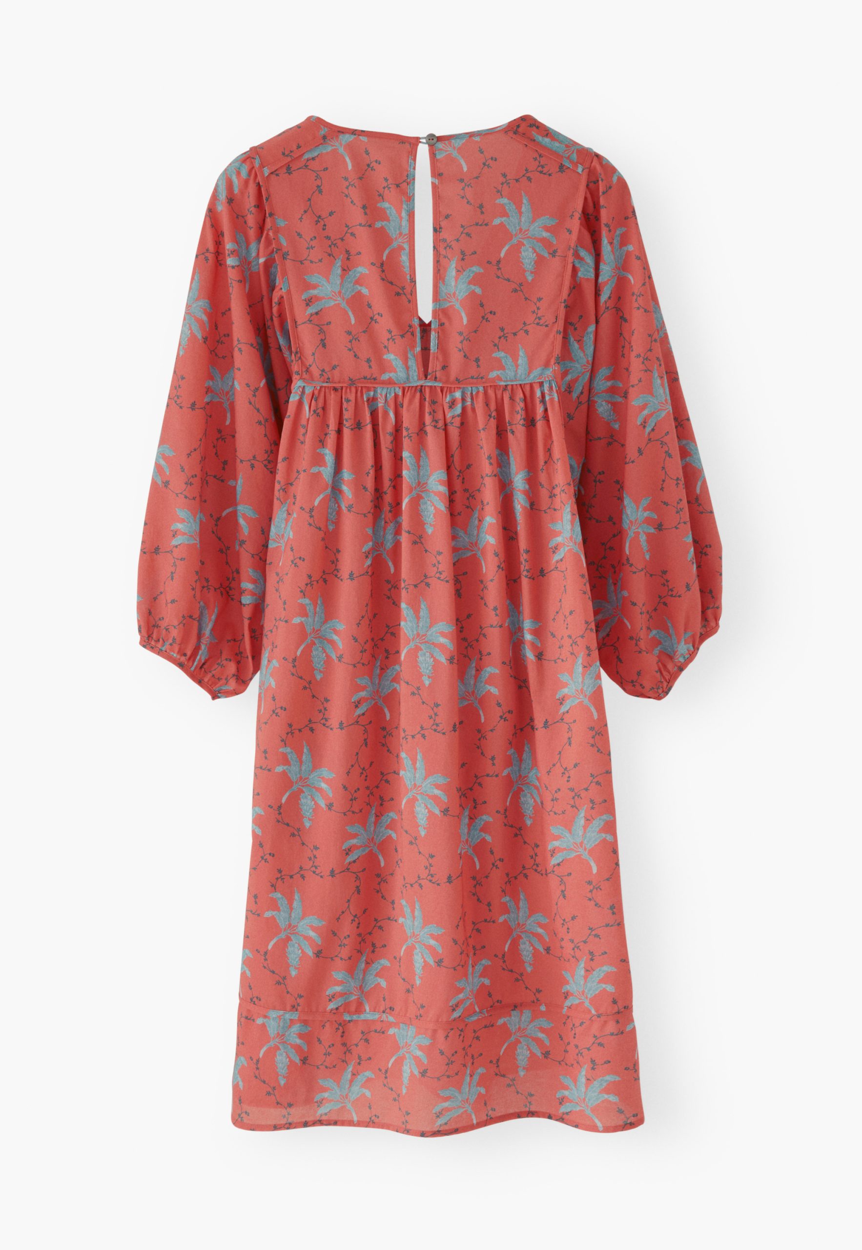 Add a pop of colour to your summer wardrobe with this beautiful soft red cotton dress featuring an exclusive Wrap London botanical print. With a V-neck, blouson sleeves and a neat opening at the back, it finishes just over the knee.