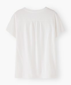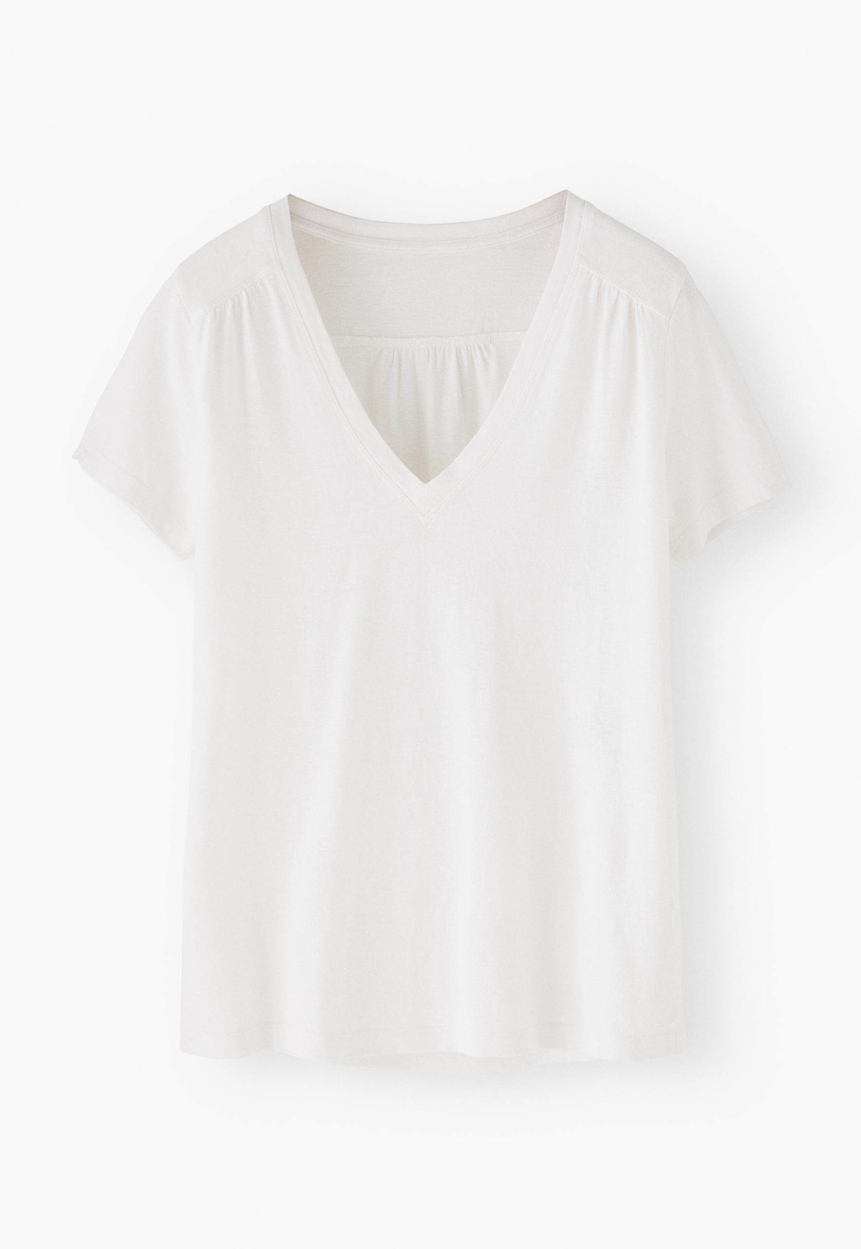 A relaxed v-neck T-shirt in soft and drapey hemp and organic cotton jersey, that makes it easy to show off a favourite necklace. Gentle gathers at the shoulders and back elevate this from the ordinary, and the short sleeves have a neat split detail.
