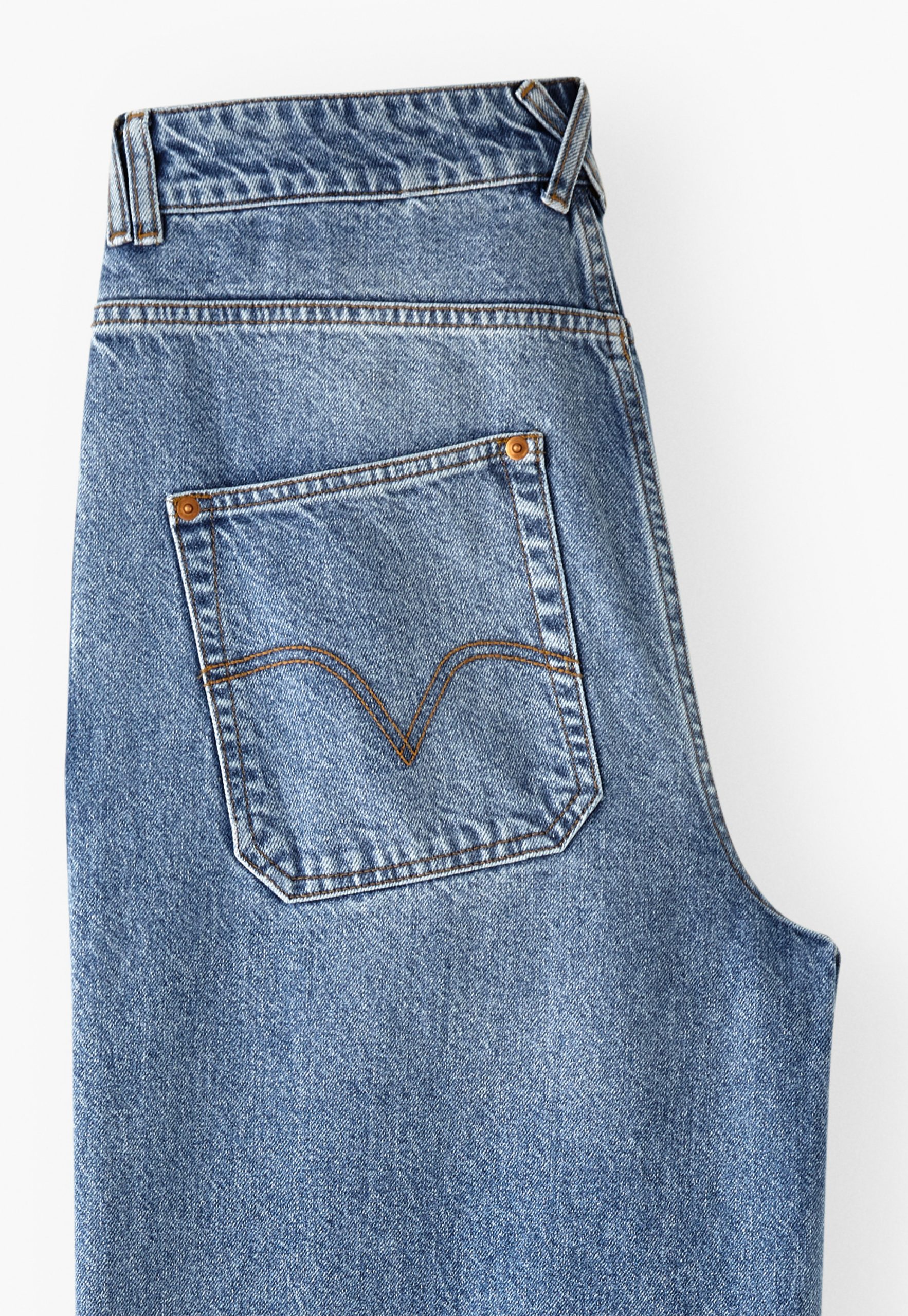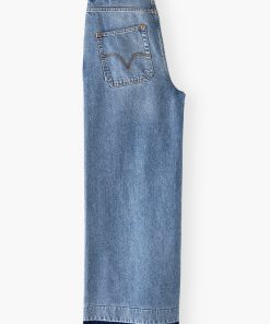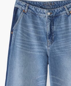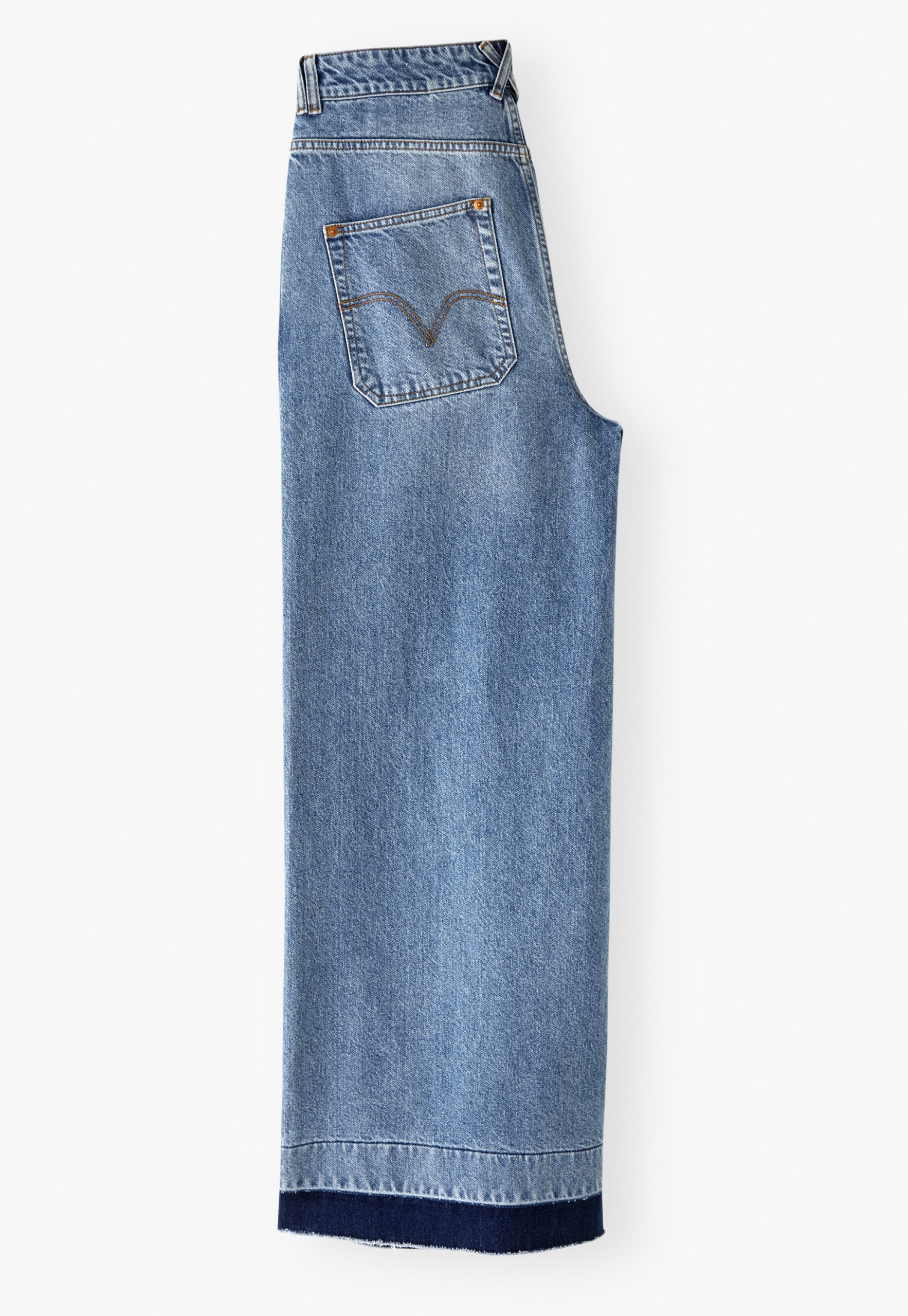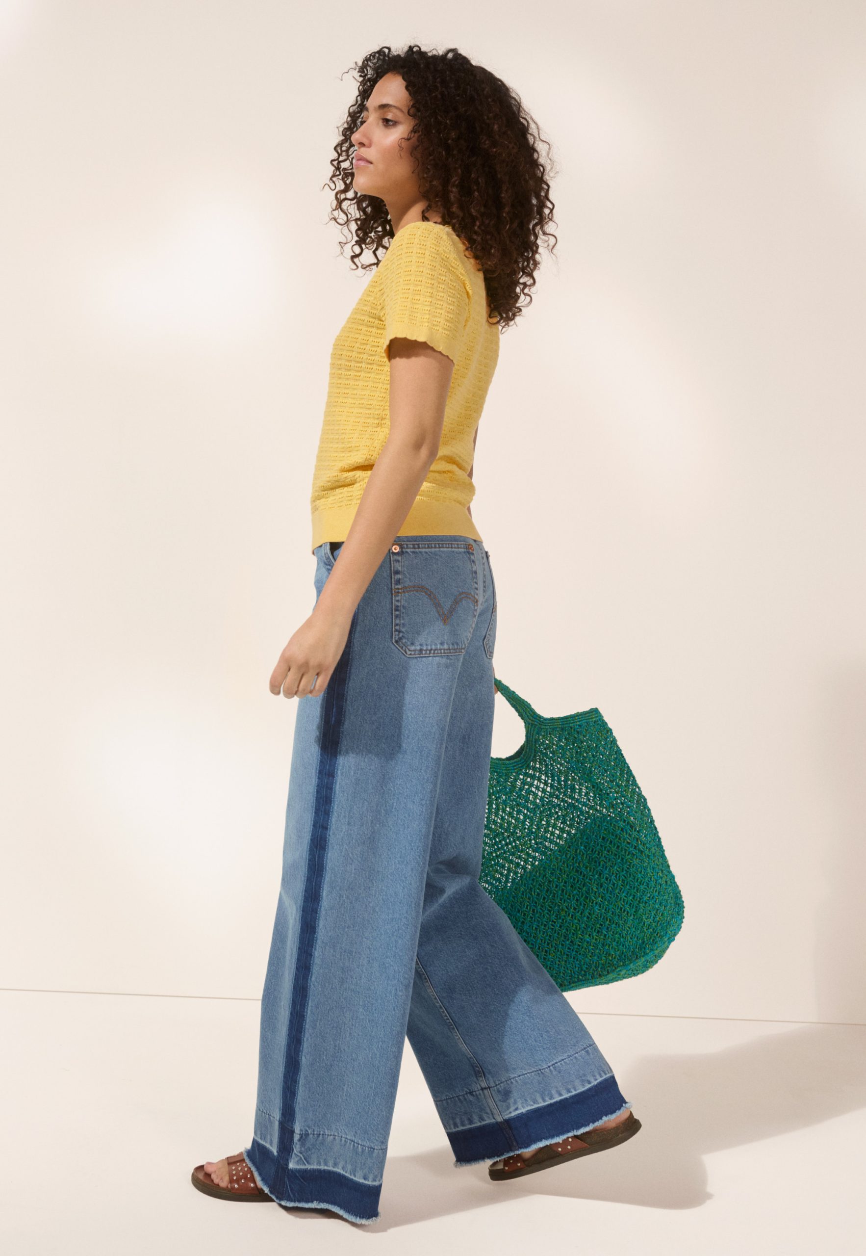A new cut for your jeans collection in reassuringly rigid blue denim. High-waisted and wide-legged, they’ve got a cool stripe along the side seam and a let-down hem that finishes with a raw edge.