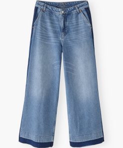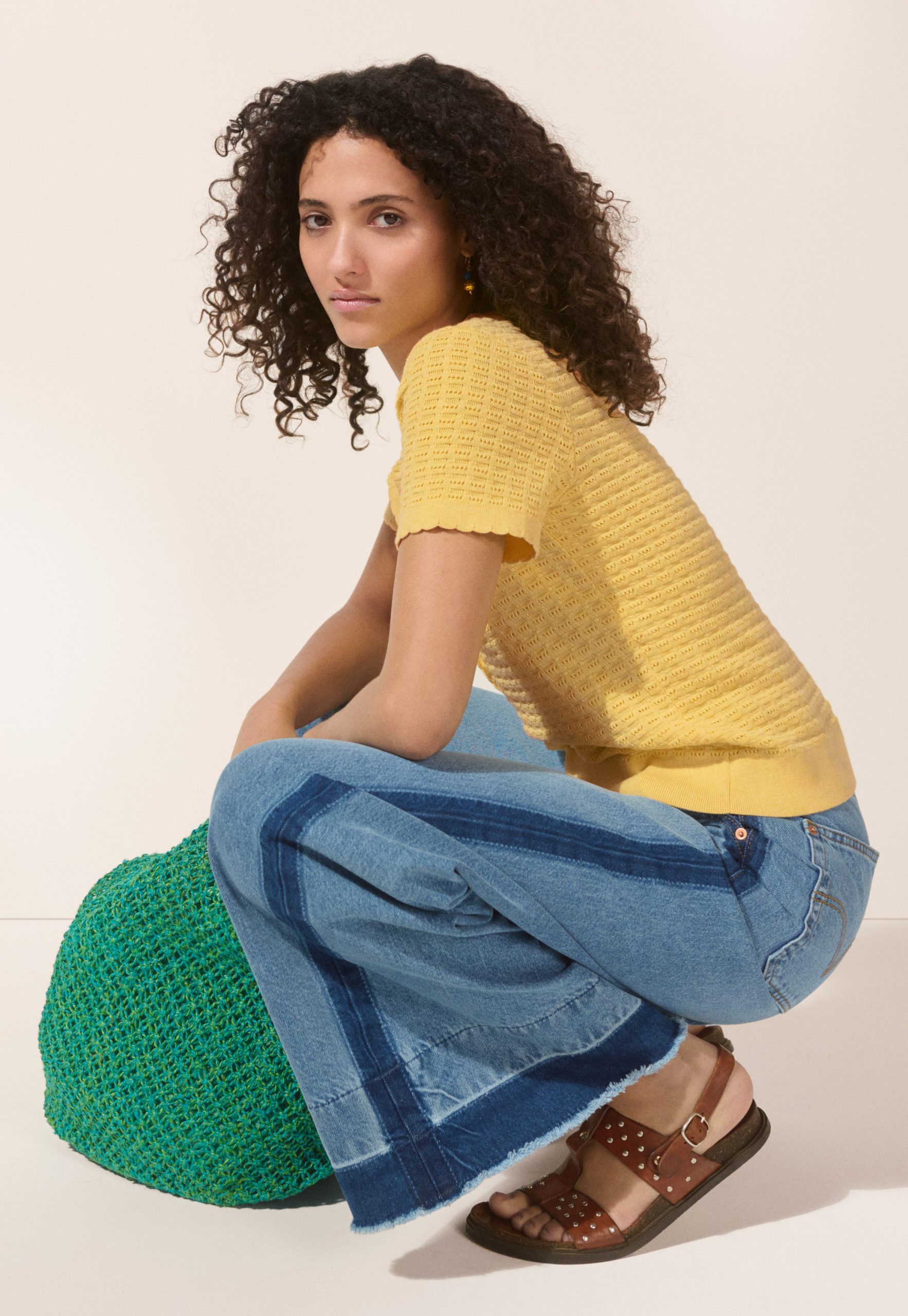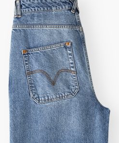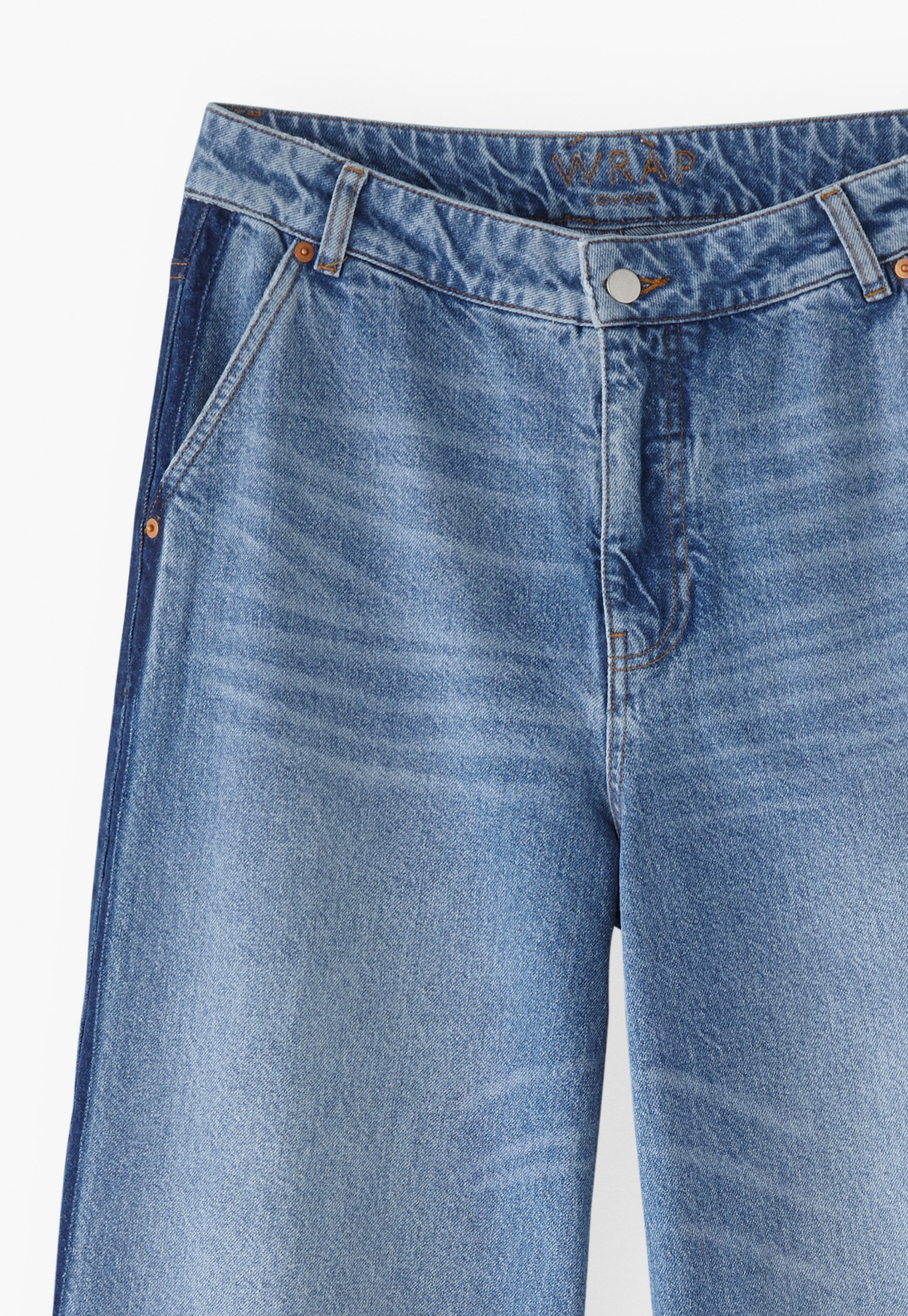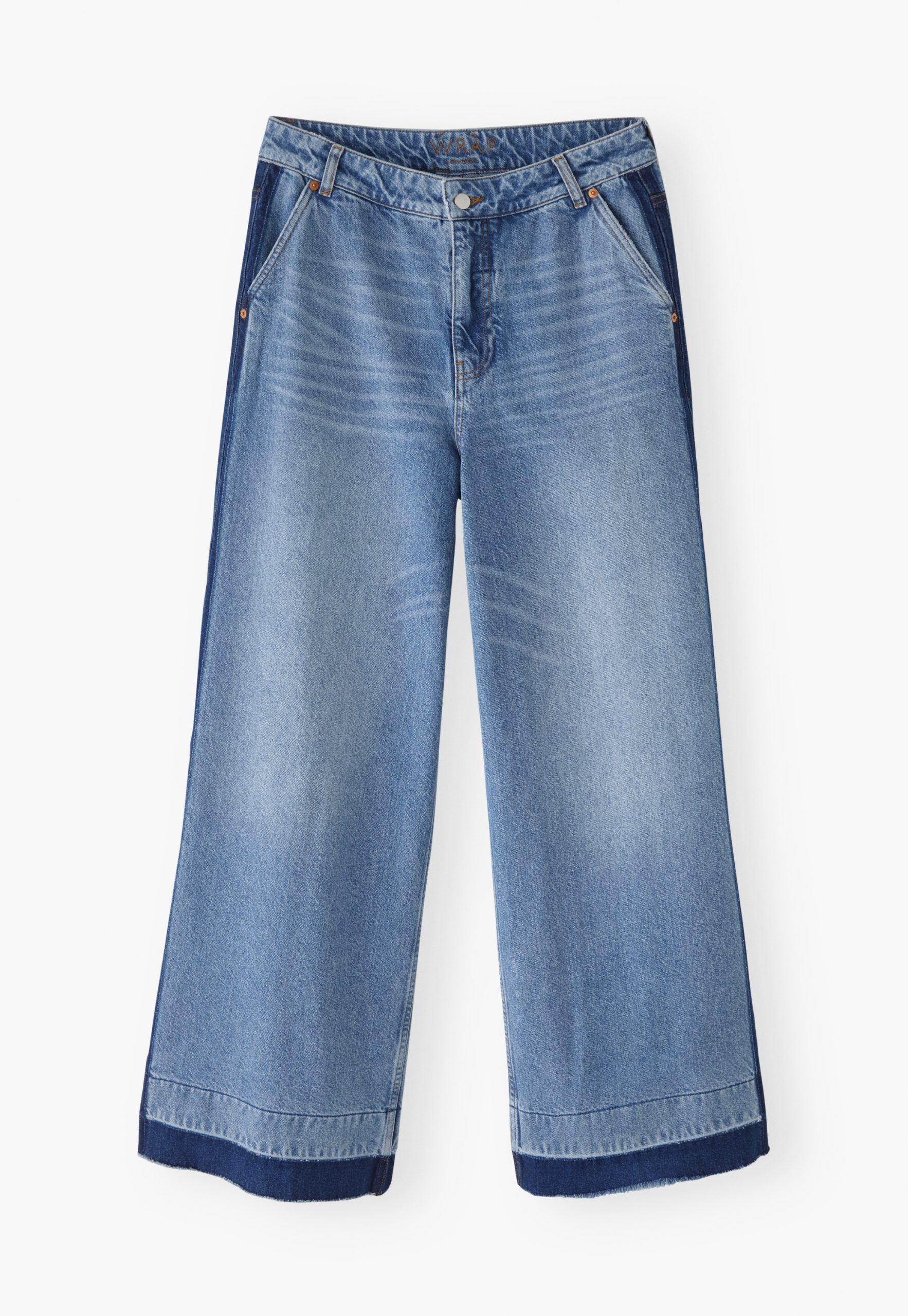 A new cut for your jeans collection in reassuringly rigid blue denim. High-waisted and wide-legged, they’ve got a cool stripe along the side seam and a let-down hem that finishes with a raw edge.