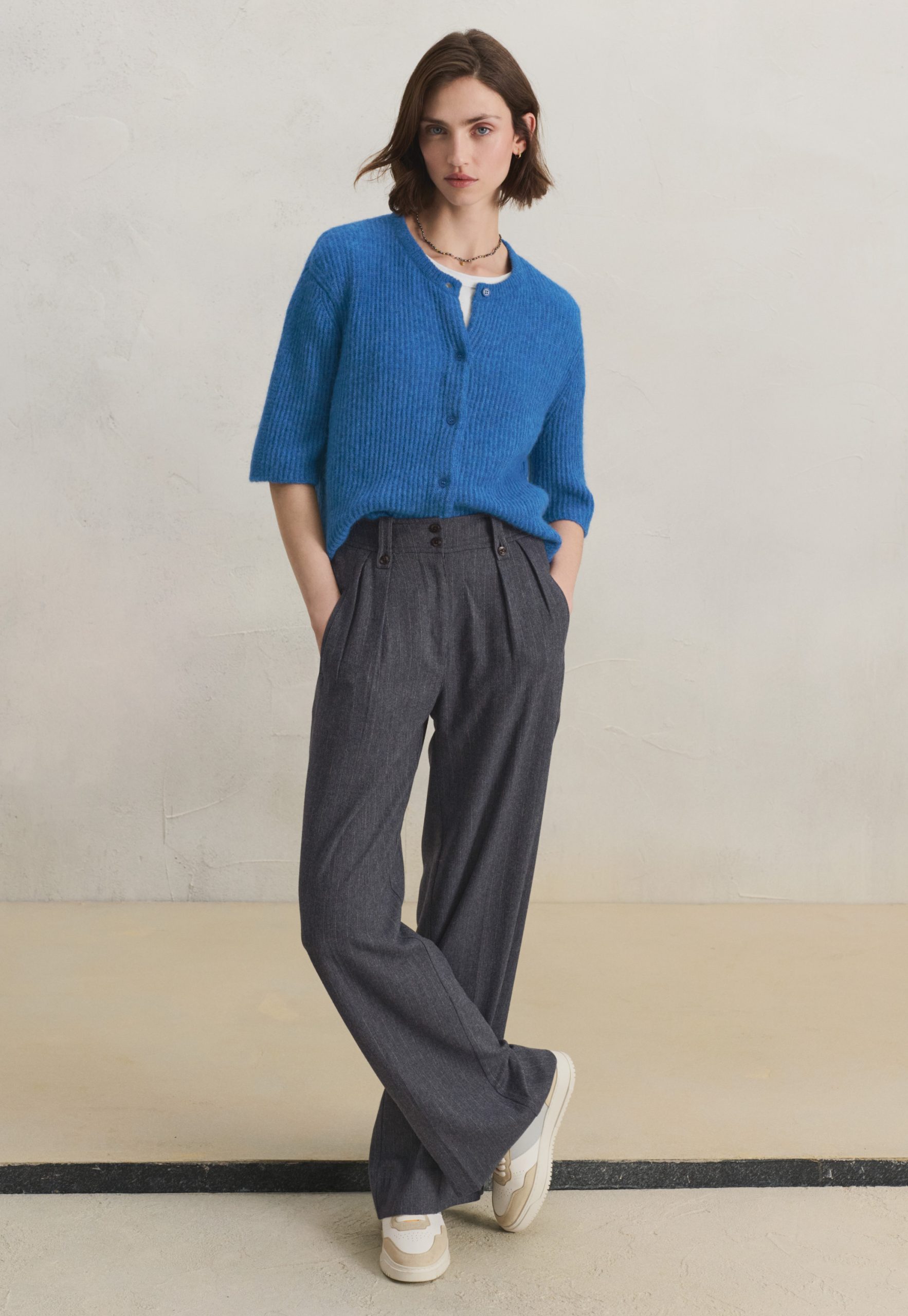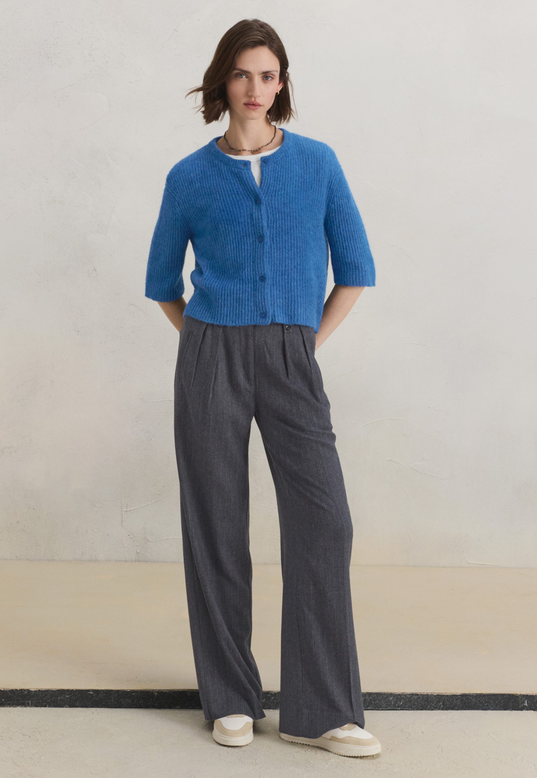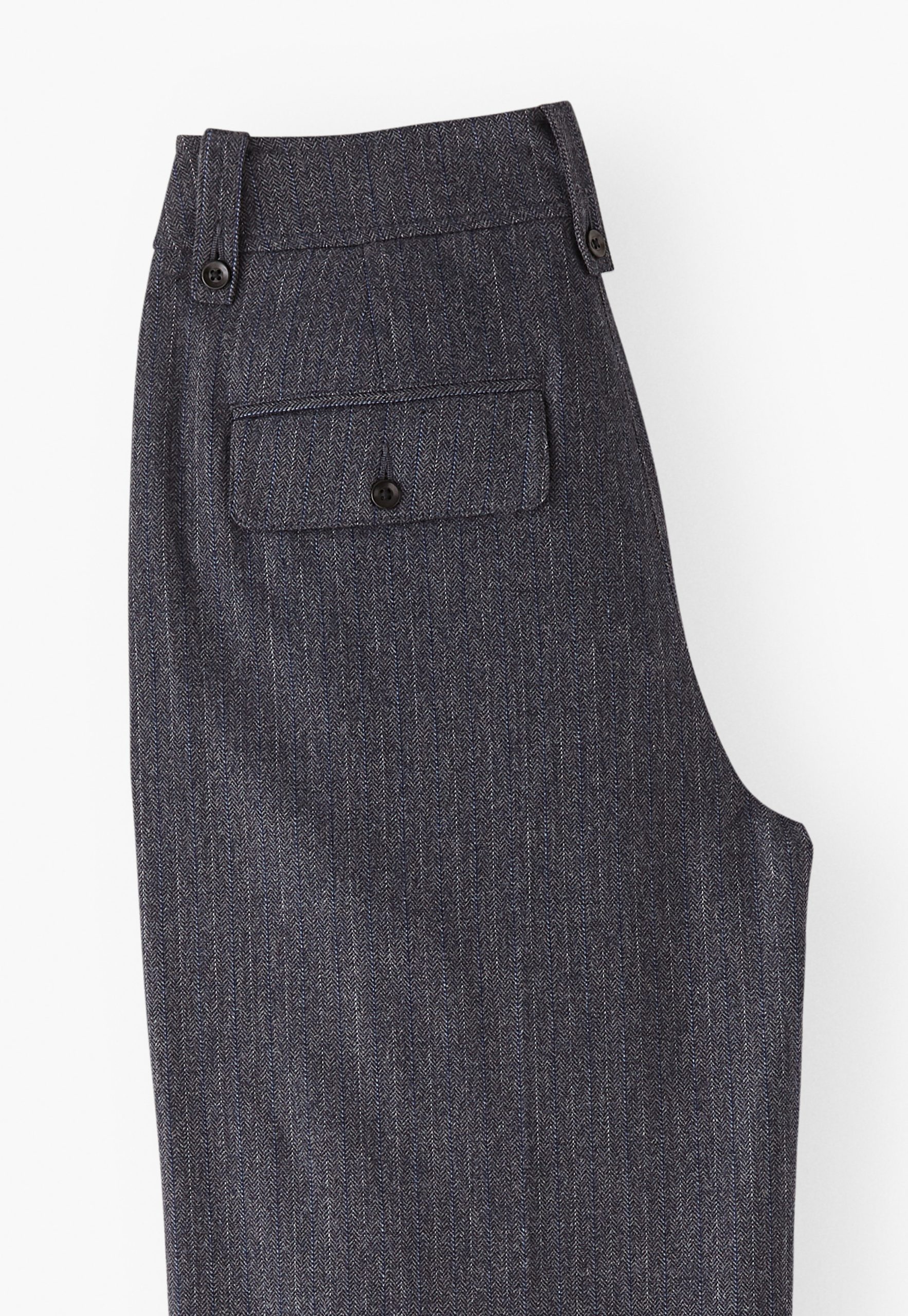 Wonderful wide-leg trousers in a wool and viscose herringbone weave with a subtle fine stripe. Tailored with pressed creases and inverted pleats from the waistband you can wear solo, Annie Hall style, or add the matching blazer to create a suit.